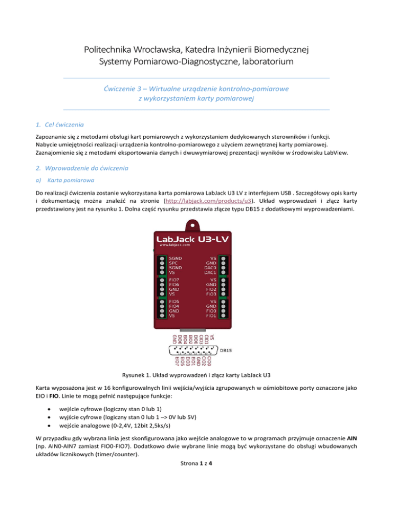 Politechnika Wrocławska, Katedra Inżynierii Biomedycznej Systemy Pomiarowo-Diagnostyczne, laboratorium Ćwiczenie 3 – Wirtualne urządzenie kontrolno-pomiarowe z wykorzystaniem karty pomiarowej 1. Cel ćwiczenia Zapoznanie się z metodami obsługi kart pomiarowych z wykorzystaniem dedykowanych sterowników i funkcji. Nabycie umiejętności realizacji urządzenia kontrolno-pomiarowego z użyciem zewnętrznej karty pomiarowej. Zaznajomienie się z metodami eksportowania danych i dwuwymiarowej prezentacji wyników w środowisku LabView. 2. Wprowadzenie do ćwiczenia a) Karta pomiarowa Do realizacji ćwiczenia zostanie wykorzystana karta pomiarowa LabJack U3 LV z interfejsem USB . Szczegółowy opis karty i dokumentację można znaleźć na stronie (http://labjack.com/products/u3). Układ wyprowadzeń i złącz karty przedstawiony jest na rysunku 1. Dolna część rysunku przedstawia złącze typu DB15 z dodatkowymi wyprowadzeniami. Rysunek 1. Układ wyprowadzeń i złącz karty LabJack U3 Karta wyposażona jest w 16 konfigurowalnych linii wejścia/wyjścia zgrupowanych w ośmiobitowe porty oznaczone jako EIO i FIO. Linie te mogą pełnić następujące funkcje: wejście cyfrowe (logiczny stan 0 lub 1) wyjście cyfrowe (logiczny stan 0 lub 1 –> 0V lub 5V) wejście analogowe (0-2,4V, 12bit 2,5ks/s) W przypadku gdy wybrana linia jest skonfigurowana jako wejście analogowe to w programach przyjmuje oznaczenie AIN (np. AIN0-AIN7 zamiast FIO0-FIO7). Dodatkowo dwie wybrane linie mogą być wykorzystane do obsługi wbudowanych układów licznikowych (timer/counter). Strona 1 z 4 Linie oznaczone jako GND mają taki sam potencjał jak linia GND portu USB który jest wykorzystany do zasilania karty pomiarowej. Jest to potencjał odniesienia (0V) dla wejść analogowych pracujących w trybie niesymetrycznym (singleended). Linia SGND jest dodatkowo zabezpieczona bezpiecznikiem samoresetującym i powinna być wykorzystywana w przypadku podłączania dodatkowych układów wyposażanych w zewnętrzne źródło zasilania. Linie VS są wykorzystywane jako linie zasilające. Posiadają one taki sam potencjał jak linia zasilania portu USB (ok. 5V). Karta wyposażona jest też w dwa wyjścia analogowe (DAC0 i DAC1). Typowy zakres pracy tych wyjść to 0,04V – 4,95V (zależne od napięcia zasilania), rozdzielczość przetwornika wynosi 10 bit. b) Instalacja karty pomiarowej Pakiet oprogramowania i sterowników do kart LabJack dostępny jest na stronie internetowej producenta (https://labjack.com/support/software/installers). W przypadku komputerów stacjonarnych dostępnych w sali laboratoryjnej oprogramowanie to jest już zainstalowane. Przed rozpoczęciem pracy z kartą należy sprawdzić poprawność działania karty na stanowisku korzystając z oprogramowania konfiguracyjno-diagnostycznego: Control Panel Application (LJControlPanel). Po uruchomieniu aplikacji karta powinna być widoczna w liście urządzeń serii U3 wraz z przypisanym numerem identyfikacyjnym (typowo: 1). Przykładowy wygląd aplikacji po odnalezieniu karty pomiarowej przedstawia rysunek 2. Rysunek 2. Aplikacja konfiguracyjno-diagnostyczna kart LabJack Aplikacja LJControlPanel umożliwia także testowanie poprawności działania wejść i wyjść karty (opcja Test). Zaleca się weryfikację poprawności działania karty i oprogramowania na początku zajęć poprzez ustawienie stanów wyjść cyfrowych i analogowych oraz pomiar ich napięcia przy użyciu multimetru. Po prawidłowej instalacji karty zielona dioda statusowa LED znajdująca się z boku obudowy powinna świecić się w sposób ciągły. c) Przykład obsługi karty pomiarowej Producent kart LabJack udostępnia biblioteki, funkcje/moduły oraz przykłady ich wykorzystania dla różnych języków programowania (m.in. C++, LabView, Python, Node.js, Matlab, Java, .Net, Agilent Vee). Przykłady dla środowiska LabView dostępne są pod adresem https://labjack.com/support/software/examples/ud/labview. Pakiet LabView_LJUD zawiera przykłady i podprogramy, które mogą być wykorzystane na zajęciach laboratoryjnych. Aby zapoznać się z metodami obsługi karty pomiarowej LabJack w środowisku LabView zaleca się przeanalizowanie przykładu U3 Multiple IO Example Loop (LabVIEW_LJUD\Examples\U3\U3 Multiple IO Example Loop.vi). Program ten prezentuje sposób konfigurowania karty oraz zapis i odczyt danych z wielu wyjść i wejść w jednym cyklu pracy pętli głównej programu. Może on stanowić punkt wyjścia do tworzenia własnej aplikacji zgodnej z założeniami ćwiczenia laboratoryjnego. Diagram przykładu bez pętli głównej programu zaprezentowany jest na rysunku 3. Można przeanalizować również inne przekłady zawierające pozostałe funkcje komunikacyjne przygotowane dla kart LabJack. W Strona 2 z 4 szczególności przydatne mogą być przykłady odczytu pojedynczego wyniku (U3 Single IO Example) oraz nastawiania wartości DAC (np. U3 DAC Output from File). Rysunek 3. Diagram przykładu konfiguracji, zapisu i odczytu danych z karty LabJack w środowisku LabView Sposób obsługi karty pomiarowej LabJack bazuje na podobnym systemie przekazywania informacji o zasobach i błędach jaki wykorzystywany jest w standardzie VISA. Pierwszy z modułów (podprogramów/funkcji) OpenS konfiguruje typ karty pomiarowej (LJ_dtU3), interfejs (LJ_ctUSB) oraz numer identyfikacyjny przypisany wcześniej do karty (1). Kolejny blok Pin Config pozwala skonfigurować podstawowy tryb pracy dla poszczególnych linii portów karty pomiarowej. Linie portów FIO i EIO mogą pracować jako wejście analogowe lub wejście/wyjście cyfrowe. Konfiguracja odbywa się poprzez ustawienie 0 lub 1 (cyfrowe lub analogowe) na pozycji odpowiadającej danej linii portu. Parametr konfiguracyjny podawany jest jako zmienna typu liczbowego (I32) odpowiadająca zapisowi binarnemu, który ustala tryby pracy poszczególnych linii. Kolejność linii jest następująca zaczynając od najmłodszego bitu: FIO0-FIO7 EIO0-
