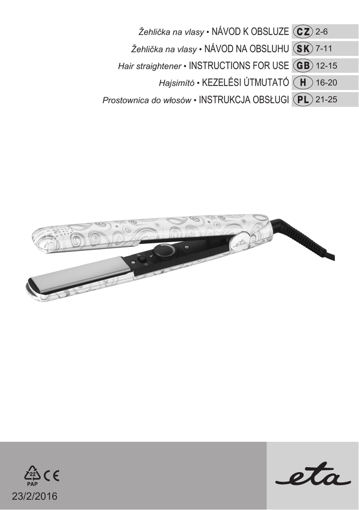 23/2/2016 Žehlička na vlasy • NÁVOD K OBSLUZE Žehlička na vlasy • NÁVOD NA OBSLUHU 2-6 7-11 Hair straightener • INSTRUCTIONS FOR USE GB 12-15 Hajsimító • KEZELÉSI ÚTMUTATÓ H 16-20 Prostownica do włosów • INSTRUKCJA OBSŁUGI PL 21-25 CZ Žehlička na vlasy eta 2336 NÁVOD K OBSLUZE Vážený zákazníku, děkujeme Vám za zakoupení našeho produktu. Před uvedením tohoto přístroje do provozu si velmi pozorně přečtěte návod k obsluze a tento návod spolu se záručním listem, pokladním dokladem a podle možností i s obalem a vnitřním obsahem obalu dobře uschovejte. I. BEZPEČNOSTNÍ UPOZORNĚNÍ – Před prvním uvedením do provozu si pečlivě přečtěte návod k obsluze, prohlédněte vyobrazení a návod si uschovejte pro budoucí použití. Instrukce v návodu považujte za součást spotřebiče a postupte je jakémukoli dalšímu uživateli spotřebiče. –T ento spotřebič mohou používat děti ve věku 8 let a starší a osoby se sníženými fyzickými, smyslovými či mentálními schopnostmi nebo nedostatkem zkušeností a znalostí, pokud jsou pod dozorem nebo byly poučeny o používání spotřebiče bezpečným způsobem a rozumí případným nebezpečím. Děti si se spotřebičem nesmějí hrát. Čištění a údržbu prováděnou uživatelem nesmějí provádět děti, pokud nejsou starší 8 let a pod dozorem. Děti mladší 8 let se musí držet mimo dosah spotřebiče a jeho přívodu. – Před výměnou příslušenství, před čištěním nebo údržbou, spotřebič vypněte a odpojte od el. sítě vytažením vidlice napájecího přívodu z el. zásuvky! –J estliže je napájecí přívod tohoto spotřebiče poškozen, musí být přívod nahrazen výrobcem, jeho servisním technikem nebo podobně kvalifikovanou osobou, aby se tak zabránilo vzniku nebezpečné situace. Vždy odpojte spotřebič od napájení, pokud ho necháváte bez dozoru a před montáží, demontáží nebo čištěním. –S potřebič se nesmí ponořit do vody nebo jiných tekutin a nesmí se používat na místech, kde by mohly spadnout do vany, umyvadla nebo bazénu. Pokud by přesto spotřebič spadl do vody, nevytahujte jej! Nejdříve odpojte vidlici napájecího přívodu z el. zásuvky a až poté spotřebič vyjměte. V takových případech zaneste spotřebič do odborného servisu k prověření jeho bezpečnosti a správné funkce. –P okud se spotřebič používá v koupelně, je nutné jej odpojit po použití od el. sítě vytažením vidlice napájecího přívodu z el. zásuvky, protože v blízkosti vody představuje nebezpečí i když je žehlička vypnutá. –V ždy odpojte spotřebič od napájení, pokud ho necháváte bez dozoru a před montáží, demontáží nebo čištěním. 2 / 25 CZ –P ro zabezpečení doplňkové ochrany doporučujeme instalovat do el. obvodu napájení koupelny proudový chránič (RCD) se jmenovitým vybavovacím proudem nepřevyšujícím 30 mA. Požádejte o radu revizního technika, případně elektrikáře. –N ikdy spotřebič nepoužívejte, pokud má poškozený napájecí přívod nebo vidlici, pokud nepracuje správně, upadl na zem a poškodil se nebo spadl do vody. V takových případech zaneste spotřebič do odborného servisu k prověření jeho bezpečnosti a správné funkce. – Zkontrolujte, zda údaj na typovém štítku odpovídá napětí ve Vaší elektrické zásuvce. Vidlici napájecího přívodu je nutné připojit pouze do zásuvky elektrické instalace, která odpovídá příslušným normám. –S potřebič je určen pouze pro použití v domácnostech a podobné účely! Není konstruován pro použití v kadeřnickém salónu nebo pro jiné komerční použití! –V idlici napájecího přívodu nezasunujte do el. zásuvky a nevytahujte z el. zásuvky mokrýma rukama a taháním za napájecí přívod! –S potřebič nenechávejte v chodu bez dozoru! – Spotřebič neodkládejte na horké tepelné zdroje (např. kamna, sporák, radiátor). – Žádná část spotřebiče se nesmí dostat do styku s místy citlivými na teplo (např. oči, uši, krk atd.). – Při manipulaci postupujte opatrně, aby nedošlo k poranění (např. popálení, opaření). – Pokud byl spotřebič skladován při nižších teplotách, nejprve jej aklimatizujte, čímž se zachová mechanická pevnost dílů z plastu. – Spotřebič se nesmí používat na úpravu paruk, příčesků nebo umělých vlasů. – Spotřebič můžete použít na úpravu vlasů přírodních, barvených i odbarvených. Nepoužívejte je ale na úpravu vlasů, které jsou ošetřeny chemickými prostředky (např. lakem, ztužovadlem atd.), mohlo by dojít ke snížení teplotní účinnosti z důvodu ulpívaní chemických prostředků na destičkách. – Horký spotřebič nepokládejte na měkké a snadno hořlavé povrchy (např. postel, ručníky, povlečení, koberce), mohlo by dojít k poškození těchto věcí od horkých částí spotřebiče. – Při manipulaci se spotřebičem chraňte napájecí přívod před kontaktem s horkým povrchem destiček, případně jinými zdroji tepla. – Ihned po použití spotřebič vypněte, odpojte od el. sítě a nechte vychladnout. Poté je uložte na bezpečné suché místo, mimo dosah dětí. – Pravidelně kontrolujte stav napájecího přívodu spotřebiče. – Zabraňte tomu, aby přívodní kabel volně visel přes hranu pracovní desky, kde by na něho mohly dosáhnout děti. – Napájecí přívod nesmí být poškozen ostrými nebo horkými předměty, otevřeným plamenem, nesmí se ponořit do vody ani ohýbat přes ostré hrany. – V případě potřeby použití prodlužovacího přívodu je nutné, aby nebyl poškozen a vyhovoval platným normám. – Neovíjejte napájecí přívod kolem spotřebiče, prodlouží se tak životnost přívodu. – Spotřebič nikdy nepoužívejte pro žádný jiný účel, než pro kt