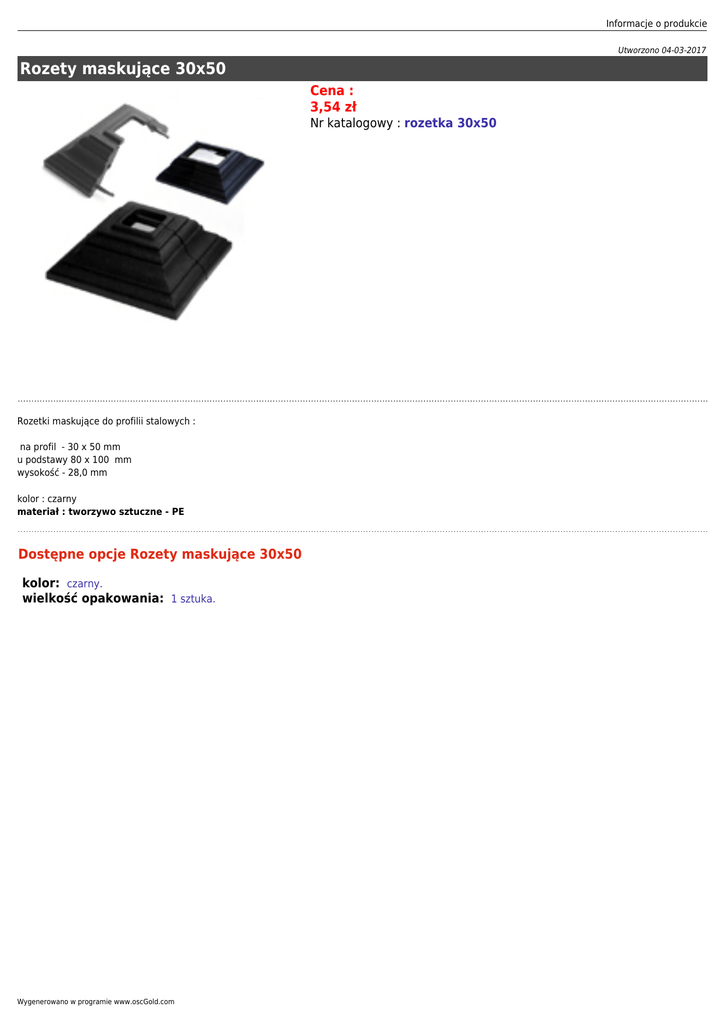 Informacje o produkcie Utworzono 04-03-2017 Rozety maskujące 30x50 Cena : 3,54 zł Nr katalogowy : rozetka 30x50 Rozetki maskujące do profilii stalowych : na profil - 30 x 50 mm u podstawy 80 x 100 mm wysokość - 28,0 mm kolor : czarny materiał : tworzywo sztuczne - PE Dostępne opcje Rozety maskujące 30x50 kolor: czarny. wielkość opakowania: 1 sztuka. Wygenerowano w programie www.oscGold.com
