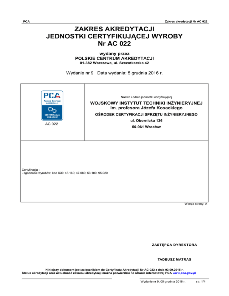 PCA Zakres akredytacji Nr AC 022 ZAKRES AKREDYTACJI JEDNOSTKI CERTYFIKUJĄCEJ WYROBY Nr AC 022 wydany przez POLSKIE CENTRUM AKREDYTACJI 01-382 Warszawa, ul. Szczotkarska 42 Wydanie nr 9 Data wydania: 5 grudnia 2016 r. Nazwa i adres jednostki certyfikującej WOJSKOWY INSTYTUT TECHNIKI INŻYNIERYJNEJ im. profesora Józefa Kosackiego OŚRODEK CERTYFIKACJI SPRZĘTU INŻYNIERYJNEGO AC 022 ul. Obornicka 136 50-961 Wrocław Certyfikacja : - zgodności wyrobów, kod ICS: 43.160; 47.080; 53.100, 95.020 Wersja strony: A ZASTĘPCA DYREKTORA TADEUSZ MATRAS Niniejszy dokument jest załącznikiem do Certyfikatu Akredytacji Nr AC 022 z dnia 03.09.2015 r. Status akredytacji oraz aktualność zakresu akredytacji można potwierdzić na stronie internetowej PCA www.pca.gov.pl Wydanie nr 9, 05 grudnia 2016 r. str. 1/4 PCA Zakres akredytacji Nr AC 022 Rodzaj działalności: CERTYFIKACJA ZGODNOŚCI WYROBÓW Nazwa wyrobu / grupy wyrobów Samochody podpontonowe Pojazdy pływające Program certyfikacji IP-1a IP-1b IP-3 Norma / dokument normatywny NO-54-A201 NO-23-A201 Kutry wojskowe śródlądowe NO-54-A201 Silniki zaburtowe IP-1b IP-3 Koła ratunkowe Pojazdy torujące kołowe Pojazdy torujące gąsienicowe 47.080 95.020 NO-19-A205 KTW-28-A334 PN-EN 14144 IP-1a IP-1b IP-3 KTW-38-A332 PN-EN 474-5 KTW-38-A330 Koparki wieloczerpakowe PN-EN 474-10 PN-V-92000 Koparki frezowe PN-V-92001 Ładowarki PN-EN 474-3 KTW-38-A330 Spycharki PN-EN 474-2 KTW-38-A330 Równiarki PN-EN 474-8 Zgarniarki PN-EN 474-7 Spycharko-ładowarki PN-EN 474-4 WT 405/Inż. Wielozadaniowe samobieżne maszyny inżynieryjne KTW-38-A310 KTW-38-A330 IP-1b IP-3 53.100 95.020 KTW-38-A310 Koparki jednonaczyniowe Pojemniki przeciwodłamkowe i przeciwwybuchowe 43.160 95.020 NO-23-A202 Przyczepy do transportu kutrów i łodzi Łodzie wojskowe ICS KTW-13-A321 Zespoły prądotwórcze prądu przemiennego jednofazowe i trójfazowe NO-61-A208 Zestawy i środki do maskowania w zakresie: optycznym, termalnym, UV i radiolokacyjnym NO-80-A200 NO-10-A208 NO-10-A221 Zestawy do maskowania pojedynczego żołnierza NO-10-A208 NO-80-A200 Pokrycia maskujące NO-10-A208 Pokrycia maskujące przeciwradiolokacyjne NO-10-A208 Ruchome urządzenia uzdatniania wody PN-V-65000 PN-V-65001 NO-46-A001 NO-46-A203 NO-46-A801 95.020 Wersja strony: A Wydanie nr 9, 05 grudnia 2016 r. str. 2/4 PCA Zakres akredytacji Nr AC 022 Nazwa wyrobu / grupy wyrobów Zbiorniki na wodę pitną Filtry do wody indywidualne i domowe Program certyfikacji IP-1b IP-3 Wykrywacze metali Norma / dokument normatywny ICS NO-47-A200 95.020 KTW-46-A340 NO-13-A212 Wersja strony: A ICS – International Classification for Standards (Międzynarodowa Klasyfikacja Norm). Zastosowane oznaczenia programów certyfikacji wyrobów: IP-1a IP-1b IP-3 „Program certyfikacji wyrobów typu 1a”, wydanie 1 z 15.04.2015 r. „Program certyfikacji wyrobów typu 1b”, wydanie 1 z 15.04.2015 r. „Program certyfikacji wyrobów typu 3”, wydanie 4 z 22.07.2016 r. Wydanie nr 9, 05 grudnia 2016 r. str. 3/4 PCA Zakres akredytacji Nr AC 022 Wykaz zmian Zakresu Akredytacji Nr AC 022 Status zmian: wersja pierwotna – A Zatwierdzam status zmian ZASTĘPCA DYREKTORA HOLOGRAM HOLOGRAM HOLOGRAM HOLOGRAM TADEUSZ MATRAS dnia: 05.12.2016 r. Wydanie nr 9, 05 grudnia 2016 r. str. 4/4