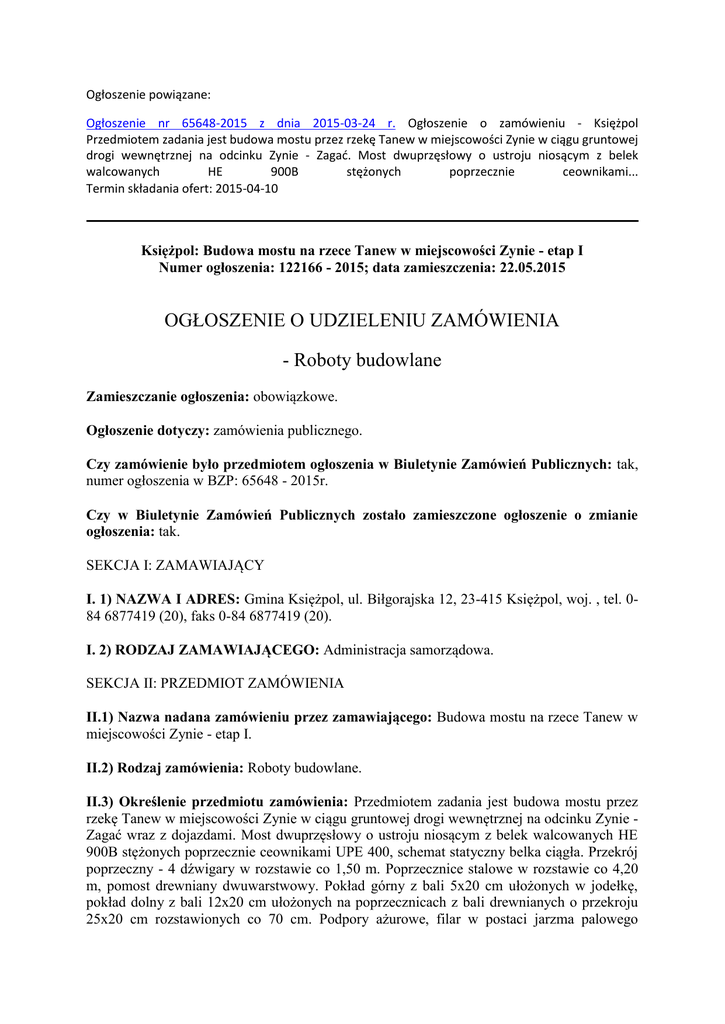 Ogłoszenie powiązane: Ogłoszenie nr 65648-2015 z dnia 2015-03-24 r. Ogłoszenie o zamówieniu - Księżpol Przedmiotem zadania jest budowa mostu przez rzekę Tanew w miejscowości Zynie w ciągu gruntowej drogi wewnętrznej na odcinku Zynie - Zagać. Most dwuprzęsłowy o ustroju niosącym z belek walcowanych HE 900B stężonych poprzecznie ceownikami... Termin składania ofert: 2015-04-10 Księżpol: Budowa mostu na rzece Tanew w miejscowości Zynie - etap I Numer ogłoszenia: 122166 - 2015; data zamieszczenia: 22.05.2015 OGŁOSZENIE O UDZIELENIU ZAMÓWIENIA - Roboty budowlane Zamieszczanie ogłoszenia: obowiązkowe. Ogłoszenie dotyczy: zamówienia publicznego. Czy zamówienie było przedmiotem ogłoszenia w Biuletynie Zamówień Publicznych: tak, numer ogłoszenia w BZP: 65648 - 2015r. Czy w Biuletynie Zamówień Publicznych zostało zamieszczone ogłoszenie o zmianie ogłoszenia: tak. SEKCJA I: ZAMAWIAJĄCY I. 1) NAZWA I ADRES: Gmina Księżpol, ul. Biłgorajska 12, 23-415 Księżpol, woj. , tel. 084 6877419 (20), faks 0-84 6877419 (20). I. 2) RODZAJ ZAMAWIAJĄCEGO: Administracja samorządowa. SEKCJA II: PRZEDMIOT ZAMÓWIENIA II.1) Nazwa nadana zamówieniu przez zamawiającego: Budowa mostu na rzece Tanew w miejscowości Zynie - etap I. II.2) Rodzaj zamówienia: Roboty budowlane. II.3) Określenie przedmiotu zamówienia: Przedmiotem zadania jest budowa mostu przez rzekę Tanew w miejscowości Zynie w ciągu gruntowej drogi wewnętrznej na odcinku Zynie Zagać wraz z dojazdami. Most dwuprzęsłowy o ustroju niosącym z belek walcowanych HE 900B stężonych poprzecznie ceownikami UPE 400, schemat statyczny belka ciągła. Przekrój poprzeczny - 4 dźwigary w rozstawie co 1,50 m. Poprzecznice stalowe w rozstawie co 4,20 m, pomost drewniany dwuwarstwowy. Pokład górny z bali 5x20 cm ułożonych w jodełkę, pokład dolny z bali 12x20 cm ułożonych na poprzecznicach z bali drewnianych o przekroju 25x20 cm rozstawionych co 70 cm. Podpory ażurowe, filar w postaci jarzma palowego przestrzennego złożonego z 2 rzędów pali żelbetowych prefabrykowanych 40x40 cm. Pale zwieńczone oczepem żelbetowym, przyczółki w postaci jarzm palowych jednoprzestrzennych zwieńczonych oczepami oraz ścian zapleczach. Kąt skoku 62,51o. Zakres prac: -roboty pomiarowe - wytyczenie mostu i dojazdów, -zdjęcie warstwy humusu, -wbicie żelbetowych pali fundamentowych oraz pali opierzenia podpór skrajnych, -wykonanie żelbetowych oczepów podpór, -ustawienie na podporach łożysk stalowych, -montaż stalowej konstrukcji ustroju nośnego wraz z jej zabezpieczeniem antykorozyjnym, -ułożenie drewnianego pomostu, -wykonanie poręczy drewnianych i opasek bezpieczeństwa, -wykonanie opierzenia ścianek zaplecznych przyczółków z prefabrykowanych płyt żelbetowych, -wykonanie izolacji bitumicznej elementów ścianek zaplecznych od strony naziomu, -wykonanie nasypów dojazdowych do mostu, -wykonanie nawierzchni gruntowej z tłucznia kamiennego, humusowanie skarp nasypu wraz z obsiewaniem trawą. Parametry techniczno - użytkowe projektowanego mostu: -długość mostu - 67,20 m, -rozpiętość teoretyczna - 2 x 33,00 m, szerokość konstrukcyjna - 5,80 m, -szerokość użytkowa - 5,20 m, -szerokość jezdni - 4,20 m, -spadek poprzeczny jezdni na obiekcie - 0% Most usytuowany jest na odcinku prostym drogi w profilu niweleta ukształtowana jest w spadku 0,5% w stronę m. Zynie. Klasa obciążenia mostu klasy E wg. PN-85 S-10030. Nośność obiektu 15t. Dojazdy do mostu stanowią odcinki drogi niepublicznej - wewnętrznej, rolniczej. Należy wykonać nasypy z gruntu II kategorii. Pochylenie skarp 1:1,5, szerokość korony drogi 5 m, jezdnia 3,5m obustronne pobocze 2 x 0,75m. Pochylenie poprzeczne jezdni jednostronne 4%. Konstrukcję nawierzchni z tłucznia kamiennego, podbudowa o gr. 20cm oraz warstwa jezdna o gr. 15cm. Szczegółowy opis oraz zakres prac został opisany w projekcie budowlanym, szczegółowej specyfikacji technicznej oraz przedmiarach robót stanowiącymi załączniki do niniejszej SIWZ. Dodatkowo należy wykonać obciążenie próbne dynamiczne 2szt. pali prefabrykowanych - 1 szt. na podporze nr 1 oraz 1 szt. na podporze nr 2. Z powodu braku uszczegółowienia przedmiotowego badania w przedmiarze robót, koszty związane z wykonaniem badania należy dołączyć do kosztorysu ofertowego, w którejś z pozycji lub oddzielnie wykazać. Jeżeli w dokumentacji projektowej lub innych dokumentach załączonych do niniejszej SIWZ opisano przedmiot zamówienia ze wskazaniem określeń oznaczeń o których mowa w art. 29 ust 3 i art. 30 ust 1-3 Prawa zamówień publicznych, należy przyjąć, że wskazaniu takiemu towarzyszy określenie lub równoważny, równoważne z opisywanym. Zamawiający przewiduje płatność dwu etapowo tj. w 2015r. do kwoty (łącznie z wynagrodzeniem inspektora nadzoru) 500 000,00 zł. a pozostałą część w 2016r. po prawidłowo ukończonym zadaniu. W razie wystąpienia nieprzewidzianych okoliczności Zamawiający przewiduje udzielenie zamówienia zgodnie z art. 67 ust.1 pkt. 5 ustawy Pzp. W ramach zamówienia Wykonawca zobowiązany jest również do: 1) organizacji i zagospodarowania zaplecza budowy; 2) zapewnienia bieżącej obsługi geodezyjnej przez uprawnione służby geodezyjne, wykonanie dokumentacji powykonawczej, łącznie z dokumentacją geodezyjną (inwentaryzacją powykonawczą) wszystkich prac, zatwierdzoną przez odpowiedni, z uwagi na lokalizację robót, Urząd Geodezji i Kartografii; 3) opracowanie planu bezpieczeństwa i ochrony zdrowia; 4) oznakowanie terenu budowy; 5) w przypadku zniszczeń lub uszkodzeń podczas prowadzenia robót - naprawienie ich i doprowadzenie do stanu pierwotnego; 6) zapewnienie dozoru, a także właściwych warunków bezpieczeństwa i higieny pracy; 7) utrzymanie terenu budowy w stanie wolnym od przeszkód komunikacyjnych oraz usuwanie na bieżąco zbędnych materiałów, odpadów i śmieci; 8) udzielenia rękojmi za wady fizycz