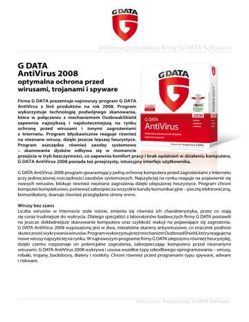 Informacja prasowa firmy G DATA Software G DATA AntiVirus 2008 optymalna ochrona przed wirusami, trojanami i spyware Firma G DATA prezentuje najnowszy program G DATA AntiVirus z linii produktów na rok 2008. Program wykorzystuje technologię podwójnego skanowania, która w połączeniu z mechanizmem OutbreakShield zapewnia najszybszą i najskuteczniejszą na rynku ochronę przed wirusami i innymi zagrożeniami z Internetu. Program błyskawicznie reaguje również na nieznane wirusy, dzięki jeszcze lepszej heurystyce. Program oszczędza również zasoby systemowe – skanowanie dysków odbywa się w momencie przejścia w tryb bezczynności, co zapewnia komfort pracy i brak opóźnień w działaniu komputera. G DATA AntiVirus 2008 posiada też przejrzysty, intuicyjny interfejs użytkownika. G DATA AntiVirus 2008 program gwarantujący pełną ochronę komputera przed zagrożeniami z Internetu przy jednoczesnej oszczędności zasobów systemowych. Najszybciej na rynku reaguje na pojawienie się nowych wirusów, blokuje również nieznane zagrożenia dzięki ulepszonej heurystyce. Program chroni komputer kompleksowo, ponieważ zabezpiecza wszystkie kanały komunikacyjne – pocztę elektroniczną, komunikatory, skanuje również przeglądane strony www. Wirusy bez szans Liczba wirusów w Internecie stale rośnie, zmienia się również ich charakterystyka, przez co stają się coraz trudniejsze do wykrycia. Dlatego specjaliści z laboratoriów badawczych firmy G DATA postawili na jeszcze dokładniejsze skanowanie komputera oraz szybkość reakcji na pojawiające się zagrożenia. G DATA AntiVirus 2008 wyposażony jest w dwa, niezależne skanery antywirusowe, co znacznie podnosi skuteczność wykrywania wirusów. Program wykorzystuje też mechanizm OutbreadShield, który reaguje na nowe wirusy najszybciej na rynku. W najnowszym programie firmy G DATA ulepszono również heurystykę, dzięki czemu rozpoznaje on potencjalne zagrożenia, zabezpieczając komputery przed nieznanymi wirusami. G DATA AntiVirus 2008 wykrywa i usuwa wszelkie typy szkodliwego oprogramowania – wirusy, robaki, trojany, backdoory, dialery i rootkity. Chroni również przed programami typu spyware, adware i riskware. Bezpiecznie. Bezpieczniej. G DATA Software. Wszechstronna ochrona Aby skutecznie ochronić komputer przed zagrożeniami z Internetu konieczne jest zabezpieczenie wszystkich kanałów komunikacyjnych. G DATA AntiVirus 2008 chroni pocztę elektroniczną w aplikacjach Outlook, Outlook Express, Mozilla, Opera itp. Zabezpiecza też komunikatory internetowe, takie jak np. MSN, Yahoo czy AOL. To niezwykle ważne, ponieważ z miarę wzrostu popularności komunikatorów, coraz częściej stają się one celem ataków hakerskich. Duża część wirusów infekuje komputer podczas sufrowania po Internecie, dlatego nowy program firmy G DATA automatycznie skanuje protokoły HTTP przeglądanych stron. Kontroluje również rejestr i plik hosts. G DATA AntiVirus 2008 skanuje wszelkie typy plików i wszystkie formaty kompresji. Program przyjazny systemowi Specjaliści G DATA zdają sobie sprawę, że oprócz bezpieczeństwa niezwykle ważny jest także komfort pracy użytkowników, dlatego G DATA AntiVirus 2008 pracuje w momencie, gdy system przechodzi w tryb bezczynności. Niweluje to potencjalne opóźnienia w pracy komputera, przy jednoczesnym zachowaniu ochrony antywirusowej. Najnowszy program firmy G DATA jest również prosty i intuicyjny w obsłudze. Posiada przejrzysty i nieobciążający systemu interfejs użytkownika. Aktualizacja i pomoc techniczna Cyber-przestępcy nie tracą czasu – stale tworzą nowe szkodliwe programy i kody. Dlatego szczególnie istotna jest bieżąca aktualizacja programu antywirusowego. Użytkownicy, którzy kupią pakiet G DATA AntiVirus 2008, zyskują dostęp do darmowej aktualizacji plików programu i baz sygnatur wirusów przez cały rok. Dodatkowo mogą korzystać z pomocy technicznej, dostępnej zarówno za pośrednictwem telefonu jak i poczty elektronicznej. Specyfikacja • Obsługa systemów Windows Vista (32-bit oraz 64-bit) • Wielokrotnie nagradzana technologia podwójnego skanowania • Mechanizm OutbreakShield – najszybsza reakcja na nowe wirusy • Ochrona poczty w programach Outlook, Outlook Express, Thunderbird, The Bat, Opera itd. (POP3 oraz IMAP) • Ochrona komunikatorów internetowych • AntiSpyware • AntiRootkit Wymagania programu: Komputer z systemem Windows 2000 z SP4, WindowsXP z SP2 (32/64-bit) lub Windows Vista (32/64-bit ) Od 128 MB RAM Dostęp do Internetu Bezpiecznie. Bezpieczniej. G DATA Software. Informacje o G DATA Software G DATA Software to międzynarodowy lider rozwiązań do ochrony komputera – antywirusów, programów do szyfrowania i ochrony danych oraz niszczenia danych poufnych. Portfolio produktów firmy G DATA Security obejmuje rozwiązania zabezpieczające dla klientów końcowych, małych i średnich firm oraz dużych przedsiębiorstw. Rozwiązania G DATA Security są obecne na rynkach USA, Japonii, Niemiec, Anglii, Francji, Włoch, Hiszpanii, Kanady, Polski, Korei, Holandii, Belgii, Austrii, Szwajcarii, Węgier oraz w Luksemburgu. Międzynarodowa centrala firmy mieści się w Bochum (Niemcy). W Polsce firma ma swoją siedzibę w Szczecinku od 12 lat, z oddziałem handlowym zlokalizowanym w Warszawie. Więcej na www.gdata.pl. Jakość Żaden inny europejski producent programów zabezpieczających nie zdobył w ostatnich 5 latach tak wielu nagród i wyróżnień w testach na arenie międzynarodowej jak i krajowej. Firma G DATA łączy w swych produktach jakość oraz technologie zabezpieczeń na światowym poziomie. Przykładem jest technologia podwójnego skanowania wykorzystująca dwa niezależne skanery oraz mechanizm natychmiastowej ochrony OutbreakShield. Oferta Portfolio produktów firmy G DATA Security obejmuje rozwiązania zabezpieczające dla klientów końcowych, małych i średnich firm, a także dla dużych przedsiębiorstw i