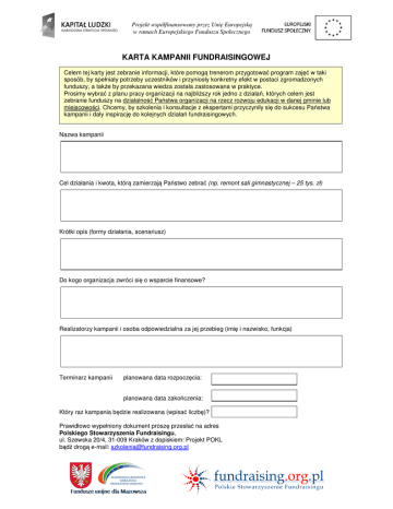 Projekt współfinansowany przez Unię Europejską w ramach Europejskiego Funduszu Społecznego KARTA KAMPANII FUNDRAISINGOWEJ Celem tej karty jest zebranie informacji, które pomogą trenerom przygotować program zajęć w taki sposób, by spełniały potrzeby uczestników i przyniosły konkretny efekt w postaci zgromadzonych funduszy, a także by przekazana wiedza została zastosowana w praktyce. Prosimy wybrać z planu pracy organizacji na najbliższy rok jedno z działań, których celem jest zebranie funduszy na działalność Państwa organizacji na rzecz rozwoju edukacji w danej gminie lub miejscowości. Chcemy, by szkolenia i konsultacje z ekspertami przyczyniły się do sukcesu Państwa kampanii i dały inspirację do kolejnych działań fundraisingowych. Nazwa kampanii Cel działania i kwota, którą zamierzają Państwo zebrać (np. remont sali gimnastycznej – 25 tys. zł) Krótki opis (formy działania, scenariusz) Do kogo organizacja zwróci się o wsparcie finansowe? Realizatorzy kampanii i osoba odpowiedzialna za jej przebieg (imię i nazwisko, funkcja) Terminarz kampanii planowana data rozpoczęcia: planowana data zakończenia: Który raz kampania będzie realizowana (wpisać liczbę)? Prawidłowo wypełniony dokument proszę przesłać na adres Polskiego Stowarzyszenia Fundraisingu, ul. Szewska 20/4, 31-009 Kraków z dopiskiem: Projekt POKL bądź drogą e-mail: [email protected]