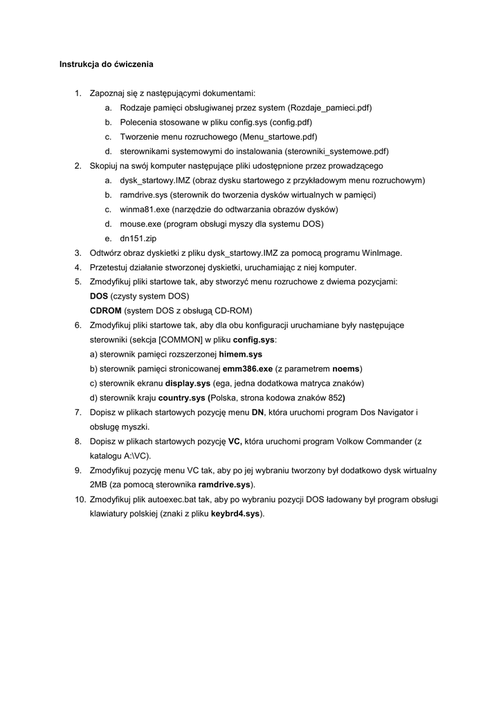 Instrukcja do ćwiczenia 1. Zapoznaj się z następującymi dokumentami: a. Rodzaje pamięci obsługiwanej przez system (Rozdaje_pamieci.pdf) b. Polecenia stosowane w pliku config.sys (config.pdf) c. Tworzenie menu rozruchowego (Menu_startowe.pdf) d. sterownikami systemowymi do instalowania (sterowniki_systemowe.pdf) 2. Skopiuj na swój komputer następujące pliki udostępnione przez prowadzącego a. dysk_startowy.IMZ (obraz dysku startowego z przykładowym menu rozruchowym) b. ramdrive.sys (sterownik do tworzenia dysków wirtualnych w pamięci) c. winma81.exe (narzędzie do odtwarzania obrazów dysków) d. mouse.exe (program obsługi myszy dla systemu DOS) e. dn151.zip 3. Odtwórz obraz dyskietki z pliku dysk_startowy.IMZ za pomocą programu WinImage. 4. Przetestuj działanie stworzonej dyskietki, uruchamiając z niej komputer. 5. Zmodyfikuj pliki startowe tak, aby stworzyć menu rozruchowe z dwiema pozycjami: DOS (czysty system DOS) CDROM (system DOS z obsługą CD-ROM) 6. Zmodyfikuj pliki startowe tak, aby dla obu konfiguracji uruchamiane były następujące sterowniki (sekcja [COMMON] w pliku config.sys: a) sterownik pamięci rozszerzonej himem.sys b) sterownik pamięci stronicowanej emm386.exe (z parametrem noems) c) sterownik ekranu display.sys (ega, jedna dodatkowa matryca znaków) d) sterownik kraju country.sys (Polska, strona kodowa znaków 852) 7. Dopisz w plikach startowych pozycję menu DN, która uruchomi program Dos Navigator i obsługę myszki. 8. Dopisz w plikach startowych pozycję VC, która uruchomi program Volkow Commander (z katalogu A:\VC). 9. Zmodyfikuj pozycję menu VC tak, aby po jej wybraniu tworzony był dodatkowo dysk wirtualny 2MB (za pomocą sterownika ramdrive.sys). 10. Zmodyfikuj plik autoexec.bat tak, aby po wybraniu pozycji DOS ładowany był program obsługi klawiatury polskiej (znaki z pliku keybrd4.sys).