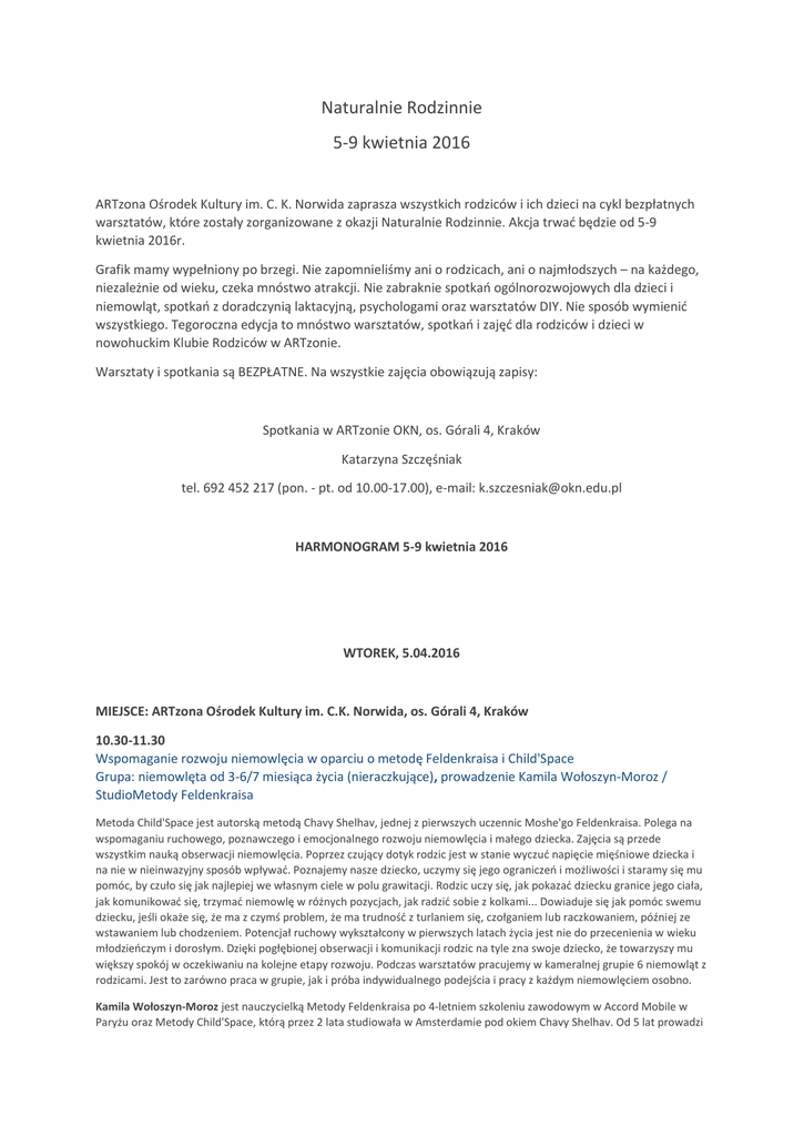 Naturalnie Rodzinnie 5-9 kwietnia 2016 ARTzona Ośrodek Kultury im. C. K. Norwida zaprasza wszystkich rodziców i ich dzieci na cykl bezpłatnych warsztatów, które zostały zorganizowane z okazji Naturalnie Rodzinnie. Akcja trwać będzie od 5-9 kwietnia 2016r. Grafik mamy wypełniony po brzegi. Nie zapomnieliśmy ani o rodzicach, ani o najmłodszych – na każdego, niezależnie od wieku, czeka mnóstwo atrakcji. Nie zabraknie spotkań ogólnorozwojowych dla dzieci i niemowląt, spotkań z doradczynią laktacyjną, psychologami oraz warsztatów DIY. Nie sposób wymienić wszystkiego. Tegoroczna edycja to mnóstwo warsztatów, spotkań i zajęć dla rodziców i dzieci w nowohuckim Klubie Rodziców w ARTzonie. Warsztaty i spotkania są BEZPŁATNE. Na wszystkie zajęcia obowiązują zapisy: Spotkania w ARTzonie OKN, os. Górali 4, Kraków Katarzyna Szczęśniak tel. 692 452 217 (pon. - pt. od 10.00-17.00), e-mail: [email protected] HARMONOGRAM 5-9 kwietnia 2016 WTOREK, 5.04.2016 MIEJSCE: ARTzona Ośrodek Kultury im. C.K. Norwida, os. Górali 4, Kraków 10.30-11.30 Wspomaganie rozwoju niemowlęcia w oparciu o metodę Feldenkraisa i Child'Space Grupa: niemowlęta od 3-6/7 miesiąca życia (nieraczkujące), prowadzenie Kamila Wołoszyn-Moroz / StudioMetody Feldenkraisa Metoda Child'Space jest autorską metodą Chavy Shelhav, jednej z pierwszych uczennic Moshe'go Feldenkraisa. Polega na wspomaganiu ruchowego, poznawczego i emocjonalnego rozwoju niemowlęcia i małego dziecka. Zajęcia są przede wszystkim nauką obserwacji niemowlęcia. Poprzez czujący dotyk rodzic jest w stanie wyczuć napięcie mięśniowe dziecka i na nie w nieinwazyjny sposób wpływać. Poznajemy nasze dziecko, uczymy się jego ograniczeń i możliwości i staramy się mu pomóc, by czuło się jak najlepiej we własnym ciele w polu grawitacji. Rodzic uczy się, jak pokazać dziecku granice jego ciała, jak komunikować się, trzymać niemowlę w różnych pozycjach, jak radzić sobie z kolkami... Dowiaduje się jak pomóc swemu dziecku, jeśli okaże się, że ma z czymś problem, że ma trudność z turlaniem się, czołganiem lub raczkowaniem, później ze wstawaniem lub chodzeniem. Potencjał ruchowy wykształcony w pierwszych latach życia jest nie do przecenienia w wieku młodzieńczym i dorosłym. Dzięki pogłębionej obserwacji i komunikacji rodzic na tyle zna swoje dziecko, że towarzyszy mu większy spokój w oczekiwaniu na kolejne etapy rozwoju. Podczas warsztatów pracujemy w kameralnej grupie 6 niemowląt z rodzicami. Jest to zarówno praca w grupie, jak i próba indywidualnego podejścia i pracy z każdym niemowlęciem osobno. Kamila Wołoszyn-Moroz jest nauczycielką Metody Feldenkraisa po 4-letniem szkoleniu zawodowym w Accord Mobile w Paryżu oraz Metody Child'Space, którą przez 2 lata studiowała w Amsterdamie pod okiem Chavy Shelhav. Od 5 lat prowadzi zajęcia grupowe Metody Feldenkraisa "Świadomość Poprzez Ruch" z dorosłymi oraz sesje indywidualne "Integracji Funkcjonalnej". Od 4 lat pracuje również z niemowlętami i małymi dziećmi, prowadzi zajęcia grupowe i indywidualne ze "Wspomagania rozwoju niemowlęcia Metodą Child'Space i Feldenkraisa". Publikuje na portalu Dzeci Są Ważne teksty poświęcone rozwojowi niemowląt. Jest mamą 5-letniego Mikołaja i 2-letniego Janka. 12.00-14.00 Mamo, bądź dla siebie dobra, prowadzenie Agnieszka Wódz / Będziemy Rodzicami W trakcie warsztatu będziemy mówić o następujących zagadnieniach: - dlaczego dbałość o dobrostan mamy jest tak ważny - jak dbać o swoje potrzeby - od czego zacząć - jak kontynuować - ile czasu potrzebujemy na wprowadzenie zmiany - gotowy plan wdrażamy w życie :) Prowadząca Agnieszka Wódz, matka, trenerka, coachka, autorka projektu „Będziemy rodzicami” 16.00-18.00 Projekcja filmu MicroBirth oraz towarzyszącą filmowi rozmowa dotycząca tego, co zrobić, żeby cesarskie cięcie było dobrym przeżyciem, prowadzenie Marta Żłobińska / Mamy Prawo Obywatel Mama Czy sposób, w jaki przyszliśmy na świat może wpłynąć na nasze przyszłe zdrowie? Nowy film dokumentalny, „Microbirth – poród w skali mikro” poszukuje odpowiedzi na to pytania. Występujący w filmie znani naukowcy zastanawiają się, w jaki sposób panujące obecnie praktyki położnicze mogą zaburzać kluczowe procesy biologiczne człowieka. Film został wyprodukowany i wyreżyserowany przez parę filmowców, Toni Harman i Alexa Wakeforda, którzy są również rodzicami urodzonej przez cesarskie cięcie córki. Po projekcji odbędzie się rozmowa na temat sposobów, które pomagają w dobrym przeżyciu porodu poprzez cesarskie cięcie. Przyjrzymy się standardom opieki okołoporodowej dotyczących tego etapu, tej formy porodu. Szczególnie serdecznie zapraszamy kobiety, pary, które mają za sobą doświadczenie planowanego lub nieplanowanego porodu poprzez cesarskie cięcie i chciałyby się nim podzielić. Właścicielką licencji i współorganizatorką pokazu jest Fundacja Rodzić po Ludzku. ŚRODA 06.04.2016 MIEJSCE: ARTzona Ośrodek Kultury im. C.K. Norwida, os. Górali 4, Kraków 11.00-12.00 Sztuka projektowania kariery czyli od czego zacząć? prowadzenie Aneta Rydz / autorka książki „Mamo Działaj – 100 dni do zmiany dla każdej Mamy” Aby znaleźć pracę swoich marzeń należy zacząć od...siebie. Poznanie swoich wartości i potrzeb to proces trwający przez całe nasze życie. Jeżeli chcesz się dowiedzieć od czego zacząć - zapraszamy! Aneta Rydz - trenerka i projektantka kariery, proaktywna i przedsiębiorcza. Pomaga mamom w budowaniu ich własnych biznesów i pokazuje w jaki sposób osiągnąć niezależność finansową. Autorka książki „Mamo Działaj – 100 dni do zmiany dla każdej Mamy" rekomendowaną przez Iwonę Majewską-Opiełkę. 12.00-14.00 Wolna Strefa Rodzica / nie ma konieczności zapisów 16.00-17.30 Pokaz filmu „Narodziny, jakie znamy” połączony z dyskusją, prowadzenie Monika Lipow