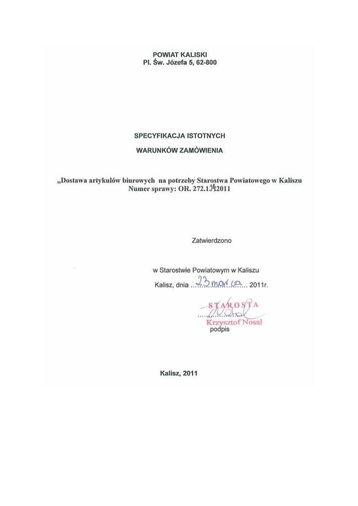 Nr sprawy OR. 272.1. 14.2011 SPECYFIKACJA ISTOTNYCH WARUNKÓW ZAMÓWIENIA w postępowaniu pn.: ,,Dostawa artykułów biurowych na potrzeby Starostwa Powiatowego w Kaliszu” Wartość zamówienia nie przekracza kwoty 193 000 euro I NAZWA, ADRES I INNE DANE ZAMAWIAJĄCEGO: Powiat Kaliski z siedzibą w Kaliszu, Pl. Św. Józefa 5, tel. 062-501-42-00, fax 062-757-26-22, htpp://www.powiat.kalisz.pl, e-mail: [email protected]. II TRYB UDZIELENIA ZAMÓWIENIA: Przetarg nieograniczony na podstawie art. 39 ustawy z dnia 29 stycznia 2004 r. Prawo zamówień publicznych (t.j.Dz. U. z 2010 r. Nr 113 poz. 759). III INFORMACJE OGÓLNE: 1. UŜyte w SIWZ terminy oznaczają: 1) „Zamawiający” Powiat Kaliski’ 2) Wykonawca” – podmiot, który ubiega się o udzielenie zamówienia, złoŜy ofertę na wykonanie zamówienia lub zawarł z Zamawiającym umowę w sprawie wykonania zamówienia 2. Wykonawca powinien zapoznać się z całością SIWZ. IV OPIS PRZEDMIOTU ZAMÓWIENIA: 1. Przedmiotem zamówienia jest sukcesywna dostawa róŜnych artykułów i drobnego sprzętu biurowego na potrzeby Starostwa Powiatowego w Kaliszu wyspecyfikowanego w szczegółowym opisie przedmiotu zamówienia, zawartym w załączniku nr 1 do siwz- Formularz cenowy, zgodnie z warunkami SIWZ oraz postanowieniami projektu umowy. W ramach niniejszego zamówienia Wykonawca sprzeda i dostarczy Zamawiającemu przedmiot zamówienia. Dostawa przedmiotu zamówienia będzie realizowana sukcesywnie do końca 2011r. Sprzedawca dostarczać będzie Zamawiającemu przedmiot zamówienia na kaŜdorazowe, ustne lub pisemne, zlecenie Zamawiającego i w ilości przez niego wskazanej. Zamawiający podkreśla, Ŝe podane w siwz ilości poszczególnych towarów są ilościami szacunkowymi i mogą ulec zmianie w trakcie trwania umowy.. Zamawiający zastrzega sobie w tym zakresie prawo do ograniczenia zakresu przedmiotu umowy do 70% wartości umowy brutto. Niewykorzystanie przez Zamawiającego 30% wartości umowy brutto nie moŜe stanowić podstawy do roszczeń odszkodowawczych ze strony Wykonawcy z tytułu niezrealizowania zamówienia. Zmienione ilości będą wynikać z bieŜącego zapotrzebowania Zamawiającego na dany artykuł. PowyŜsze zmiany nie mogą spowodować zmian cen jednostkowych Zmiany w tym zakresie nie stanowić będą zmiany umowy. 2. Wyspecyfikowany przedmiot zamówienia musi być fabrycznie nowy, kompletny i przydatny do wykorzystania bez Ŝadnych dodatkowych inwestycji i zakupów. 3.Zamawiający informuje jednocześnie, Ŝe wskazane w opisie przedmiotu zamówienia: typy i symbole, oznaczenia oraz ewentualne nazwy producentów zostały określone w celu sprecyzowania parametrów i warunków techniczno-uŜytkowych przedmiotu zamówienia i dopuszcza oferowanie artykułów równowaŜnych, pod warunkiem, Ŝe zagwarantują one uzyskanie warunków eksploatacyjnych nie gorszych od załoŜonych przez Zamawiającego. W przypadku zastosowania innych niŜ podane rozwiązań, udowodnienie równowaŜności proponowanych rozwiązań spoczywa na Wykonawcy. 4. Wykonawca dostarczy przedmiot zamówienia na własny koszt pod wskazany przez Zamawiającego adres jako miejsce dostawy. Szczegółowy opis przedmiotu zamówienia zawiera Załącznik nr 1 do SIWZ Kod i nazwa zamówienia – według Wspólnego Słownika Zamówień: 30190000-7 – róŜny sprzęt i artykuły biurowe V INFORMACJA O PRZEWIDYWANYCH ZAMÓWIENIACH UZUPEŁNIAJĄCYCH: Zamawiający nie przewiduje moŜliwości udzielenia zamówień uzupełniających, o których mowa w art. 67 ust.1 pkt. 7 ustawy Prawo zamówień publicznych. VI OPIS SPOSOBU PRZEDSTAWIANIA OFERT WARIANTOWYCH ORAZ MINIMALNE WARUNKI JAKIM MUSZA ODPOWIADAĆ OFERTY WARIANTOWE: Zamawiający nie dopuszcza składania ofert wariantowych. VII OPIS CZĘŚCI ZAMÓWIENIA JEśELI ZAMAWIAJĄCY DOPUSZCZA SKŁADANIE OFERT CZĘŚCIOWYCH: Zamawiający nie dopuszcza składania ofert częściowych. VIII TERMIN WYKONANIA ZAMÓWIENIA: Zakończenie: 31.12.2011 r. IX OPIS WARUNKÓW UDZIAŁU W POSTĘPOWANIU ORAZ OPIS SPOSOBU DOKONYWANIA OCENY SPEŁNIANIA TYCH WARUNKÓW: 1. W postępowaniu mogą wziąć udział wykonawcy, którzy spełniają warunki udziału w postępowaniu, o których mowa w art.22 ust.1 ustawy Pzp dotyczące: 1) posiadania uprawnień do wykonywania określonej działalności lub czynności, jeŜeli ustawy nakładają obowiązek posiadania takich uprawnień. 2) posiadania wiedzy i doświadczenia niezbędnego do realizacji przedmiotu zamówienia 3) dysponowania odpowiednim potencjałem technicznym oraz osobami zdolnymi do wykonania zamówienia. 4) sytuacji ekonomicznej i finansowej zapewniającej realizacji zamówienia 2. W postępowaniu mogą wziąć udział wykonawcy, którzy spełniają warunek nie podlegania wykluczeniu z udziału w postępowaniu na podstawie art. 24 ust 1 ustawy Pzp. w przypadku składania oferty przez wykonawców występujących wspólnie ww. warunek musi spełnić kaŜdy z wykonawców samodzielnie. Z uwagi na charakter przedmiotu zamówienia zamawiający nie opisuje sposobu dokonywania oceny spełnienia poszczególnych warunków udziału w postępowaniu, o których mowa w art. 22 ust.1 ustawy. Ocena spełnienia warunków udziału w postępowaniu określonych w ust. IX będzie dokonana wyłącznie w oparciu o kompletność i prawidłowość złoŜonych wraz z ofertą oświadczeń i dokumentów, jakich Ŝąda Zamawiający i zostanie dokonana na podstawie treści tych dokumentów według formuły „spełnia/nie spełnia”. W przypadku składania oferty przez wykonawców występujących wspólnie warunki o których mowa w ust. IX pkt 1 ppkt 1-4 musi spełnić co najmniej jeden z wykonawców albo wszyscy Ci wykonawcy wspólnie. W przypadku składania oferty przez wykonawców występujących wspólnie warunek określony w ust. IX pkt 2 musi spełnić kaŜdy z wykonawców samodzielnie. KaŜdy Wykonawca indywidualnie, z pośród Wykonawców wspólnie ubiegających się zamówienia, musi wykazać brak podstaw do
