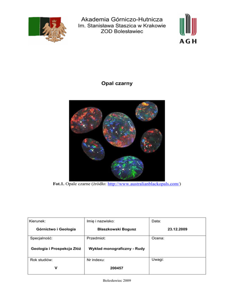 Akademia Górniczo-Hutnicza Im. Stanisława Staszica w Krakowie ZOD Bolesławiec Opal czarny Fot.1. Opale czarne (źródło: http://www.australianblackopals.com/) Kierunek: Imię i nazwisko: Górnictwo i Geologia Specjalność: Rok studiów: Ocena: Wykład monograficzny - Rudy Uwagi: Nr indexu: V 23.12.2009 Błaszkowski Bogusz Przedmiot: Geologia i Prospekcja ZłóŜ Data: 200457 Bolesławiec 2009 SPIS TREŚCI 1 WSTĘP ..................................................................................................................... 3 2 HISTORIA WYDOBYCIA OPALI ........................................................................ 3 3 SKŁAD CHEMICZNY............................................................................................. 3 4 WŁAŚCIWOŚCI FIZYCZNE ............................................................................... 4 5 TYPY ........................................................................................................................ 5 6 ODMIANY ............................................................................................................... 6 7 WYSTĘPOWANIE ................................................................................................... 9 8 NAJSŁYNNIEJSZE CZARNE OPALE ............................................................... 12 9 ZASTOSOWANIE .................................................................................................. 19 LIERATURA........................................................................................................... 20 2 1. WSTĘP NAZWA : z sanskrytu upala – kamień drogocenny, kamień szlachetny. Łacińska nazwa opalus była juŜ uŜywana przez Pliniusza w 77 r. p.n.e. (R. Hutnik, E. Piątek, J. Wierski, M. Sachanbiński, 1984); bądź od gr. opallios (łac. opalus) = widzieć zmianę (barwy) (źródło: http://pl.wikipedia.org wg N. Sobczak, T. Sobczak, 1993). 2. HISTORIA WYDOBYCIA OPALI Opale szlachetne odkryto późno, w staroŜytnej Grecji czasów Arystotelesa nie były jeszcze znane. Wzmianki o jubilerskich opalach pojawiły się pod koniec istnienia staroŜytnej Grecji, kamień ten był dobrze znany Rzymianom, którzy importowali go z Indii i być moŜe z rejonu Dacji – dzisiejszej Rumunii. Co najmniej od XI wieku działały kopalnie wyjątkowej klasy opali szlachetnych na terenie ówczesnych Węgier, a dzisiejszej Słowacji. Kopalnie te zresztą istniały aŜ do 1920, a wiele opali węgierskich zostało włączonych w skład klejnotów cesarskich Habsburgów przechowywanych do dziś w Wiedniu. Po wyczerpaniu się złóŜ indyjskich i węgierskich, odkryto nowe wielkie złoŜa w Meksyku (1857) i Australii (1849, w stanie Queensland), ale eksploatację w obu krajach złóŜ rozpoczęto dopiero pod koniec lat 70. XIX wieku (źródło: http://pl.wikipedia.org). 3. SKŁAD CHEMICZNY OPAL - wzór chemiczny : SiO2xnH2O - uwodniony dwutlenek krzemu Jest to koloidalna krzemionka ze zmienną ilością wody (1-21% H2O), oddawanej w sposób ciągły przy suszeniu i ogrzewaniu. Opal bardzo często nie jest całkowicie koloidalny, badania rentgenowskie wykazały w nim submikroskopowe elementy krystaliczne, najczęściej bywa to β-krystobalit, rzadziej α-krystobalit lub β-trydymit. Wskutek procesu starzenia się, w wyniku którego opal traci wodę, powstaje chalcedon. (R. Hutnik, E. Piątek, J. Wierski, M. Sachanbiński, 1984). 3 4. WŁAŚCIWOŚCI FIZYCZNE BARWA – bezbarwny, białawy, szlachetne odmiany są na ogół zabarwione. Dzięki róŜnym domieszkom, zwłaszcza wskutek obecności Ŝelaza przyjmuje barwy Ŝółte, brunatne, czerwone, róŜowe, zielone, niebieskie lub czarne. Na półprzezroczystych opalach występuje piękna gra barw. To charakterystyczne dla opali szlachetnych zjawisko związane jest z niezwykłą ich budową wewnętrzną. Stwierdzono bowiem, Ŝe opale takie składają się z domen, w obrębie których występują globule krzemionkowe układające się w trójwymiarowo uporządkowaną swoistą „sieć przestrzenną”. Interstycje* między globulami stanowią trójwymiarową siatkę dyfrakcyjną, na której następuje ugięcie światła widzialnego. Od średnicy kuleczek, a zatem odstępów między interstycjami, zaleŜy dlugość fal światła widzialnego mogących uczestniczyć w dyfrakcji, a zatem jakie barwy dostrzega się na opalu (R. Hutnik, E. Piątek, J. Wierski, M. Sachanbiński, 1984). *Interstycje - szczeliny między kryształami POŁYSK – szklisty, perłowy, woskowy. PRZEŁAM – muszlowy. PRZEZROCZYSTOŚĆ – często półprzezroczysty, zwykle przeświecający. RYSA – biała. TWARDOŚĆ – 5,5-6,5 (w skali Mohsa). GĘSTOŚĆ – 1,9-2,3. Znaczne wahania gęstości zaleŜą od zawartości wody. Opal jest minerałem o wyjątkowo niskiej gęstości. ŁUPLIWOŚĆ – brak. POSTAĆ – zwykle występują w zwięzłych szklistych utworach o naciekowej formie zewnętrznej. Tworzy naskorupienia i formy groniaste, kuliste, nerkowate, występuje teŜ w postaci stalaktytowej i w formie Ŝyłek. 4 WŁASNOŚCI OPTYCZNE – opal jest ciałem izotropowym. Współczynnik załamania światła wynosi 1,37-1,46, zaleŜnie od zawartości wody. Niekiedy występuje anormalne podwójne załamanie światła. Niektóre odmiany wykazują charakterystyczne zjawiska optyczne: opalizację, opalescencję, efekt kociego oka, asteryzm. Ze względu na obecność lub brak efektów optycznych opale dzielimy na: opale szlachetne i opale zwyczajne. WIDMA ABSORPCYJNE – brak charakterystycznych pasm absorpcji. UKŁAD KRYSTALOGRAFICZNY – w przeciwieństwie do większości kamieni szlachetnych opal nie jest ciałem krystalicznym, lecz bezpostaciowym. MINERAŁY WSPÓŁWYSTĘPUJACE – chalcedon, kwarc. MINERAŁY PODOBNE – zewnętrznie opal ma duŜo cech wspólnych z chalcedonem, od którego róŜni się mniejszą twardością i zawartością wody. CECHY POZNAWCZE – dla opali charakterystyczne są postacie naciekowe. W płomieniu dmuchawki nie topi