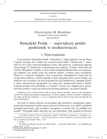 Wrocławskie Studia Wschodnie 15 (2011) Wydawnictwo Uniwersytetu Wrocławskiego Franciszek M. Rosiński Katolicki Uniwersytet Lubelski Jana Pawła II Benedykt Polak — największy polski podróżnik w średniowieczu 1. Wprowadzenie Franciszkanin Benedykt Polak z Wrocławia i legat papieski Jan de Plano Carpini, którego nasz rodak był „towarzyszem udręk i tłumaczem”1, dokonali na owe czasy niewiarygodnego czynu: jako pierwsi, z polecenia papieża Innocentego IV, dotarli po wielomiesięcznej podróży 22 lipca 1246 roku do władcy Mongołów Gujuka w Syra Orda nieopodal Karakorum, nie dysponując mapami, nie znając trasy ani imienia władcy i miejsca jego rezydencji. Misja ta z różnych względów była ryzykowna: Mongołowie znani byli ze swego okrucieństwa, czarna legenda o nich zataczała coraz szersze kręgi, nie zdarzyło się wcześniej, by ktoś pojechał do Azji Środkowej i stamtąd wrócił, a opisy starożytnych geografów nie dotyczyły tamtejszych krain i ludów. Legacja jechała więc poniekąd „w ciemno”, licząc się z najgorszym; poszanowanie posłów wcale nie było powszechną praktyką. Jak pisał Carpini: Lękaliśmy się ze strony Tatarów lub ze strony innych narodów śmierci, albo dozgonnej niewoli lub udręczenia głodem, pragnieniem, mrozem, upałem, obelżywościami i nadmiernymi, jakby ponad siły trudami […], a co z wyjątkiem śmierci lub wiecznej niewoli zdarzało się nam wielokrotnie2. Nie były to obawy płonne, na przykład, gdy poselstwo mongolskie zaproponowało książętom ruskim sojusz przeciw Połowcom, ci je zabili; podobnie postąpili kijowianie, gdy posłańcy mongolscy wezwali ich, by poddali swe miasto3. Przypadki takie zdarzały się i na Zachodzie. Gdy później na dworze 1 J. de Plano Carpini, Historia Mongołów, przeł. S. Młodecki, komentarz T. Jasiński et al., [w:] Spotkanie dwóch światów — Stolica Apostolska a świat mongolski w połowie XIII wieku, red. J. Strzelczyk, Poznań 1993, s. 116. 2 Ibidem. 3 W. Durant, Kulturgeschichte der Menschheit — Das frühe Mittelalter, t. 6, Frankfurt am Main 1981, s. 338. Wrocławskie Studia Wschodnie 15, 2011 © for this edition by CNS Wroc_Stud_Wschodnie15.indb 9 2013-06-10 15:26:41 10 Franciszek M. Rosiński chana zasugerowano legacji papieskiej, że mogliby z nią pojechać posłańcy mongolscy, Carpini wolał dyplomatycznie odmówić: Lękaliśmy się, iż będą szpiegami […], baliśmy się, ażeby ich nie zgładzono, bo przecież nasze ludy w wielkiej części są skłonne do zuchwałej pychy […]. A zwyczajem Tatarów jest nigdy nie zawierać pokoju z tymi ludźmi, którzy zabili ich posłów, ponieważ muszą dokonać na nich zemsty4. Na przykład Dżyngis-chan spustoszył państwo sułtana Chorezmu, gdyż według niego „nie był monarchą, lecz bandytą. Gdyby był praworządnym władcą, nie pozwoliłby zabić w Utrarze moich posłów i kupców. Król bowiem nie morduje posłańców”5. Z materiałów źródłowych zdaje się wynikać, że Innocenty IV w okresie od 1245 roku do 1247 roku wysłał co najmniej cztery poselstwa do Mongolii. Prawie nic nie wiadomo o legacie Wawrzyńcu (Laurentius de Portugalia), któremu papież już 5 marca 1245 roku przekazał list do władcy Mongołów (Dei Patris immensa). Nie wiadomo, czy legacja w ogóle wyruszyła w drogę, być może, iż posłanie papieskie przekazała Carpiniemu. Nie ma też informacji o innej delegacji franciszkańskiej pod przewodem Dominika z Aragonii; możliwe, iż udała się na Wschód, ale niekoniecznie do władcy mongolskiego6. Ale i dominikanie nie chcieli być pominięci w tym zaszczytnym, choć trudnym posłowaniu do Mongołów; jedną z legacji kierował Andrzej z Longjumeau, drugą Ascelin z Cremony, który dokooptował do legacji na Cyprze lub w Akko Szymona z Saint-Quentin. Droga tego poselstwa wiodła przez Akko, Armenię, Gruzję i Persję; dotarło ono 24 maja 1247 roku do obozu wybitnego stratega mongolskiego Bajdżu — późniejszego zdobywcy Bagdadu. Ascelinowi brakowało jednak elementarnej ogłady i zręczności dyplomatycznej, nie okazywał Mongołom należnego szacunku, niepotrzebnie denerwował ich przywódców brakiem taktu w rokowaniach, a także swoim doktrynerstwem i pryncypialnością, dowodząc na przykład wyższości i władzy papieża nad wszystkimi ludźmi; nie przyniósł też żadnych darów dostojnikom mongolskim, odmówił również udania się z posłaniem papieskim do wielkiego chana w Karakorum i przestrzegania ceremoniału mongolskiego, czym „rozwścieczył on do tego stopnia Mongołów, że chcieli go zabić. Jedynie interwencja żon Bajdżu i jednego z jego urzędników ocaliła posłom życie”. Bajdżu przetrzymał ich jednak przez dziewięć tygodni w bardzo złych 4 J. de Plano Carpini, op. cit., s. 172–173. Słowa Dżyngis-chana skierowane do Wahid ud-Dina, przekazane przez Dżuwajniego, cytowane w: Dschingis Khan — Eroberer, Stammesfürst, Vordenker, red. H. Leicht, Düsseldorf 2002, s. 219; F. Mackenzie, Dschingis Khan, Essen 2001, s. 214–215. 6 Sinica Franciscana, t. 1, red. A. van den Wyngaert, Ad Claras Aquas 1929, s. IX–LXI. Według tego autora papież już przed rozpoczęciem soboru lyońskiego wyznaczył cztery legacje do władcy mongolskiego. 5 Wrocławskie Studia Wschodnie 15, 2011 © for this edition by CNS Wroc_Stud_Wschodnie15.indb 10 2013-06-10 15:26:41 Benedykt Polak — największy polski podróżnik w średniowieczu 11 warunkach w swoim obozie, a jego list do papieża był pełen arogancji i gróźb, podobny w tonie do pisma, jakie przywieźli Carpini i Benedykt Polak od Gujuka do Innocentego IV. Pismo Bajdżu wiozło dwóch jego posłów, Aybez i Sargiz (może nestorianin), którzy mieli też przywieźć odpowiedź papieską. Zostali oni przez Innocentego IV przyjęci z dużą życzliwością. Dość fantazyjna relacja z tej podróży przekazana przez Szymona z Saint-Quentin zachowała się w Speculum historiale Wincenteg