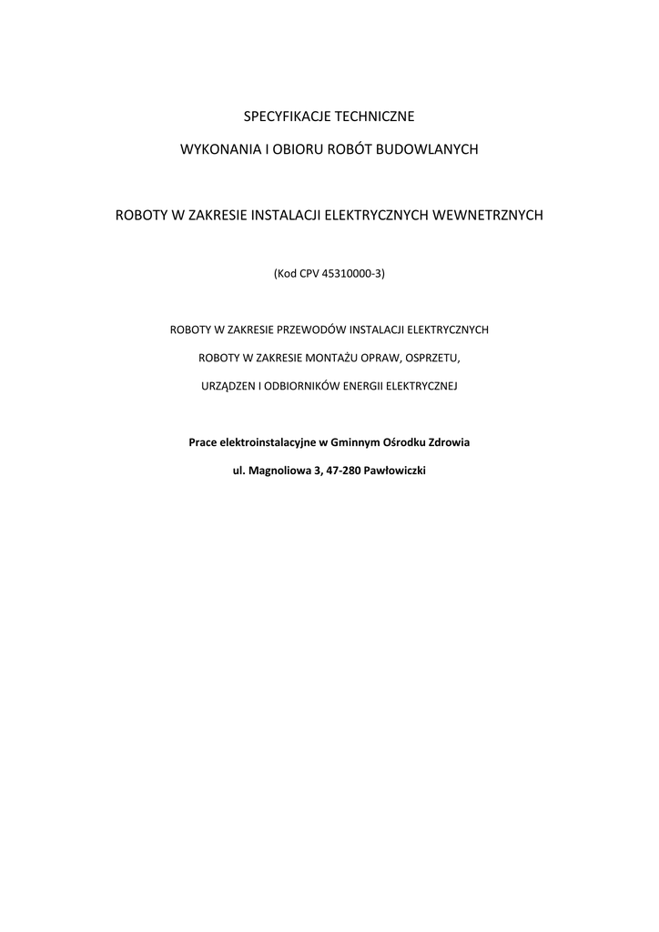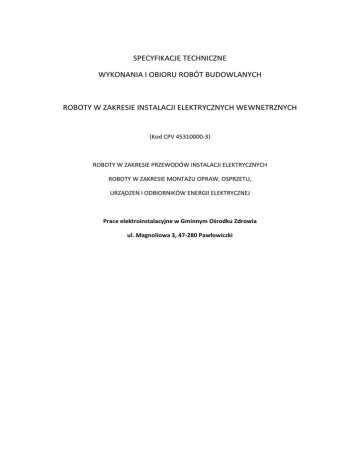 SPECYFIKACJE TECHNICZNE WYKONANIA I OBIORU ROBÓT BUDOWLANYCH ROBOTY W ZAKRESIE INSTALACJI ELEKTRYCZNYCH WEWNETRZNYCH (Kod CPV 45310000-3) ROBOTY W ZAKRESIE PRZEWODÓW INSTALACJI ELEKTRYCZNYCH ROBOTY W ZAKRESIE MONTAŻU OPRAW, OSPRZETU, URZĄDZEN I ODBIORNIKÓW ENERGII ELEKTRYCZNEJ Prace elektroinstalacyjne w Gminnym Ośrodku Zdrowia ul. Magnoliowa 3, 47-280 Pawłowiczki SPIS TRESCI 1. CZĘŚĆ OGÓLNA 1.1.Nazwa nadana zamówieniu przez zamawiającego 1.2.Przedmiot ST 1.3.Zakres stosowania ST 1.4.Przedmiot i zakres robót objętych ST 1.5.Okreslenia podstawowe, definicje 1.6.Ogólne wymagania dotyczące robót 1.7.Dokumentacja robót montażowych 1.8.Nazwy i kody 2. WYMAGANIA DOTYCZACE WŁASCIWOSCI MATERIAŁÓW 3. WYMAGANIA DOTYCZACE SPRZETU, MASZYN I NARZEDZI 4. WYMAGANIA DOTYCZACE TRANSPORTU 5. WYMAGANIA DOTYCZACE WYKONANIA ROBÓT 6. KONTROLA JAKOSCI ROBÓT 7. WYMAGANIA DOTYCZACE PRZEDMIARU I OBMIARU ROBÓT 8. ODBIÓR ROBÓT 9. DOKUMENTY ODNIESIENIA Najważniejsze oznaczenia i skróty: ST – Specyfikacja Techniczna SST – Szczegółowa Specyfikacja Techniczna ITB – Instytut Techniki Budowlanej PZJ – Program Zabezpieczenia Jakości 1. CZESC OGÓLNA 1.1.Nazwa nadana zamówieniu przez zamawiającego Przebudowa instalacji elektrycznej w Gminnym Ośrodku Zdrowia w Pawłowiczkach. 1.2.Przedmiot SST Przedmiotem niniejszej specyfikacji technicznej (SST) są wymagania dotyczące wykonania i odbioru robót związanych z układaniem i montażem elementów instalacji elektrycznej (układanie kabli i przewodów, montaż osprzętu i opraw) w obiektach kubaturowych oraz obiektach budownictwa inżynieryjnego. 1.3.Zakres stosowania SST Specyfikacja techniczna standardowa (SST) stanowi podstawę opracowania specyfikacji technicznej szczegółowej (SST), stosowanej jako dokument przetargowy i kontraktowy przy zlecaniu i realizacji robót wymienionych w pkt. 1.2. Projektant sporządzający dokumentacje projektowa i odpowiednie szczegółowe specyfikacje techniczne wykonania i odbioru robót budowlanych może wprowadzać do niniejszej standardowej specyfikacji zmiany, uzupełnienia lub uściślenia, odpowiednie dla przewidzianych projektem robót, uwzględniające wymagania Zamawiającego oraz konkretne warunki realizacji robót, niezbędne do uzyskania wymaganego standardu i jakości tych robót. Odstępstwa od wymagań podanych w niniejszej specyfikacji mogą mieć miejsce tylko w przypadkach prostych robót o niewielkim znaczeniu, dla których istnieje pewność, że podstawowe wymagania będą spełnione przy zastosowaniu metod wykonania wynikających z doświadczenia oraz uznanych reguł i zasad sztuki budowlanej. 1.4.Przedmiot i zakres robót objętych SST Ustalenia zawarte w niniejszej specyfikacji technicznej (SST) dotyczą zasad wykonywania i odbioru robót związanych z: – układaniem kabli i przewodów elektrycznych, – montażem opraw, osprzętu, urządzeń i odbiorników energii elektrycznej, - montaż rozdzielni zabezpieczeniowych i pomiarowych wraz z przygotowaniem podłoża i robotami towarzyszącymi, dla obiektów kubaturowych oraz obiektów budownictwa inżynieryjnego. SST dotyczy wszystkich czynności mających na celu wykonanie robót związanych z: – wykonaniem wszelkich robót pomocniczych w celu przygotowania podłoża – ułożeniem wszystkich materiałów w sposób i w miejscu zgodnym z dokumentacja techniczna, – wykonaniem oznakowania zgodnego z dokumentacja techniczna wszystkich elementów wyznaczonych w dokumentacji, – wykonaniem oznakowania zgodnego z dokumentacja techniczna wszystkich wyznaczonych rozdzielni, kabli i przewodów, – przeprowadzeniem wymaganych prób i badan oraz potwierdzenie protokołami kwalifikującymi montowany element instalacji elektrycznej. 1.5.Okreslenia podstawowe, definicje Określenia podane w niniejszej specyfikacji technicznej (SST) są zgodne z odpowiednimi normami oraz określeniami podanymi w OST „Wymagania ogólne” Kod CPV 45000000-7, pkt 1.4. a także podanymi poniżej: Specyfikacja techniczna – dokument zawierający zespół cech wymaganych dla procesu wytwarzania lub dla samego wyrobu, w zakresie parametrów technicznych, jakości, wymogów bezpieczeństwa, wielkości charakterystycznych, a także co do nazewnictwa, symboliki, znaków i sposobów oznaczania, metod badan i prób oraz odbiorów i rozliczeń. Aprobata techniczna – dokument stwierdzający przydatność danego wyrobu do określonego obszaru zastosowania. Zawiera ustalenia techniczne co do wymaga podstawowych wyrobu oraz metodykę badan dla potwierdzenia tych wymagań. Deklaracja zgodności – dokument w formie oświadczenia wydany przez producenta, stwierdzający zgodność z kryteriami określonymi odpowiednimi aktami prawnymi, normami, przepisami, wymogami lub specyfikacja techniczna dla danego materiału lub wyrobu. Certyfikat zgodności – dokument wydany przez upoważnioną jednostkę badająca (certyfikujacą), stwierdzający zgodność z kryteriami określonymi odpowiednimi aktami prawnymi, normami, przepisami, wymogami lub specyfikacja techniczna dla badanego materiału lub wyrobu. Cześć czynna – przewód lub inny element przewodzący, wchodzący w skład instalacji elektrycznej lub urządzenia, który w warunkach normalnej pracy instalacji elektrycznej może być pod napięciem a nie spełnia funkcji przewodu ochronnego (przewody ochronne PE i PEN nie są częścią czynną). Połączenia wyrównawcze – elektryczne połączenie części przewodzących dostępnych lub obcych w celu wyrównania potencjału. Kable i przewody – materiały służące do dostarczania energii elektrycznej, sygnałów, impulsów elektrycznych w wybrane miejsce. Osprzęt instalacyjny do kabli i przewodów – zespół materiałów dodatkowych, stosowanych przy układaniu przewodów, ułatwiający ich montaż oraz dotarcie w przypadku awarii, zabezpieczający przed uszkodzeniami, wytyczający trasy ciągów równoległych przewodów itp. Grupy materiałów stanow