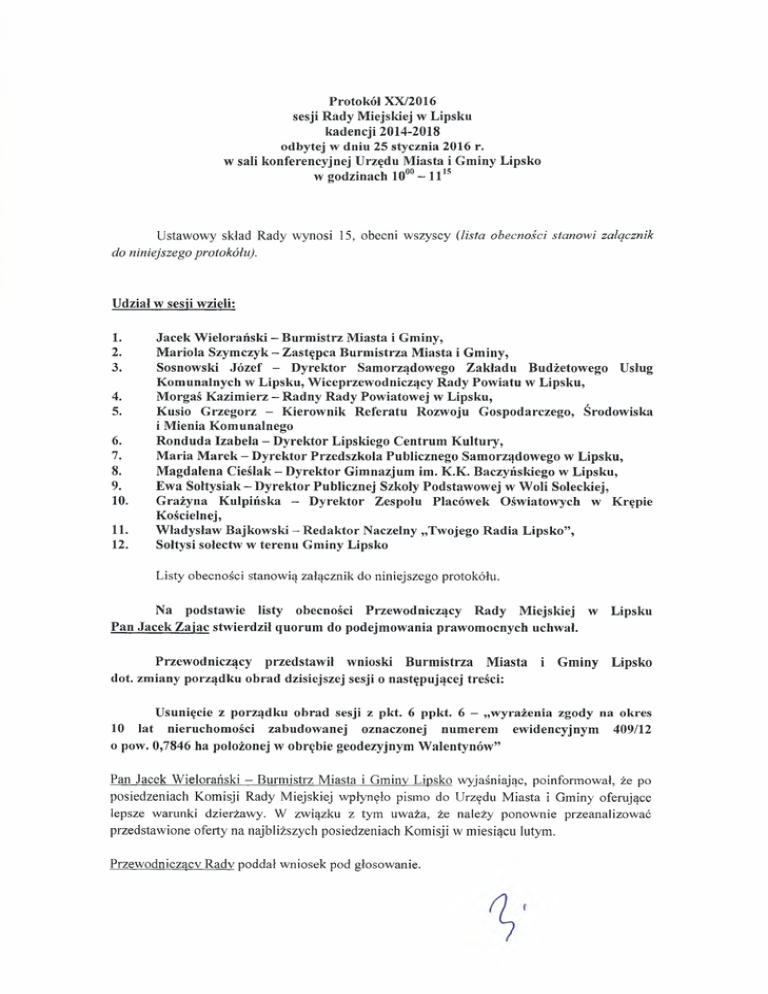 Protokół XX/2016 sesji Rady Miejskiej w Lipsku kadencji 2014-2018 odbytej w dniu 25 stycznia 2016 r. w sali konferencyjnej Urzędu Miasta i Gminy Lipsko w godzinach 10°° - l l 15 Ustawowy skład Rady wynosi 15, obecni wszyscy (lista obecności stanowi załącznik do niniejszego protokółu). Udział w sesji wzięli: 1. 2. 3. 4. 5. 6. 7. 8. 9. 10. 11. 12. Jacek W ielorański - Burmistrz Miasta i Gminy, Mariola Szymczyk - Zastępca Burmistrza Miasta i Gminy, Sosnowski Józef - Dyrektor Samorządowego Zakładu Budżetowego Usług Komunalnych w Lipsku, Wiceprzewodniczący Rady Powiatu w Lipsku, Morgaś Kazimierz - Radny Rady Powiatowej w Lipsku, Kusio Grzegorz - Kierownik Referatu Rozwoju Gospodarczego, Środowiska i Mienia Komunalnego Ronduda Izabela - Dyrektor Lipskiego Centrum Kultury, Maria M arek - Dyrektor Przedszkola Publicznego Samorządowego w Lipsku, Magdalena Cieślak - Dyrektor Gimnazjum im. K.K. Baczyńskiego w Lipsku, Ewa Sołtysiak - Dyrektor Publicznej Szkoły Podstawowej w Woli Soleckiej, Grażyna Kulpióska - Dyrektor Zespołu Placówek Oświatowych w Krępie Kościelnej, W ładysław Bajkowski - Redaktor Naczelny „Twojego Radia Lipsko”, Sołtysi sołectw w terenu Gminy Lipsko Listy obecności stanowią załącznik do niniejszego protokółu. Na podstawie listy obecności Przewodniczący Rady Miejskiej w Pan Jacek Zając stwierdził ąuorum do podejmowania prawomocnych uchwał. Lipsku Przewodniczący przedstawił wnioski Burmistrza Miasta dot. zmiany porządku obrad dzisiejszej sesji o następującej treści: Lipsko i Gminy Usunięcie z porządku obrad sesji z pkt. 6 ppkt. 6 — „wyrażenia zgody na okres 10 lat nieruchomości zabudowanej oznaczonej numerem ewidencyjnym 409/12 o pow. 0,7846 ha położonej w obrębie geodezyjnym W alentynów” Pan Jacek Wielorański - Burmistrz Miasta i Gminy Lipsko wyjaśniając, poinformował, że po posiedzeniach Komisji Rady Miejskiej wpłynęło pismo do Urzędu Miasta i Gminy oferujące lepsze warunki dzierżawy. W związku z tym uważa, że należy ponownie przeanalizować przedstawione oferty na najbliższych posiedzeniach Komisji w miesiącu lutym. Przewodniczący Rady poddał wniosek pod głosowanie. W glosowaniu jawnym jednogłośnie radni przyjęli do realizacji zgłoszony wniosek. Przewodniczący przedstawił kolejne wnioski o wprowadzenie do porządku obrad sesji: Wprowadzenie do punktu 6 ppkt.: 1. 9) ustalenia kryteriów wraz z liczbą punktów w postępowaniu rekrutacyjnym do publicznych szkól podstawowych prowadzonych przez Miasto i Gminę Lipsko, 2. 10) ustalenia kryteriów wraz z liczbą punktów w postępowaniu rekrutacyjnym do publicznych gimnazjów prowadzonych przez Miasto i Gminę Lipsko, 3. 11) wyrażenia woli przekazania nieruchomości niezabudowanej położonej w obrębie geodezyjnym Lipsko. Przewodniczący Rady Pan Jacek Zając poddał pod głosowanie wnioski w kolejności zgłoszenia: W glosowaniu jawnym jednogłośnie radni przyjęli do realizacji wniosek 1. W głosowaniu jawnym jednogłośnie radni przyjęli do realizacji wniosek 2. W głosowaniu jawnym jednogłośnie radni przyjęli do realizacji wniosek 3. W głosowaniu jawnym jednogłośnie radni przyjęli do realizacji następujący porządek posiedzenia: 1. Otwarcie obrad. 2. Przyjęcie protokółu z obrad sesji z dnia 21 grudnia 2015 r. 3. Przyjęcie protokółu z obrad sesji z dnia 30 grudnia 2015 r. 4. Informacja Burmistrza Miasta i Gminy Lipsko na temat działalności w okresie od 21 grudnia 2015 r. do 25 stycznia 2016 r. 5. Interpelacje i wnioski radnych. 6. Podjęcie uchwał w sprawie: 1) Zatwierdzenia planu pracy Rady Miejskiej na rok 2016, 2) Zatwierdzenia planu pracy Komisji Rewizyjnej Rady Miejskiej w Lipsku na rok 2016, 3) Zatwierdzenia planów pracy stałych Komisji Rady Miejskiej na rok 2016, 4) Upoważnienia Burmistrza Miasta i Gminy Lipsko do złożenia wniosku oraz przyjęcia do realizacji przedsięwzięcia pt. „Budowa punktu selektywnej zbiórki odpadów komunalnych w Lipsku”, 5) Upoważnienia Burmistrza Miasta i Gminy Lipsko do złożenia wniosku oraz przyjęcia do realizacji przedsięwzięcia pt. „Budowa kanalizacji sanitarnej w ramach aglomeracji Lipsko”, 6) Ustalenia wysokości diet dla sołtysów, 7) Ustalenia kryteriów wraz z liczbą punktów w postępowaniu rekrutacyjnym do publicznych przedszkoli i oddziałów przedszkolnych w szkołach podstawowych prowadzonych przez Miasto i Gminę Lipsko. 8) Ustalenia kryteriów wraz z liczbą punktów w postępowaniu rekrutacyjnym do publicznych szkół podstawowych prowadzonych przez Miasto i Gminę Lipsko, 9) Ustalenia kryteriów wraz z liczbą punktów w postępowaniu rekrutacyjnym do publicznych gimnazjów prowadzonych przez Miasto i Gminę Lipsko, 10) Wyrażenia woli przekazania nieruchomości niezabudowanej położonej w obrębie geodezyjnym Lipsko. 7. Wnioski i zapytania sołtysów. 8. Wolne wnioski. 2 9. Sprawy różne. 10. Zamknięcie obrad sesji. Ad. 2. W głosowaniu jawnym jednogłośnie radni przyjęli protokół z obrad sesji z dnia 21 grudnia 2015 r. nie zgłaszając żadnych uwag. Ad. 3. W głosowaniu jawnym jednogłośnie radni przyjęli protokół z obrad sesji z dnia 30 grudnia 2015 r. nie zgłaszając żadnych uwag. Ad. 4. Burmistrz Miasta i Gminy Lipsko Pan Jacek Wielorański przedstawił i omówił informację na temat działalności w okresie od 21 grudnia 2015 r. do 25 stycznia 2016 r. Materiał stanowi załącznik do niniejszego protokółu. Ad. 5. Madejski Roman - zwrócił się z zapytaniem czy przekazanie zalewu na Skarb Państwa będzie również obejmowało teren wokół zalewu. Nadmienił, iż to Miasto i Gmina dokonała zagospodarowania terenu. Jacek Wielorański w odpowiedzi - poinformował, że nastąpi przekazanie całości tj. lustro wody wraz z otaczającym terenem i jazem (tamą piętrzącą wodę), celem będzie również odmulenie zalewu. Nadmienił, iż Skarb Państwa nie wykazuje zbytniego zainteresowania przejęciem terenu wokół z