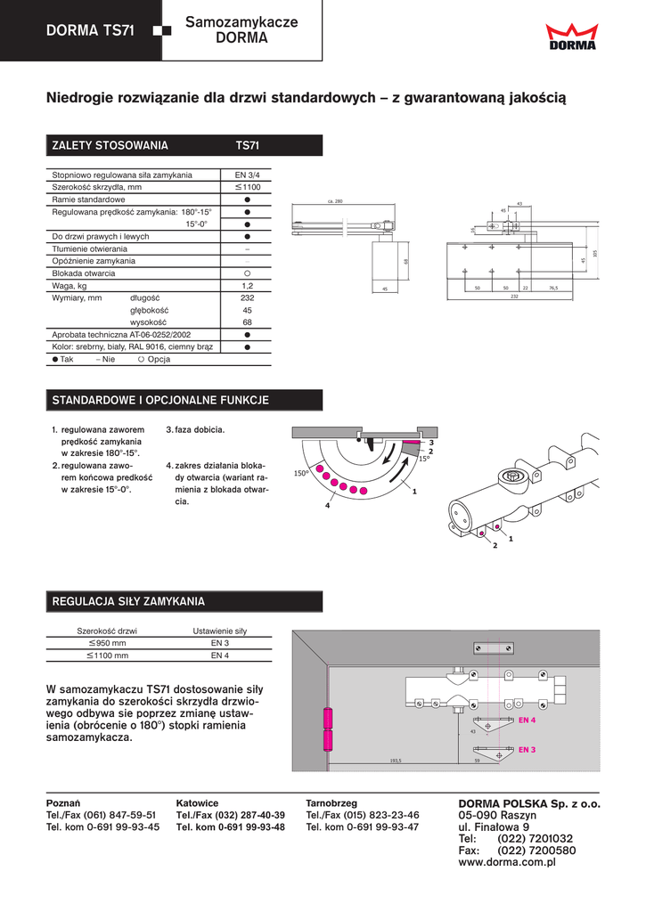 Samozamykacze DORMA DORMA TS71 Niedrogie rozwiązanie dla drzwi standardowych – z gwarantowaną jakością TS71 Ramie standardowe Regulowana prędkość zamykania: 180°-15° 15°-0°5 Do drzwi prawych i lewych Tłumienie otwierania – Opóźnienie zamykania – Blokada otwarcia Waga, kg długość 232 głębokość 45 wysokość 68 Aprobata techniczna AT-06-0252/2002 Kolor: srebrny, biały, RAL 9016, ciemny brąz – Nie 43 45 1,2 Wymiary, mm Tak ca. 280 105 Ł1100 45 EN 3/4 Szerokość skrzydła, mm 16 Stopniowo regulowana siła zamykania 68 ZALETY STOSOWANIA 50 45 50 22 76,5 232 Opcja STANDARDOWE I OPCJONALNE FUNKCJE 1. regulowana zaworem 3. faza dobicia. prędkość zamykania 3 2 15° w zakresie 180°-15°. 2. regulowana zawo- 4. zakres działania bloka- rem końcowa predkość dy otwarcia (wariant ra- w zakresie 15°-0°. mienia z blokada otwarcia. 150° 1 4 2 1 REGULACJA SIŁY ZAMYKANIA Szerokość drzwi Ustawienie siły Ł950 mm EN 3 Ł1100 mm EN 4 W samozamykaczu TS71 dostosowanie siły zamykania do szerokości skrzydła drzwiowego odbywa sie poprzez zmianę ustawienia (obrócenie o 180°) stopki ramienia samozamykacza. EN 4 43 EN 3 193,5 Poznań Tel./Fax (061) 847-59-51 Tel. kom 0-691 99-93-45 Katowice Tel./Fax (032) 287-40-39 Tel. kom 0-691 99-93-48 Tarnobrzeg Tel./Fax (015) 823-23-46 Tel. kom 0-691 99-93-47 59 DORMA POLSKA Sp. z o.o. 05-090 Raszyn ul. Finałowa 9 Tel: (022) 7201032 Fax: (022) 7200580 www.dorma.com.pl Samozamykacze DORMA DORMA TS71 MONTAŻ SAMOZAMYKACZA max 9 45 74 45 15 31 Przykład montażu samozamykacza TS71 do skrzydła drzwiowego dla skrzydła lewego (wg ISO 6), dla skrzydła prawego montaż jest lustrzanym odbiciem (wg ISO 5). 222 38 Montaż po stronie zawiasów. 117 193,5 22 50 50 MONTAŻ SAMOZAMYKACZA �� ������ �� �� ����� ��� �� ��� �� �� Przykład montażu samozamykacza na ościeżnicy dla skrzydła lewego (wg ISO 6), dla skrzydła prawego montaz jest lustrzanym odbiciem (ISO 5). �� Montaż po stronie przeciwnej do zawiasów. �� ��� AKCESORIA DODATKOWE Przykład montażu samozamykacza TS71 z użyciem płytki montażowej (płytka dostępna za dopłatą). 232 160 43 27 68 W opcji dostępna szyna ślizgowa. 16 11 16 16 10 42 65 25 77 f5,5 56 WYPOSAŻENIE STANDARDOWE I AKCESORIA # Samozamykacz oddzielnie Ramię oddzielnie Akcesoria Samozamykacz TS 71 Ramię standardowe 220023xx Kolor srebrny ciemny brąz biały (RAL 9010) biały (RAL 9016) kolor specjalny xx 01 03 10 11 09 Siła EN 3/4 222121xx Ramię z blokadą otwarcia 220025xx Płytka montażowa Kątownik mocujący do montażu równoległego 220021xx 280066xx