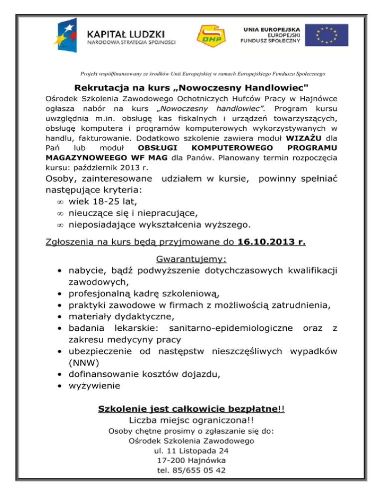 Projekt współfinansowany ze środków rodków Unii Europejskiej w ramach Europejskiego Funduszu Społecznego Rekrutacja na kurs „Nowoczesny „Nowoczesny Handlowiec" Handlowiec Ośrodek Szkolenia Zawodowego Ochotniczych Hufców Pracy w Hajnówce ogłasza nabór na kurs „Nowoczesny „ handlowiec”. Program kursu uwzględnia m.in. obsługę kas fiskalnych i urządzeń towarzyszących, obsługę komputera i programów komputerowych wykorzystywanych w handlu, fakturowanie. Dodatkowo szkolenie zawiera moduł WIZAŻU dla Pań lub moduł OBSŁUGI KOMPUTEROWEGO PROGRAMU MAGAZYNOWEEGO GO WF MAG dla Panów. Planowany termin rozpoczęcia kursu: październik 2013 r. Osoby, zainteresowane udziałem w kursie, powinny spełniać następujące kryteria: • wiek 18-25 lat, • nieuczące się i niepracujące, • nieposiadające wykształcenia wyższego. Zgłoszenia na kurs będą przyjmowane do 16.10.2013 0.2013 r. • • • • • • • • Gwarantujemy: nabycie, bądź podwyższenie dotychczasowych kwalifikacji zawodowych, profesjonalną kadrę szkoleniową, praktyki zawodowe w firmach z możliwością zatrudnienia, materiały dydaktyczne, badania lekarskie: lekarskie sanitarno-epidemiologiczne epidemiologiczne oraz z zakresu medycyny pracy ubezpieczenie od następstw nieszczęśliwych wypadków (NNW) dofinansowanie kosztów dojazdu, wyżywienie Szkolenie jest całkowicie bezpłatne!! bezpłatne Liczba iczba miejsc ograniczona!! Osoby chętne prosimy o zgłaszanie się do: Ośrodek Szkolenia Zawodowego ul. 11 Listopada 24 17-200 Hajnówka tel. 85/655 05 42