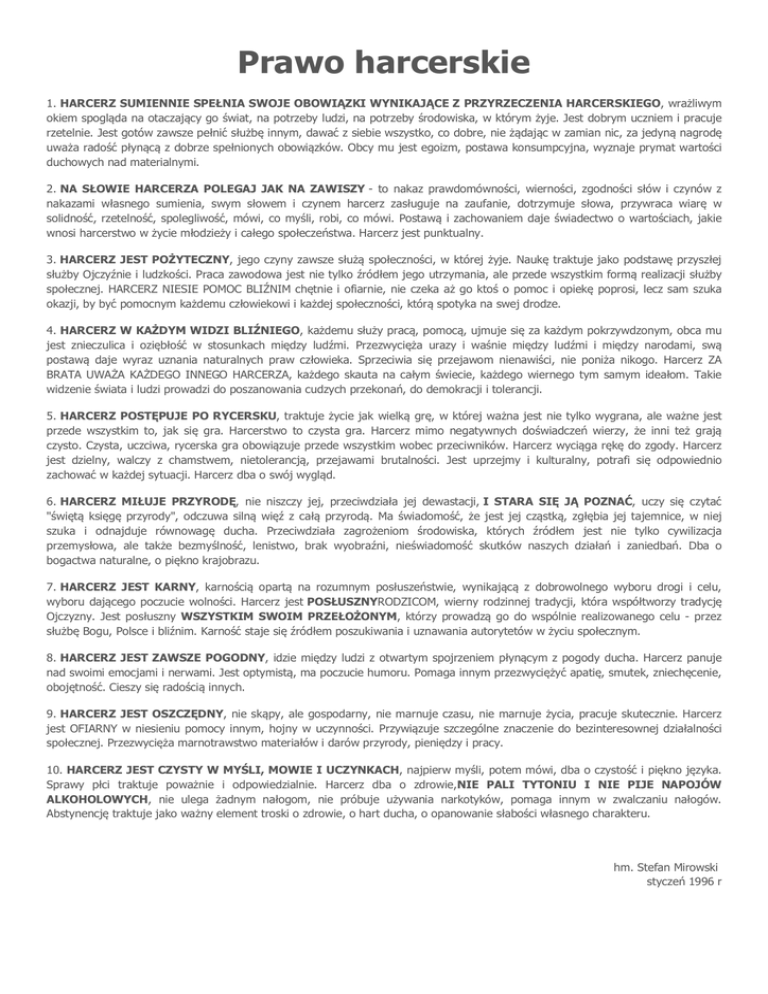 Prawo harcerskie 1. HARCERZ SUMIENNIE SPEŁNIA SWOJE OBOWIĄZKI WYNIKAJĄCE Z PRZYRZECZENIA HARCERSKIEGO, wrażliwym okiem spogląda na otaczający go świat, na potrzeby ludzi, na potrzeby środowiska, w którym żyje. Jest dobrym uczniem i pracuje rzetelnie. Jest gotów zawsze pełnić służbę innym, dawać z siebie wszystko, co dobre, nie żądając w zamian nic, za jedyną nagrodę uważa radość płynącą z dobrze spełnionych obowiązków. Obcy mu jest egoizm, postawa konsumpcyjna, wyznaje prymat wartości duchowych nad materialnymi. 2. NA SŁOWIE HARCERZA POLEGAJ JAK NA ZAWISZY - to nakaz prawdomówności, wierności, zgodności słów i czynów z nakazami własnego sumienia, swym słowem i czynem harcerz zasługuje na zaufanie, dotrzymuje słowa, przywraca wiarę w solidność, rzetelność, spolegliwość, mówi, co myśli, robi, co mówi. Postawą i zachowaniem daje świadectwo o wartościach, jakie wnosi harcerstwo w życie młodzieży i całego społeczeństwa. Harcerz jest punktualny. 3. HARCERZ JEST POŻYTECZNY, jego czyny zawsze służą społeczności, w której żyje. Naukę traktuje jako podstawę przyszłej służby Ojczyźnie i ludzkości. Praca zawodowa jest nie tylko źródłem jego utrzymania, ale przede wszystkim formą realizacji służby społecznej. HARCERZ NIESIE POMOC BLIŹNIM chętnie i ofiarnie, nie czeka aż go ktoś o pomoc i opiekę poprosi, lecz sam szuka okazji, by być pomocnym każdemu człowiekowi i każdej społeczności, którą spotyka na swej drodze. 4. HARCERZ W KAŻDYM WIDZI BLIŹNIEGO, każdemu służy pracą, pomocą, ujmuje się za każdym pokrzywdzonym, obca mu jest znieczulica i oziębłość w stosunkach między ludźmi. Przezwycięża urazy i waśnie między ludźmi i między narodami, swą postawą daje wyraz uznania naturalnych praw człowieka. Sprzeciwia się przejawom nienawiści, nie poniża nikogo. Harcerz ZA BRATA UWAŻA KAŻDEGO INNEGO HARCERZA, każdego skauta na całym świecie, każdego wiernego tym samym ideałom. Takie widzenie świata i ludzi prowadzi do poszanowania cudzych przekonań, do demokracji i tolerancji. 5. HARCERZ POSTĘPUJE PO RYCERSKU, traktuje życie jak wielką grę, w której ważna jest nie tylko wygrana, ale ważne jest przede wszystkim to, jak się gra. Harcerstwo to czysta gra. Harcerz mimo negatywnych doświadczeń wierzy, że inni też grają czysto. Czysta, uczciwa, rycerska gra obowiązuje przede wszystkim wobec przeciwników. Harcerz wyciąga rękę do zgody. Harcerz jest dzielny, walczy z chamstwem, nietolerancją, przejawami brutalności. Jest uprzejmy i kulturalny, potrafi się odpowiednio zachować w każdej sytuacji. Harcerz dba o swój wygląd. 6. HARCERZ MIŁUJE PRZYRODĘ, nie niszczy jej, przeciwdziała jej dewastacji, I STARA SIĘ JĄ POZNAĆ, uczy się czytać "świętą księgę przyrody", odczuwa silną więź z całą przyrodą. Ma świadomość, że jest jej cząstką, zgłębia jej tajemnice, w niej szuka i odnajduje równowagę ducha. Przeciwdziała zagrożeniom środowiska, których źródłem jest nie tylko cywilizacja przemysłowa, ale także bezmyślność, lenistwo, brak wyobraźni, nieświadomość skutków naszych działań i zaniedbań. Dba o bogactwa naturalne, o piękno krajobrazu. 7. HARCERZ JEST KARNY, karnością opartą na rozumnym posłuszeństwie, wynikającą z dobrowolnego wyboru drogi i celu, wyboru dającego poczucie wolności. Harcerz jest POSŁUSZNYRODZICOM, wierny rodzinnej tradycji, która współtworzy tradycję Ojczyzny. Jest posłuszny WSZYSTKIM SWOIM PRZEŁOŻONYM, którzy prowadzą go do wspólnie realizowanego celu - przez służbę Bogu, Polsce i bliźnim. Karność staje się źródłem poszukiwania i uznawania autorytetów w życiu społecznym. 8. HARCERZ JEST ZAWSZE POGODNY, idzie między ludzi z otwartym spojrzeniem płynącym z pogody ducha. Harcerz panuje nad swoimi emocjami i nerwami. Jest optymistą, ma poczucie humoru. Pomaga innym przezwyciężyć apatię, smutek, zniechęcenie, obojętność. Cieszy się radością innych. 9. HARCERZ JEST OSZCZĘDNY, nie skąpy, ale gospodarny, nie marnuje czasu, nie marnuje życia, pracuje skutecznie. Harcerz jest OFIARNY w niesieniu pomocy innym, hojny w uczynności. Przywiązuje szczególne znaczenie do bezinteresownej działalności społecznej. Przezwycięża marnotrawstwo materiałów i darów przyrody, pieniędzy i pracy. 10. HARCERZ JEST CZYSTY W MYŚLI, MOWIE I UCZYNKACH, najpierw myśli, potem mówi, dba o czystość i piękno języka. Sprawy płci traktuje poważnie i odpowiedzialnie. Harcerz dba o zdrowie,NIE PALI TYTONIU I NIE PIJE NAPOJÓW ALKOHOLOWYCH, nie ulega żadnym nałogom, nie próbuje używania narkotyków, pomaga innym w zwalczaniu nałogów. Abstynencję traktuje jako ważny element troski o zdrowie, o hart ducha, o opanowanie słabości własnego charakteru. hm. Stefan Mirowski styczeń 1996 r
