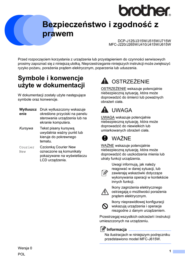 Bezpieczeństwo i zgodność z prawem 1 DCP-J125/J315W/J515W/J715W MFC-J220/J265W/J410/J415W/J615W Przed rozpoczęciem korzystania z urządzenia lub przystąpieniem do czynności serwisowych prosimy zapoznać się z niniejszą ulotką. Nieprzestrzeganie niniejszych instrukcji może zwiększyć ryzyko pożaru, porażenia prądem elektrycznym, poparzenia lub uduszenia. Symbole i konwencje użyte w dokumentacji W dokumentacji zostały użyte następujące symbole oraz konwencje. Wytłuszcz Druk wytłuszczony wskazuje enie określone przyciski na panelu sterowania urządzenia lub na ekranie komputera. Kursywa Courier New Tekst pisany kursywą uwydatnia ważny punkt lub kieruje do pokrewnego tematu. Czcionką Courier New oznaczone są komunikaty pokazywane na wyświetlaczu LCD urządzenia. OSTRZEŻENIE 1 OSTRZEŻENIE wskazuje potencjalnie niebezpieczną sytuację, która może doprowadzić do śmierci lub poważnych obrażeń ciała. UWAGA UWAGA wskazuje potencjalnie niebezpieczną sytuację, która może doprowadzić do niewielkich lub umiarkowanych obrażeń ciała. WAŻNE WAŻNE wskazuje potencjalnie niebezpieczną sytuację, która może doprowadzić do uszkodzenia mienia lub utraty funkcji urządzenia. Uwagi informują, jak należy reagować w danej sytuacji, lub zawierają wskazówki dotyczące wykonywania operacji w kontekście innych funkcji. Ikony zagrożenia elektrycznego ostrzegają o możliwości porażenia prądem elektrycznym. Ikony nieprawidłowej konfiguracji wskazują urządzenia i operacje niezgodne z danym urządzeniem. Przestrzegaj wszystkich ostrzeżeń i instrukcji umieszczonych na urządzeniu. Informacja Na ilustracjach w niniejszym podręczniku przedstawiono model MFC-J615W. Wersja 0 POL 1 Nota dotycząca opracowania i publikacji Niniejszy podręcznik został opracowany i wydany pod nadzorem firmy Brother Industries, Ltd. Zawiera on najnowsze opisy oraz dane techniczne produktu. Treść niniejszego podręcznika oraz dane techniczne produktu podlegają zmianom bez powiadomienia. Firma Brother zastrzega sobie prawo do dokonywania zmian bez powiadomienia w specyfikacjach i dokumentacji zawartych w niniejszym podręczniku oraz nie ponosi odpowiedzialności za żadne szkody (również wynikowe) spowodowane korzystaniem z tych informacji, w tym także za błędy typograficzne i inne, które mogą występować w tej publikacji. 2 1 W celu bezpiecznego użytkowania urządzenia 1 OSTRZEŻENIE NIE umieszczaj urządzenia w pobliżu grzejników, klimatyzatorów, wody, środków chemicznych ani urządzeń, które zawierają magnesy bądź generują pole magnetyczne. Do opakowania urządzenia użyto plastikowych toreb. Aby uniknąć ryzyka uduszenia, torby te należy przechowywać w miejscu niedostępnym dla niemowląt i dzieci. Do czyszczenia wnętrza lub zewnętrznej powierzchni urządzenia NIE należy używać łatwopalnych substancji ani żadnych aerozoli bądź rozpuszczalników organicznych/płynów zawierających alkohol lub amoniak. Patrz Podstawowy Podręcznik Użytkownika. Przez szczeliny w obudowie produktu nie wolno wkładać żadnych przedmiotów, gdyż mogą zetknąć się z punktami pod wysokim napięciem lub spowodować zwarcie elementów, wiążące się z ryzykiem pożaru lub porażenia prądem elektrycznym. Jeżeli do urządzenia dostaną się metalowe przedmioty, woda lub inne ciecze, należy je natychmiast odłączyć od gniazda elektrycznego. Zadzwoń do przedstawiciela firmy Brother lub do działu obsługi klienta. Nigdy nie dotykaj nieizolowanych przewodów ani końcówek telefonicznych, jeśli nie odłączono linii telefonicznej od gniazda ściennego. Nigdy nie instaluj przewodów telefonicznych podczas burzy. Nigdy nie instaluj ściennego gniazda telefonicznego w miejscu wilgotnym (tylko modele MFC). 3 To urządzenie należy podłączyć do znajdującego się w pobliżu uziemionego źródła zasilania o napięciu zgodnym z informacją na etykiecie. NIE dotykaj wtyczki wilgotnymi rękami. Może to spowodować porażenie prądem elektrycznym. Zawsze upewniaj się, że wtyczka została włożona do końca do gniazda. To urządzenie jest wyposażone w trójstykową wtyczkę z uziemieniem. Ta wtyczka będzie pasować tylko do gniazda z uziemieniem. Jest to zabezpieczenie. Jeżeli nie można włożyć wtyczki do gniazda, wezwij elektryka, by wymienił gniazdo przestarzałego typu. NIE używaj uziemionej wtyczki w inny sposób. NIE podłączaj urządzenia do źródła zasilania prądem stałym ani do przemiennika. W razie braku pewności skontaktuj się z wykwalifikowanym elektrykiem. NIE należy podejmować prób samodzielnej naprawy urządzenia, ponieważ otwarcie lub usunięcie pokryw może narazić użytkownika na kontakt z punktami pod wysokim napięciem i wiązać się z innym rodzajem ryzyka, a także może spowodować unieważnienie gwarancji. Zadzwoń do przedstawiciela firmy Brother lub do działu obsługi klienta. UWAGA Połóż urządzenie na płaskiej, stabilnej powierzchni, wolnej od drgań i wstrząsów, na przykład na biurku. Umieść urządzenie w pobliżu gniazda telefonicznego i standardowego uziemionego gniazda elektrycznego. Wybierz suche, dobrze wentylowane miejsce, w którym temperatura utrzymuje się w granicach od 10 °C do 35 °C. Szczeliny i otwory na obudowie z tyłu i na spodzie są otworami wentylacyjnymi. Aby zapewnić poprawne działanie urządzenia oraz zabezpieczyć je przed przegrzaniem, otwory te nie mogą zostać zablokowane ani zasłonięte. 4 Obsługa urządzenia może wiązać się z ryzykiem obrażenia ciała, jeśli pokrywy (zacieniowane) zostaną zamknięte przy użyciu siły. Należy zachować ostrożność, kładąc dłoń w obszarach pokazanych na ilustracjach. 5 NIE przenoś urządzenia, trzymając je za pokrywę skanera lub pokrywę usuwania zacięć. Jeśli urządzenie jest zbytnio rozgrzane, wydziela dym lub silne zapachy albo przypadkowo został na nie wylany płyn, należy je natychmiast odłączyć od gniazda e
