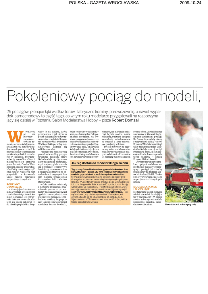 POLSKA - GAZETA WROC£AWSKA 2009-10-24 Pokoleniowy pociąg do modeli, 25 pociągów, płonące łąki wzdłuż torów, fabryczne kominy, parowozownię, a nawet wypa dek samochodowy to część tego, co w tym roku modelarze przygotowali na rozpoczyna jący się dzisiaj w Poznaniu Salon Modelarstwa Hobby - pisze Robert Domżał W tym roku po raz pierwszy zaprezen towana zo stanie makieta kolejowa ma jąca około 100 metrów kwa dratowych powierzchni! To największy hit tegorocznego spotkania polskich modela rzy w Poznaniu. Przygoto wało ją 40 osób z różnych miejscowości od Braniewa przez Poznań, Ostrów Wiel kopolski, Łódź po Tychy i Kra ków. Każdy zrobił swoją część, czyli moduł. Niektóre z nich przywieźli w kartonach. Część trzeba przewozić na specjalnych stojakach. RODZINNY OBOWIĄZEK - Na mojej makiecie mam kilka wysokich obiektów, jak chociażby wieżę ciśnień, ko miny fabryczne, jest też wy soka lokomotywownia, dla tego nie mogę schować jej do płaskiego pudełka. Przy wożę je na stojaku, który przypomina regał używany przez cukierników do prze wozu ciast - wyjaśnia Krzysz tof Młodzikowski z Ostrowa Wielkopolskiego, który mo delarstwem zajmuje się od kilkunastu lat. Pociągi będą poruszały się po makiecie według przygo towanego rozkładu jazdy. Na końcach liczącej 25 m ma kiety będą stacje odstawcze, czyli miejsca, gdzie zmienia się położenie lokomotywy. Modele są odwzorowaniem pociągów.jeżdżących po to rach w latach 1945-1968. Pro jekt makiety przygotowali Przemysław Sell i Mariusz Demkowicz. - Cała makieta składa się z modułów. To fragment o wy miarach 90 cm na 50 cm. Każdy z nich zakończony jest zgodnie z normą, dzięki temu możliwe jest połączenie i roz budowa makiety. Propagato rem takiego rozwiązania jest modelarz Leszek Lewiński, który też będzie w Poznaniu wyjaśnia Przemysław Sell, po znański modelarz. Na wy stawę przygotowuje on aż trzy moduły. Na jednym z nich bę dzie niestrzeżony przejazd ko lejowy oraz pola, a na dwóch kolejnych łuki oraz łąki. Jedna z nich będzie się nawet paliła. Ponieważ ideą modelarstwa jest odwzorowywanie rzeczy wistości, na makiecie zoba czyć będzie można mosty, wiadukty, budynki. Będą też samochody załadowywane na wagony, a także pokonu jące przejazdy kolejowe. Po raz pierwszy na tego roczny salon modelarze obo wiązkowo przyjeżdżają z ca łymi rodzinami. - Przez wiele lat makietę budowała razem Jak się dostać do modelarskiego salonu Tegoroczny Salon Modelarstwa zgromadzi rekordową licz bę wystawców - ponad 120 firm, klubów i indywidualnych modelarzy, przedstawi nowości na rynku modelarskim. MTP przygotowało się również na oblężenie ze strony zwie dzających - w tym roku salon odbędzie się w większych pawi lonach 7, 7A, do których wejście znajduje się od ul. Śniadeckich lub od ul. Głogowskiej. Bilet kosztuje 10 zł, dzieci do lat 3 mają wstęp wolny. Od tego roku, MTP ułatwia zakup biletów, wpro wadzając możliwość zakupu przez internet. Wystarczy wejść na stronę www.hobby.mtp.plhttp://www.hobby.mtp.pl/ i klik nąć na baner „kup bilet wstępu on-line". Dzisiaj kasa jest czynna od godz. 10. do 18., w niedzielę od godz. 10. dol6. Wjazd na teren MTP samochodem kosztuje 10 zt. Oczywiście trzeba posiadać bilet wstępu. ze mną córka. Chodziliśmy też na dworzec w Ostrowie i oglą daliśmy godzinami pociągi. Do Poznania przyjadę z żoną i oczywiście z córką - mówi Krzysztof Młodzikowski. Skąd takie zainteresowanie? Dzia dek był kolejarzem, ojciec był związany z koleją, ja sam pra cuję w firmie, która naprawia tabor kolejowy - dodaje Krzysztof Młodzikowski. Oprócz budowniczych ma kiet, będą też modelarze sa modzielnie budujący lokomo tywy i pociągi, jak choćby mieszkańcy Łodzi Jacek Wy socki i Andrzej Cieślik. Te eks ponaty wystawione zostaną w specjalnych szklanych gab lotach. MODELE LATAJĄCE I PŁYWAJĄCE Modelarze to jednak nie tylko wielbiciele kolei. Dzisiaj i ju tro w pawilonach 7 i 7A będzie można zobaczyć też modele kosmiczne, morskie, samo chodowe i lotnicze. • V Na makietach zobaczymy całą «s POLSKA - GAZETA WROC£AWSKA 2009-10-24 nie tylko tych kolejowych i infrastrukturę kolejową. Modele są odwzorowaniem pociągów, jeżdżących po torach w latach 1945-1968 Po raz pierwszy w barwach Aeroklubu Poznańskiego zaprezentują się modelarze lotniczy. Wszystkie samolo ty, jakie pokażą, są zdal nie sterowane. Pilotuje je za wodnik znajdujący się na ziemi. - Wystawimy m.in. zlina 242, pipera, spitfire'a z cza sów II wojny i modele akrobacyjne o rozpiętości skrzydeł do 3 metrów. Ryszard Kuszak przedstawi samolot o nazwie Wicherek. Skrzydła tego sa molotu mają 4,6 metra roz piętości i jest to największy latający model. Ponadto bę dzie można zobaczyć odrzu towiec napędzany modelar skim silnikiem odrzutowym - mówi Jacek Nowak, prze wodniczący sekcji modelar skiej Aeroklubu Poznań skiego. Usatysfakcjonowani po winni być też wodniacy. Tego roczną nowością będzie dużo większy niż dotąd basen dla modeli pływających. Będzie on miał około 150 metrów kwadratowych. -To dlatego, że rośnie zain teresowanie tą imprezą. Z ro ku na rok przychodzi coraz więcej rodzin - mówi Wioleta Aleksandrowicz z zespołu promocji MTP. Modelarstwo to bardzo wartościowy sposób spędze nia wolnego czasu - kształ tuje zdolności manualne, wytrwałość i precyzję. Roz wija umiejętności politech niczne niezbędne przy budo waniu modeli i pojazdów zdalnie sterowanych. Więk szość prac to rzeczywiste re pliki - przed ich wykonaniem modelarze studiują dawne dokumenty, plany i projekty konstrukcji, śledzą historię pierwowzorów modeli. Wielu więc modelarzy to nie tylko ludzie o przysłowiowych „złotych rączkach", czyli po trafiący niejedno naprawić i skonstruować, ale też posia dający sporą wiedzę i wspa niale opowiadający o swoje pasji. -