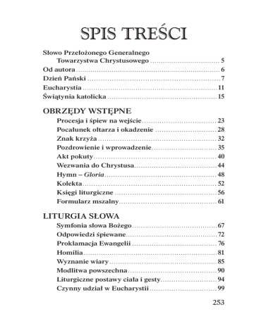 SPIS TREŚCI Słowo Przełożonego Generalnego Towarzystwa Chrystusowego . . . . . . . . . . . . . . . . . . . . . . . . . . . . . . . . . 5 Od autora . . . . . . . . . . . . . . . . . . . . . . . . . . . . . . . . . . . . . . . . . . . . . . . . . . . . . . . . . . . . . . . . . . . . . 6 Dzień Pański . . . . . . . . . . . . . . . . . . . . . . . . . . . . . . . . . . . . . . . . . . . . . . . . . . . . . . . . . . . . 7 Eucharystia . . . . . . . . . . . . . . . . . . . . . . . . . . . . . . . . . . . . . . . . . . . . . . . . . . . . . . . . . . . . . . . . 11 Świątynia katolicka . . . . . . . . . . . . . . . . . . . . . . . . . . . . . . . . . . . . . . . . . . . . . . . . . . . 15 OBRZĘDY WSTĘPNE Procesja i śpiew na wejście . . . . . . . . . . . . . . . . . . . . . . . . . . . . . . . . . . 23 Pocałunek ołtarza i okadzenie . . . . . . . . . . . . . . . . . . . . . . . . . . . . 28 Znak krzyża . . . . . . . . . . . . . . . . . . . . . . . . . . . . . . . . . . . . . . . . . . . . . . . . . . . . . . 32 Pozdrowienie i wprowadzenie . . . . . . . . . . . . . . . . . . . . . . . . . . . . . . 35 Akt pokuty . . . . . . . . . . . . . . . . . . . . . . . . . . . . . . . . . . . . . . . . . . . . . . . . . . . . . . . . 40 Wezwania do Chrystusa . . . . . . . . . . . . . . . . . . . . . . . . . . . . . . . . . . . . . . 44 Hymn – Gloria . . . . . . . . . . . . . . . . . . . . . . . . . . . . . . . . . . . . . . . . . . . . . . . . . . . 48 Kolekta . . . . . . . . . . . . . . . . . . . . . . . . . . . . . . . . . . . . . . . . . . . . . . . . . . . . . . . . . . . . . 52 Księgi liturgiczne . . . . . . . . . . . . . . . . . . . . . . . . . . . . . . . . . . . . . . . . . . . . . . . 56 Formularz mszalny . . . . . . . . . . . . . . . . . . . . . . . . . . . . . . . . . . . . . . . . . . . . . 61 LITURGIA SŁOWA Symfonia słowa Bożego . . . . . . . . . . . . . . . . . . . . . . . . . . . . . . . . . . . . . . . . 67 Odpowiedzi śpiewane . . . . . . . . . . . . . . . . . . . . . . . . . . . . . . . . . . . . . . . . . . . 72 Proklamacja Ewangelii . . . . . . . . . . . . . . . . . . . . . . . . . . . . . . . . . . . . . . . 76 Homilia . . . . . . . . . . . . . . . . . . . . . . . . . . . . . . . . . . . . . . . . . . . . . . . . . . . . . . . . . . . . . . 81 Wyznanie wiary . . . . . . . . . . . . . . . . . . . . . . . . . . . . . . . . . . . . . . . . . . . . . . . . . . 85 Modlitwa powszechna . . . . . . . . . . . . . . . . . . . . . . . . . . . . . . . . . . . . . . . . . 90 Liturgiczne postawy ciała i gesty. . . . . . . . . . . . . . . . . . . . . . . . . . 94 Czynny udział w Eucharystii . . . . . . . . . . . . . . . . . . . . . . . . . . . . . . . 99 253 LITURGIA EUCHARYSTYCZNA Procesja z darami . . . . . . . . . . . . . . . . . . . . . . . . . . . . . . . . . . . . . . . . . . . . . 105 Przygotowanie darów . . . . . . . . . . . . . . . . . . . . . . . . . . . . . . . . . . . . . . . . . . 109 Modlitwa eucharystyczna – ośrodkiem i szczytem całej celebracji . . . . . . . . . . . . 113 Dialog, prefacja i Sanctus. . . . . . . . . . . . . . . . . . . . . . . . . . . . . . . . . . . 118 Kanon rzymski . . . . . . . . . . . . . . . . . . . . . . . . . . . . . . . . . . . . . . . . . . . . . . . . . . . . 123 Pierwsza modlitwa eucharystyczna . . . . . . . . . . . . . . . . . . . . . . . 127 Kanon Hipolita . . . . . . . . . . . . . . . . . . . . . . . . . . . . . . . . . . . . . . . . . . . . . . . . 132 Kanon otwartości na świat . . . . . . . . . . . . . . . . . . . . . . . . . . . . . . . . 137 Kanon historii zbawienia . . . . . . . . . . . . . . . . . . . . . . . . . . . . . . . . . . 142 Piąta modlitwa eucharystyczna . . . . . . . . . . . . . . . . . . . . . . . . . . . 147 Bóg kieruje swoim Kościołem . . . . . . . . . . . . . . . . . . . . . . . . . . . . 151 Jezus naszą Drogą . . . . . . . . . . . . . . . . . . . . . . . . . . . . . . . . . . . . . . . . . . . . 155 Chrystus wzorem miłości . . . . . . . . . . . . . . . . . . . . . . . . . . . . . . . . . . 159 Kościół na drodze ku jedności . . . . . . . . . . . . . . . . . . . . . . . . . . . 163 Pojednanie jako powrót do Ojca . . . . . . . . . . . . . . . . . . . . . . . . 167 Pojednanie z Bogiem fundamentem ludzkiej zgody . . . . . . . . . . . . . . . . . . . . . . . 171 Bóg naszym Ojcem . . . . . . . . . . . . . . . . . . . . . . . . . . . . . . . . . . . . . . . . . . . 175 Bóg nas miłuje . . . . . . . . . . . . . . . . . . . . . . . . . . . . . . . . . . . . . . . . . . . . . . . . . 180 Dziękujemy Ci, Boże . . . . . . . . . . . . . . . . . . . . . . . . . . . . . . . . . . . . . . . . . . 184 Najmłodszy uczestnik liturgii . . . . . . . . . . . . . . . . . . . . . . . . . . . . 188 Amen . . . . . . . . . . . . . . . . . . . . . . . . . . . . . . . . . . . . . . . . . . . . . . . . . . . . . . . . . . . . . . . . 193 Modlitwa Pańska, embolizm i doksologia . . . . . . . . . . . . 198 Obrzęd pokoju . . . . . . . . . . . . . . . . . . . . . . . . . . . . . . . . . . . . . . . . . . . . . . . . . . . 203 Łamanie chleba i zmieszanie Postaci . . . . . . . . . . . . . . . . . . 208 Spożycie Postaci eucharystycznych . . . . . . . . . . . . . . . . . . . . . 213 Komunia Święta wiernych świeckich . . . . . . . . . . . . . . . . . . 218 254 „Skosztujcie i zobaczcie, jak dobry jest Pan…” . . . . . . 223 Śpiew, dziękczynienie i modlitwa . . . . . . . . . . . . . . . . . . . . . . . . 228 Służba liturgiczna – ministrant . . . . . . . . . . . . . . . . . . . . . . . . . . . 232 Muzyka sakralna w liturgii . . . . . . . . . . . . . . . . . . . . . . . . . . . . . . . . . 236 OBRZĘDY ZAKOŃCZENIA Błogosławieństwo i rozesłanie . . . . . . . . . . . . . . . . . . . . . . . . . . . . . 243 Eucharystia z jutrznią lub nieszporami . . . . . . . . . . . . . . . 248 255