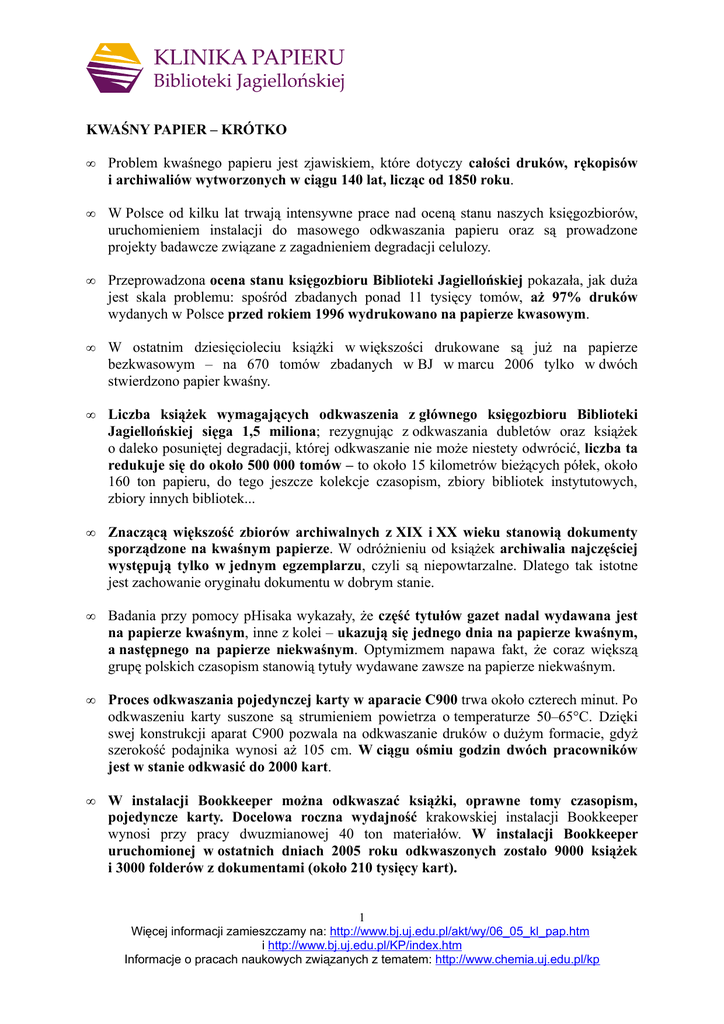 KWAŚNY PAPIER – KRÓTKO • Problem kwaśnego papieru jest zjawiskiem, które dotyczy całości druków, rękopisów i archiwaliów wytworzonych w ciągu 140 lat, licząc od 1850 roku. • W Polsce od kilku lat trwają intensywne prace nad oceną stanu naszych księgozbiorów, uruchomieniem instalacji do masowego odkwaszania papieru oraz są prowadzone projekty badawcze związane z zagadnieniem degradacji celulozy. • Przeprowadzona ocena stanu księgozbioru Biblioteki Jagiellońskiej pokazała, jak duża jest skala problemu: spośród zbadanych ponad 11 tysięcy tomów, aż 97% druków wydanych w Polsce przed rokiem 1996 wydrukowano na papierze kwasowym. • W ostatnim dziesięcioleciu książki w większości drukowane są już na papierze bezkwasowym – na 670 tomów zbadanych w BJ w marcu 2006 tylko w dwóch stwierdzono papier kwaśny. • Liczba książek wymagających odkwaszenia z głównego księgozbioru Biblioteki Jagiellońskiej sięga 1,5 miliona; rezygnując z odkwaszania dubletów oraz książek o daleko posuniętej degradacji, której odkwaszanie nie może niestety odwrócić, liczba ta redukuje się do około 500 000 tomów – to około 15 kilometrów bieżących półek, około 160 ton papieru, do tego jeszcze kolekcje czasopism, zbiory bibliotek instytutowych, zbiory innych bibliotek... • Znaczącą większość zbiorów archiwalnych z XIX i XX wieku stanowią dokumenty sporządzone na kwaśnym papierze. W odróżnieniu od książek archiwalia najczęściej występują tylko w jednym egzemplarzu, czyli są niepowtarzalne. Dlatego tak istotne jest zachowanie oryginału dokumentu w dobrym stanie. • Badania przy pomocy pHisaka wykazały, że część tytułów gazet nadal wydawana jest na papierze kwaśnym, inne z kolei – ukazują się jednego dnia na papierze kwaśnym, a następnego na papierze niekwaśnym. Optymizmem napawa fakt, że coraz większą grupę polskich czasopism stanowią tytuły wydawane zawsze na papierze niekwaśnym. • Proces odkwaszania pojedynczej karty w aparacie C900 trwa około czterech minut. Po odkwaszeniu karty suszone są strumieniem powietrza o temperaturze 50–65°C. Dzięki swej konstrukcji aparat C900 pozwala na odkwaszanie druków o dużym formacie, gdyż szerokość podajnika wynosi aż 105 cm. W ciągu ośmiu godzin dwóch pracowników jest w stanie odkwasić do 2000 kart. • W instalacji Bookkeeper można odkwaszać książki, oprawne tomy czasopism, pojedyncze karty. Docelowa roczna wydajność krakowskiej instalacji Bookkeeper wynosi przy pracy dwuzmianowej 40 ton materiałów. W instalacji Bookkeeper uruchomionej w ostatnich dniach 2005 roku odkwaszonych zostało 9000 książek i 3000 folderów z dokumentami (około 210 tysięcy kart). 1 Więcej informacji zamieszczamy na: http://www.bj.uj.edu.pl/akt/wy/06_05_kl_pap.htm i http://www.bj.uj.edu.pl/KP/index.htm Informacje o pracach naukowych związanych z tematem: http://www.chemia.uj.edu.pl/kp WPR „Kwaśny Papier” 2000–2008 Kalendarium STYCZEŃ 1998 Kraków UJ: na ręce premiera Rzeczypospolitej Polskiej przesłano memoriał „O potrzebie ratowania dziedzictwa kultury polskiej w zbiorach bibliotecznych i archiwalnych XIX i XX wieku” (autorzy: A. Barański, J. Grochowski, A. Manikowski, D. Nałęcz, K. Zamorski). LISTOPAD 1999 Warszawa: Rada Ministrów ustanawia Wieloletni Program Rządowy na lata 2000– 2008 „Kwaśny Papier. Ratowanie w skali masowej zagrożonych polskich zasobów bibliotecznych i archiwalnych”. PAŹDZIERNIK 2003 Kraków UJ pierwsza w Polsce aparatura do odkwaszania pojedynczych kart papieru (model C 900 firmy Neschen) została uruchomiona. GRUDZIEŃ 2005 Kraków UJ: pierwsza w Polsce instalacja do odkwaszania książek (Bookkeeper III firmy Preservation Technology) została uruchomiona. KWIECIEŃ–MAJ 2006 Warszawa: Biblioteka Narodowa zamierza zakupić instalację do masowego odkwaszania druków. Postępowanie przetargowe trwa. Instytucje uczestniczące w WPR Kwaśny Papier: > Biblioteka Narodowa, Warszawa (koordynator), > Uniwersytet Jagielloński, Kraków, > Uniwersytet im. Mikołaja Kopernika, Toruń, > Naczelna Dyrekcja Archiwów Państwowych, Warszawa, > Instytut Celulozowo-Papierniczy, Łódź. Jednostka wiodąca na szczeblu rządowym: Ministerstwo Kultury i Dziedzictwa Narodowego. Finansowanie WPR Kwaśny Papier (wszystkie koszty podane są w mln zł) Koszty realizacji WPR w Polsce w latach 2000–2008: Zgodnie z pierwotną wersją programu – 81,3 Po korekcie dokonanej w roku 2003 – 77,7 Koszty realizacji WPR w Uniwersytecie Jagiellońskim poniesione w latach 2000–2005: Inwestycje: nowy budynek przy Bibliotece Jagiellońskiej, prace remontowe na Wydziale Chemii UJ, aparatura naukowa, aparatura do prac konserwatorskich, instalacja do odkwaszania dokumentów C 900, instalacja do odkwaszania książek Bookkeeper – 12,1 Kształcenie młodej kadry naukowej – 0,5 Szkolenie personelu bibliotek – 0,3 Planowane na lata 2006–2008 – 6,5 2 Więcej informacji zamieszczamy na: http://www.bj.uj.edu.pl/akt/wy/06_05_kl_pap.htm i http://www.bj.uj.edu.pl/KP/index.htm Informacje o pracach naukowych związanych z tematem: http://www.chemia.uj.edu.pl/kp