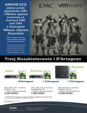 ARROW ECS jedyny polski dystrybutor EMC i VMware ogłasza promocja na macierze EMC serii VNX z licencjami VMware vSphere Essentials EMC wprowadza do oferty nową rodzinę uniwersalnych systemów pamięci masowej klasy średniej Nowa rodzina systemów EMC VNX oferuje przełomową efektywność, prostotę, wydajność i niską cenę ― systemy z tej rodziny są 3-krotnie szybsze, efektywniejsze i prostsze Trzej Muszkieterowie i D’Artagnan Aramis Atos Portos +D’Artagnan + D’Artagnan + D’Artagnan EMC VNXe 3100, 1 kontroler 6x2TB NL SAS + VMware vSphere Essentials EMC VNXe 3100, 2 kontrolery 6x300GB SAS 15k + VMware vSphere Essentials EMC VNX 5300, 2 kontrolery 8x300GB SAS 10k + VMware vSphere Essentials 6.300 EURO* 7,500 EURO* 15.900 EURO* + 3700 EURO dopłata do pakietu VMware vSphere Essentials Plus *cena jest ważna po rejestracji projektu przez partnera Arrow ECS Sp. z o.o. Oferta ważna do 23 grudnia 2011 Ceny w EURO netto Arrow ECS Sp. z o.o. ul. Stawowa 119, 31-346 Kraków tel. +48 12 616 43 00, fax +48 12 616 43 01 e-mail: [email protected], www.arrowecs.pl P Trzej Muszkieterowie i D’Artagnan Nazwa Systemy z tej serii oferują wyjątkowe korzyści, w tym możliwość: udostępnienia w niecałe 2 minuty pamięci masowej do obsługi setek skrzynek pocztowych serwera Microsoft Exchange Server lub magazynu danych VMware o pojemności 1 TB; automatycznego dwukrotnego zwiększenia wskaźnika wykorzystania pojemności pamięci masowej za pomocą zaawansowanych technologii redukcji ilości danych; automatycznego uzyskiwania jednym kliknięciem myszki informacji diagnostycznych i niezbędnych do udzielenia pomocy technicznej. Nowa seria systemów VNX zapewnia 3-krotnie większą wydajność i efektywność oraz 3-krotnie łatwiejsze zarządzanie rozwiązaniami korporacyjnymi klasy średniej, gwarantując klientom: 3-krotnie szybsze działanie systemu Microsoft SQL Server; 3-krotnie szybszą obsługę transakcji Oracle OLTP; dokonanie w ciągu 8 minut rozruchu 500 wirtualnych komputerów biurkowych; ograniczenie nużącego administrowania serwerem SQL oraz jego dostrajania do kilku godzin tygodniowo; 3-krotne zwiększenie efektywności wykorzystania pojemności pamięci masowej za pomocą pakietu EMC FAST, kompresji i deduplikacji plików ATOS PORTOS ARAMIS Parametry EMC VNXe 3100 6x2TB NL SAS EMC VNXe 3100 6x300GB SAS 15k Kontrolery 1 kontroler 2 kontrolery 2 kontrolery NFS, CIFS, MPFS, pNFS, FC Protokoły NFS, CIFS, iSCSI NFS, CIFS, iSCSI Oprogramowanie Unisphere Local Protection Suite File Deduplication with Compression Thin Provisioning Unisphere File Deduplication with Compression Thin Provisioning 3 lata 3 lata Gwarancja na urządzenie D’ARTAGNAN EMC VNX 5300 8x300GB SAS 10k Unisphere 3 lata VMware VSphere Essential Bundle – zawiera (vCenter Server Foundation i ESX lub ESXi dla 3 hostów, maks do 6 core per CPU, Service&Subscription Essentials – 1 rok) Najważniejsze informacje o produktach z serii VNXe Zaawansowane kreatory umożliwiające udostępnianie zależnie od potrzeb aplikacji, co radykalnie upraszcza administrowanie, w tym także obsługę systemów Microsoft Exchange i Microsoft Hyper-V. Kompaktowa obudowa o wysokości 2U lub 3U, dzięki której system ten wkomponuje się znakomicie w prawie każde środowisko. Wbudowana obsługa pamięci masowej opartej na plikach (CIFS, NFS) i na blokach (iSCSI). Konstrukcja pozbawiona punktów podatności na awarie. Wbudowane funkcje ochrony danych, w tym funkcja replikacji. Zaawansowane funkcje zapewniające efektywność, w tym technologia dynamicznego przydzielania zasobów (tzw. thin provisioning), funkcja deduplikacji plików oraz technologia kompresji. Zintegrowana funkcja samopomocy oraz pomocy technicznej automatyzująca i przyspieszająca rozwiązywanie problemów. Zaawansowana obsługa napędów SAS i Nearline SAS o przepustowości 6 Gb/s. Skalowalność do poziomu 120 napędów dyskowych (240 TB). Najważniejsze informacje o produktach z serii VNX Łączą najlepsze na rynku możliwości systemów EMC CLARiiON i EMC Celerra w jedną ujednoliconą platformę o wydajności 3-krotnie większej od oferowanej przez poprzednie generacje systemów. Systemy oparte na technologii procesorów wielordzeniowych Intel Xeon 5600, które zapewniają maksymalną przepustowość rozwiązania. Najbardziej zaawansowane w branży oprogramowanie do zarządzania warstwami pamięci masowej (FAST VP). Jedyne rozwiązanie pamięci masowej oferujące zautomatyzowane zarządzanie warstwami pamięci masowej na poziomie plików i bloków z możliwością przenoszenia między warstwami fragmentów jednostek LUN za pomocą oprogramowania FAST VP oraz zarządzanie zaawansowanym, możliwym do rozbudowy buforem systemowym za pomocą oprogramowania FAST Cache. Obsługa napędów dyskowych SAS, Nearline SAS i SSD o przepustowości 6 Gb/s. Skalowanie do poziomu 2 PB na system (1000 napędów). Obsługa wielu protokołów i typów danych, w tym: FC, iSCSI, FCoE, NFS, CIFS, SOAP i REST. technologia WWW.ADATUM.COM Arrow ECS Sp. z o.o. z siedzibą w Krakowie, adres: ul. Stawowa 119, 31-346 Kraków, wpisana do Krajowego Rejestru Sądowego - Rejestru Przedsiębiorców pod numerem 0000030756, której dokumentacja rejestrowa jest przechowywana przez Sąd Rejonowy dla Krakowa-Śródmieścia, Wydział XI Gospodarczy Krajowego Rejestru Sądowego, NIP 678-26-82-866, z kapitałem zakładowym w wysokości 2.000.000 PLN