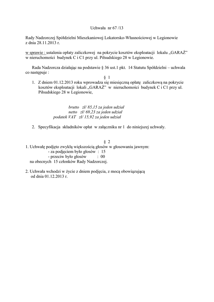 Uchwała nr 67 /13 Rady Nadzorczej Spółdzielni Mieszkaniowej Lokatorsko-Własnościowej w Legionowie z dnia 28.11.2013 r. w sprawie : ustalenia opłaty zaliczkowej na pokrycie kosztów eksploatacji lokalu „GARAŻ” w nieruchomości budynek C i C1 przy ul. Piłsudskiego 28 w Legionowie. Rada Nadzorcza działając na podstawie § 36 ust.1 pkt. 14 Statutu Spółdzielni – uchwala co następuje : § 1 1. Z dniem 01.12.2013 roku wprowadza się miesięczną opłatę zaliczkową na pokrycie kosztów eksploatacji lokali „GARAŻ” w nieruchomości budynek C i C1 przy ul. Piłsudskiego 28 w Legionowie, brutto zł/ 85,15 za jeden udział netto zł/ 69,23 za jeden udział podatek VAT zł/ 15,92 za jeden udział 2. Specyfikacja składników opłat w załączniku nr 1 do niniejszej uchwały. § 2 1. Uchwałę podjęto zwykłą większością głosów w głosowaniu jawnym: - za podjęciem było głosów : 15 - przeciw było głosów : 00 na obecnych 15 członków Rady Nadzorczej. 2. Uchwała wchodzi w życie z dniem podjęcia, z mocą obowiązującą od dnia 01.12.2013 r.