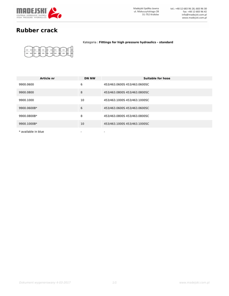 Rubber crack Kategoria : Fittings for high pressure hydraulics - standard Article nr DN NW Suitable for hose 9900.0600 6 453/463.0600S 453/463.0600SC 9900.0800 8 453/463.0800S 453/463.0800SC 9900.1000 10 453/463.1000S 453/463.1000SC 9900.0600B* 6 453/463.0600S 453/463.0600SC 9900.0800B* 8 453/463.0800S 453/463.0800SC 9900.1000B* 10 453/463.1000S 453/463.1000SC * available in blue - - Dokument wygenerowany 4-03-2017 1/1 www.madejski.com.pl