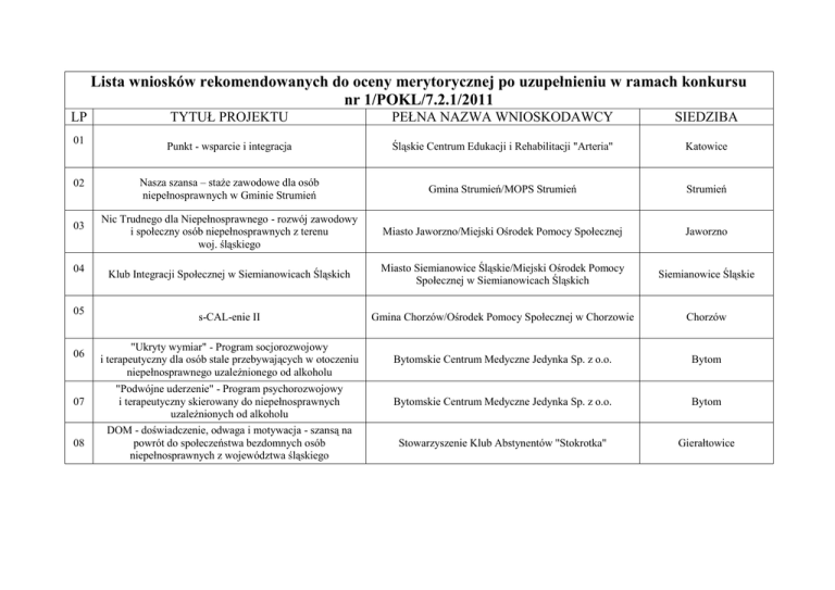 Lista wniosków rekomendowanych do oceny merytorycznej po uzupełnieniu w ramach konkursu nr 1/POKL/7.2.1/2011 TYTUŁ PROJEKTU PEŁNA NAZWA WNIOSKODAWCY SIEDZIBA Punkt - wsparcie i integracja Śląskie Centrum Edukacji i Rehabilitacji "Arteria" Katowice 02 Nasza szansa – staże zawodowe dla osób niepełnosprawnych w Gminie Strumień Gmina Strumień/MOPS Strumień Strumień 03 Nic Trudnego dla Niepełnosprawnego - rozwój zawodowy i społeczny osób niepełnosprawnych z terenu woj. śląskiego Miasto Jaworzno/Miejski Ośrodek Pomocy Społecznej Jaworzno 04 Klub Integracji Społecznej w Siemianowicach Śląskich Miasto Siemianowice Śląskie/Miejski Ośrodek Pomocy Społecznej w Siemianowicach Śląskich Siemianowice Śląskie s-CAL-enie II Gmina Chorzów/Ośrodek Pomocy Społecznej w Chorzowie Chorzów "Ukryty wymiar" - Program socjorozwojowy i terapeutyczny dla osób stale przebywających w otoczeniu niepełnosprawnego uzależnionego od alkoholu Bytomskie Centrum Medyczne Jedynka Sp. z o.o. Bytom Bytomskie Centrum Medyczne Jedynka Sp. z o.o. Bytom Stowarzyszenie Klub Abstynentów "Stokrotka" Gierałtowice LP 01 05 06 07 08 "Podwójne uderzenie" - Program psychorozwojowy i terapeutyczny skierowany do niepełnosprawnych uzależnionych od alkoholu DOM - doświadczenie, odwaga i motywacja - szansą na powrót do społeczeństwa bezdomnych osób niepełnosprawnych z województwa śląskiego