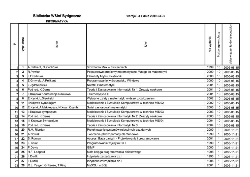 Biblioteka WSInf Bydgoszcz wersja I-3 z dnia 2009-03-30 rok wydania liczba egzemplarzy data włączenia do księgozbioru 1 A.Pelikant, G.Zwoliński 3 D Studio Max w ćwiczeniach 1999 10 2005-08-15 2 2 R.Pawlak Podstawowe problemy matematyczne. Wstęp do matematyki 2000 10 2005-08-15 3 3 J.Czerbniak Elementy fizyki i elektroniki 2000 10 2005-08-15 4 4 Z.Gmyrek, A.Pelikant Programowanie w środowisku Windows 2000 10 2005-08-15 5 5 J.Jędrzejewski Notatki z matematyki 2001 10 2005-08-15 6 6 Pod red. K.Dems Teoria i Zastosowanie Informatyki Nr 1, Zeszyty naukowe 2001 10 2005-08-15 7 7 II Krajowa Konferencja Naukowa Telemedycyna II 2001 10 2005-08-15 8 8 E.Kącki, L.Siewirski Wybrane działy z matematyki wyższej z ćwiczeniami 2002 10 2005-08-15 9 11 I Krajowe Sympozjum Modelowanie i Symulacja Komputerowa w technice MiS'02 2002 10 2005-08-15 10 12 E.Kącki, A.Małolepszy, N.Xuan Quynh Świat zastosowań matematyki 2003 10 2005-08-15 11 13 II Krajowe sympozjum Modelowanie i Symulacja Komputerowa w technice MiS'03 2003 10 2005-08-15 12 14 Pod red. K.Dems Teoria i Zastosowania Informatyki Nr 2, Zeszyty naukowe 2003 10 2005-08-15 13 15 III Krajowe Sympozjum Modelowanie i Symulacja Komputerowa w technice MiS'04 2004 10 2005-08-15 14 16 Pod red. K.Dems Teoria i Zastosowania Informatyki Nr 3 2004 10 2005-08-15 15 20 R.M. Riordan Projektowanie systemów relacyjnych baz danych 2000 1 2005-11-21 16 21 A.Nowak Tworzenie plików pomocy dla Windows 1999 1 2005-11-21 17 22 S. Roman Access. Baza danych - Projektowanie i programowanie 2001 1 2005-11-21 18 23 J. Kniat Programowanie w języku C++ 1999 1 2005-11-21 19 24 P.Davis GIMP 2000 1 2005-11-21 20 25 H.F. Ledgard Mała księga programowania obiektowego 1998 1 2005-11-21 21 26 I. Durlik Inżynieria zarządzania cz.I 1993 1 2005-11-21 22 27 I. Durlik Inżynieria zarządzania cz.II 1996 1 2005-11-21 28 R.J. Yarger, G.Reese, T.King MySQL i mSQL 2001 1 2005-11-21 23 tytuł autor 1 l.p. sygnatura INFORMATYKA 24 29 P.Wróblewski Programowanie w Windows dla praktyków 1997 1 2005-11-21 25 30 A.R. Neibauer Języki C i C++. Twój pierwszy program 1995 1 2005-11-21 26 31 P.Adamczewski Zintegrowane systemy informatyczne w praktyce. 2003 1 2005-11-21 27 32 J.Dyche CRM. Relacje z klientami. 2002 1 2005-11-21 28 33 W. Borowik, B. Borowik Meandry języka C++. 2001 1 2005-11-21 29 34 W.Freeze Visual Basic 6. Programowanie baz danych. 2001 1 2005-11-21 30 35 Stanisław Bolkowski Elektrotechnika 4 1993 1 2005-11-21 31 36 Pod red. L.Drelichowski i inn. Zastosowanie technik informacyjnych w gospodarce i zarządzanie wiedzą 2003 1 2005-11-21 32 37 J.C Armstrong, D.Taylor Unix dla każdego 1999 1 2005-11-21 33 38 A. Januszewski Informatyka w przedsiębiorstwie 2001 1 2005-11-21 34 39 A. Simmons Wprowadzenie do transmisji danych 1999 1 2005-11-21 35 40 R. Tidrow Rejestr Windows '95 1997 1 2005-11-21 36 41 W. Krysicki, L Włodarska Analiza matematyczna w zadaniach, cz.I 2000 1 2005-11-21 37 42 W. Krysicki, L Włodarska Analiza matematyczna w zadaniach, cz.II 2000 1 2005-11-21 38 43 N. Wirth Algorytmy + struktury danych = programy 2001 1 2005-11-21 39 44 W.T. Bielecki Informatyzacja zarządzania 2000 1 2005-11-21 40 45 B.W. Kernigham, D.M. Ritchie Język ANSI C 2001 1 2005-11-21 41 46 G.M. Fichtenholz Rachunek różniczkowy i całkowity 1999 1 2005-11-21 42 47 S. Forte Access 2000. Księga eksperta. 2001 1 2005-11-21 43 48 P.Metzger, A. Jełowicki Anatomia PC 1999 1 2005-11-21 44 49 L. Drelichowski Elementy teorii i praktyki zarządzania z technikami informacyjnymi w przedsiębiorstwie 2000 2 2005-11-21 45 50 M.Strebe, C.Perkins Firewalls ściany ogniowe 2000 1 2005-12-02 46 51 M.Hernadez, J.Viescas Zapytania SQL 2001 1 2005-12-02 47 52 R.Bowen, D.Ridruejo, A.Liska Apache. Podręcznik Administratora 2002 1 2005-12-02 48 53 M.Strebe Windows 2000. Server 2002 1 2005-12-02 49 54 M.Doman, M.Matłoka, B. Wojcieszyn Matematyka dla zaocznych studiów ekonomicznych 1997 1 2005-12-02 50 55 Pod red. K.Dems Teoria i Zastosowania Informatyki Nr 2, Zeszyty naukowe 2003 2 2005-12-02 51 57 Zieleniewski J. Organizacja i zarządzanie 1981 1 2005-12-02 52 99 Pod red. K.Dems 53 100 Kącki E., Małolepszy A. 54 101 IV Krajowe Sympozjum 55 102 Kużko W. V Sympozjum Modelowanie i Symulacja komputerowa w Technice Co to jest cybernetyka 2006 2005 10 2006-02-21 10 2006-02-21 Modelowanie i Symulacja Komputerowa w Technice MiS '05 2005 10 2006-02-21 Łódzki węzeł kolejowy: 1859-1918-1939. Przyczynek do historii kolejnictwa 2005 10 2006-02-21 56 103 Luciński J. 57 104 Kącki E. 58 106 Pod red. K.Dems Elementy elektroniki 2005 10 2006-02-21 Metody numeryczne 2005 10 2006-02-21 Teoria i Zastosowania Informatyki Nr 4 (1) 2005 2005 10 2006-02-21 59 109 Pod red. K.Dems Teoria i Zastosowania Informatyki Nr 5 (1) 2006 2006-02-21 AutoCAD 2000 Biblia Tom 1 2006 12 2000 2 60 154 Ellen Finkelstein 61 155 Ellen Finkelstein 62 156 Ellen Finkelstein AutoCAD 2000 Biblia Tom 2 2006-11-17 AutoCAD 2000 Biblia Tom 3 2000 2000 2 2 2006-11-17 63 157 Peter Abel Assembler IBM PC 2004 3 2006-11-17 64 158 Richard Stewens 65 159 Richard Stewens 66 160 Richard Stewens Biblia TCP/IP Tom 1 1 2006-11-17 Biblia TCP/IP Tom 2 1994 1998 1 2006-11-17 Biblia TCP/IP Tom 3 1998 1 2006-11-17 67 161 Paul Albitz, Cricket Liu DSN i BIND 2001 2 2006-11-17 68 162 Moshe Bar LINUX systemy plików 2002 2 2006-11-17 2006-11-17 2006-11-17 69 163 Daniel Bovet, Marco Cesati Linux Kernel 2001 2 70 164 Rob Flickenger Serwer Linuksowy okiem Hakera. 2003 3 2006-11-17 71 165 Ellen Frish UNIX Administracja Systemu 2003 2 2006-11-17 72 100 sposobów na BSD 2005 2 2006-11-17 2006-11-17 166 Dru Lavigne 73 167 Marcin Lis 505 praktycznych skryptów dla webmastera 2005 4 74 168 Łukasz Oberlan ABC Photoshop 7 2003 5 2006-11-17 75 169 Danuta Mendrala, Marcin Szeliga Access 2003 PL Kurs 2003 5 2006-11-17 76 170 Bogdan Czogalik Access 2002 Tworzenie baz danych 2002 5 2006-11-17 2006-11-17 77 171 Danuta Mendrala, Marcin Szeliga Access 2003 PL Ćwiczenia praktyczne 20