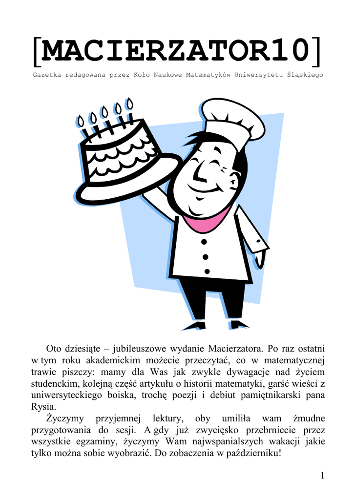 [MACIERZATOR10] Gazetka redagowana przez Koło Naukowe Matematyków Uniwersytetu Śląskiego Oto dziesiąte – jubileuszowe wydanie Macierzatora. Po raz ostatni w tym roku akademickim możecie przeczytać, co w matematycznej trawie piszczy: mamy dla Was jak zwykle dywagacje nad życiem studenckim, kolejną część artykułu o historii matematyki, garść wieści z uniwersyteckiego boiska, trochę poezji i debiut pamiętnikarski pana Rysia. Życzymy przyjemnej lektury, oby umiliła wam żmudne przygotowania do sesji. A gdy już zwycięsko przebrniecie przez wszystkie egzaminy, życzymy Wam najwspanialszych wakacji jakie tylko można sobie wyobrazić. Do zobaczenia w październiku! 1 [Dywagacje nad życiem studenckim] Te dywagacje będą nieco inne niż dotychczasowe. Ich wyjątkowość polega na tym, iż nie będzie w nich żadnego narzekania. Zapewne odetchnęliście teraz z ulgą. Do tymczasowego porzucenia stanowiska Naczelnego Krytyka Wydziałowego skłonił mnie nasz mały jubileusz (gaudeamus!) oraz fakt zaistnienia na naszych łamach pamiętnika pana Rysia. Podobnie jak nie jest dobrze, aby mężczyzna był sam, tak i nie jest dobrze, aby w gazetce o tak małej objętości pojawiły się aż dwa głosy jęczących studentów, którym nic się nigdy nie podoba. Zatem Wasz Ulubiony Felietonista (dla niezorientowanych wskazówka – to ja) w tym numerze odrobinę spuszcza z tonu. Łezka mi się w oku kręci, gdy patrzę na tę dumną dziesiątkę na okładce. Gdy ponad rok temu, troje studentów siedziało na ławce w korytarzu Naszego Ukochanego Wydziału i snuło marzenia o wydawaniu gazetki, nikomu nie śniło się, że zdoła ona przetrwać tak długo. Może na dnie serca tliła się nam nieśmiała nadzieja, że w dalekiej przyszłości staniemy się ogólnopolskim miesięcznikiem o wielomilionowym nakładzie, ale zimna logika podpowiadała, że z trudem znajdzie się dziesięciu chętnych do czytania tego, co będziemy w stanie wymyślić, napisać, wyedytować, wydrukować i rozprowadzić. W ciągu tych dziesięciu numerów, przeszliśmy drobną metamorfozę. Ustaliła się szata graficzna, włochata gąsienica przepoczwarzyła się w skromnego cytrynka. Udaliśmy się pod skrzydła Koła Naukowego Matematyków i w ten sposób, nasza pozycja na Wydziale uległa sformalizowaniu, lecz jednocześnie utrzymaliśmy dotychczasową niezależność w sprawach redakcyjnych. Można śmiało powiedzieć, że jesteśmy pięknym przykładem wolności słowa i niezależności prasy. Jedyne co nas ogranicza, to nasza osobista pruderyjność i poczucie humoru. Niezastąpione i stymulujące były dla nas Wasze głosy konstruktywnej krytyki: piszecie za mało o matematyce; za dużo wiadomości z wydziału; dobrze jest poczytać poezję; dlaczego nie dajecie łamigłówek matematycznych?; wciąż piszecie coś o górach; w gazetce nie ma nic, prócz tekstów o matematyce; nigdy nie można dostać gazetki; nie dawajcie już więcej łamigłówek; dlaczego nie piszecie o tym co dzieje się na wydziale?; napiszcie coś o górach; nie drukujcie więcej tych wierszy, bo i tak nikt ich nie rozumie; wciąż się o coś czepiacie; napiszcie w końcu coś ciekawego… Najprzyjemniejsze jednak są te chwile, gdy po kolejnych burzliwych spotkaniach redakcyjnych udaje nam się w końcu wydać kolejny numer i na korytarzu napastujemy Was, Bogu ducha winnych studentów, wciskając Wam Macierzatora. Osobiście mam tylko jedną prośbę: nie brońcie się. I tak Wam to nic nie da. Kufak 2 [Między historią a matematyką] Dziś oddaję w Wasze ręce ostatni już w tym roku akademickim artykuł śledzący historię matematyki poprzez stulecia. W poprzednich artykułach zajmowaliśmy się głównie starożytnością i dowiedzieliśmy się, jak dawniej ludzie liczyli i skąd się wzięły liczby. W tym artykule prześledzimy czasy bardziej nam współczesne i zajmiemy się matematyką europejską począwszy od XIII wieku. Wraz ze zmierzchem starożytności wiedza matematyczna Greków została w Europie zatracona. Korzystano wprawdzie z operacji dodawania, odejmowania, dzielenia i mnożenia (przy pomocy cyfr rzymskich), lecz zapisywano je słownie. Znano również już tylko elementarną geometrię. Właściwa historia matematyki europejskiej rozpoczyna się dopiero wraz z obszernymi łacińskimi tłumaczeniami dzieł arabskich w XII i XIII wieku. W tym samym czasie przełożono na łacinę szereg greckich i hebrajskich rękopisów matematycznych. W roku 1202 Leonard z Pizy zwany Fibbonaccim wydał księgę Liber Abaci, która wprowadza obliczenia wykonywane na liczbach hinduskich używanych wówczas przez Arabów. Tekst ten zawiera między innymi opis mnożenia w słupku, działania na ułamkach, chińskie twierdzenie o resztach oraz zagadnienia związanie z liczbami doskonałymi. Liber Abaci uznawane jest za pierwsze istotne europejskie dzieło matematyczne. Jednakże potrzebnych było kilka wieków, aby matematyka europejska rozwinęła się w znacznie większym stopniu. Przykładowo, znak + oraz – pojawiły się dopiero pod koniec XV wieku, zaczerpnięte z notacji stosowanej przez kupców. W XVI wieku zostały przełożone i wydane dzieła Archimedesa. Intelektualny klimat renesansu spowodował wielkie zainteresowanie myślą starożytnej Grecji. Wskutek tego europejska matematyka zaczęła się rozwijać na dwoistej bazie wpływów arabskiej arytmetyki i algebry oraz greckiej geometrii. Pierwsze istotne dokonania matematyczne europejczyków, będące zresztą pod wyraźnym wpływem arabskiej algebry, datują się na renesansowe Włochy wieku XV i XVI. Pod koniec wieku XV Scipione del Ferro znalazł ogólne rozwiązanie równania trzeciego stopnia. Swoją tajemnicę wyjawił on dopiero na łożu śmierci swoim uczniom, Hannibalowi Della Nave oraz Antonio Mario Fiorowi. Korzystając z metody del Ferro, Fior wygrał kilka turniejów matematycznych, przegrywając jednak w roku 1535 z Niccolo Fontaną, zwanym Ta