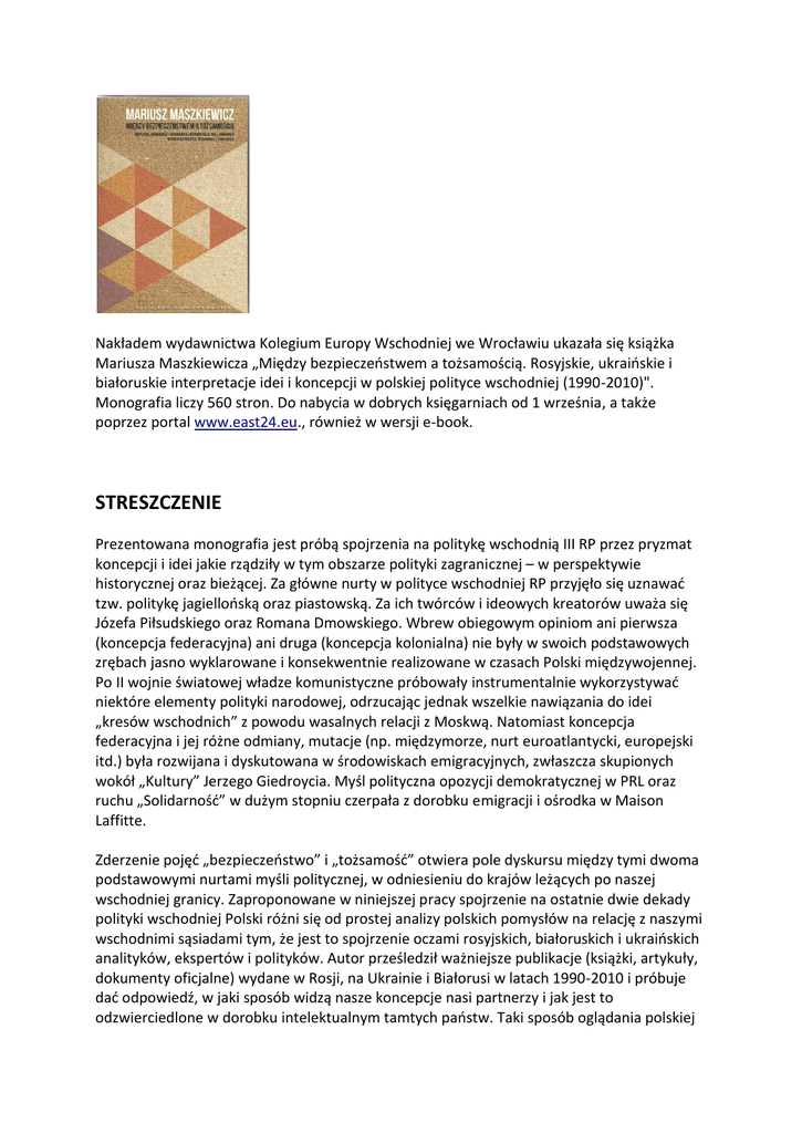 Nakładem wydawnictwa Kolegium Europy Wschodniej we Wrocławiu ukazała się książka Mariusza Maszkiewicza „Między bezpieczeństwem a tożsamością. Rosyjskie, ukraińskie i białoruskie interpretacje idei i koncepcji w polskiej polityce wschodniej (1990-2010)". Monografia liczy 560 stron. Do nabycia w dobrych księgarniach od 1 września, a także poprzez portal www.east24.eu., również w wersji e-book. STRESZCZENIE Prezentowana monografia jest próbą spojrzenia na politykę wschodnią III RP przez pryzmat koncepcji i idei jakie rządziły w tym obszarze polityki zagranicznej – w perspektywie historycznej oraz bieżącej. Za główne nurty w polityce wschodniej RP przyjęło się uznawać tzw. politykę jagiellońską oraz piastowską. Za ich twórców i ideowych kreatorów uważa się Józefa Piłsudskiego oraz Romana Dmowskiego. Wbrew obiegowym opiniom ani pierwsza (koncepcja federacyjna) ani druga (koncepcja kolonialna) nie były w swoich podstawowych zrębach jasno wyklarowane i konsekwentnie realizowane w czasach Polski międzywojennej. Po II wojnie światowej władze komunistyczne próbowały instrumentalnie wykorzystywać niektóre elementy polityki narodowej, odrzucając jednak wszelkie nawiązania do idei „kresów wschodnich” z powodu wasalnych relacji z Moskwą. Natomiast koncepcja federacyjna i jej różne odmiany, mutacje (np. międzymorze, nurt euroatlantycki, europejski itd.) była rozwijana i dyskutowana w środowiskach emigracyjnych, zwłaszcza skupionych wokół „Kultury” Jerzego Giedroycia. Myśl polityczna opozycji demokratycznej w PRL oraz ruchu „Solidarność” w dużym stopniu czerpała z dorobku emigracji i ośrodka w Maison Laffitte. Zderzenie pojęć „bezpieczeństwo” i „tożsamość” otwiera pole dyskursu między tymi dwoma podstawowymi nurtami myśli politycznej, w odniesieniu do krajów leżących po naszej wschodniej granicy. Zaproponowane w niniejszej pracy spojrzenie na ostatnie dwie dekady polityki wschodniej Polski różni się od prostej analizy polskich pomysłów na relację z naszymi wschodnimi sąsiadami tym, że jest to spojrzenie oczami rosyjskich, białoruskich i ukraińskich analityków, ekspertów i polityków. Autor prześledził ważniejsze publikacje (książki, artykuły, dokumenty oficjalne) wydane w Rosji, na Ukrainie i Białorusi w latach 1990-2010 i próbuje dać odpowiedź, w jaki sposób widzą nasze koncepcje nasi partnerzy i jak jest to odzwierciedlone w dorobku intelektualnym tamtych państw. Taki sposób oglądania polskiej polityki wschodniej pozwala na głębszą analizę podstawowych pułapek, ale także sukcesów w tym obszarze. O ile – dla przykładu – z rosyjskiej perspektywy jesteśmy mało zauważalnym „graczem” w układzie regionalnym, o tyle w tekstach autorów ukraińskich i białoruskich widać jak bardzo mocno odbija się w ich wewnętrznym dialogu/konfliktach cały szereg problemów, z którymi zmagamy się w naszym polskim dyskursie. Wnioski z tej analizy pozwalają także uświadomić sobie, że wiele elementów w białoruskim i ukraińskim dyskursie tożsamościowym jest wspólne z tym, co w ostatnich dwóch dekadach było obecne w Polsce, choć w odbiciu lustrzanym. Jednocześnie widać wyraźnie, że podstawowa siła destrukcyjna, widzialnych oraz ukrytych mitów „polityki tożsamościowej” polega na ograniczaniu lub uniemożliwianiu budowy trwałego systemu bezpieczeństwa regionalnego, tym samym osłabia pozycję Polski jako potencjalnego lidera tego procesu. W końcowej części autor analizuje wiele z opisanych elementów polskiej polityki wschodniej przez pryzmat problemów polskiej mniejszości na obszarze postsowieckim. Zaletą książki jest to, że po raz pierwszy w Polsce tak szeroko pokazuje, w perspektywie konceptualnej i ideowej, jak nas widzą na wschodzie, zwłaszcza nasz dyskurs rozciągnięty między polityką jagiellońską i piastowską.