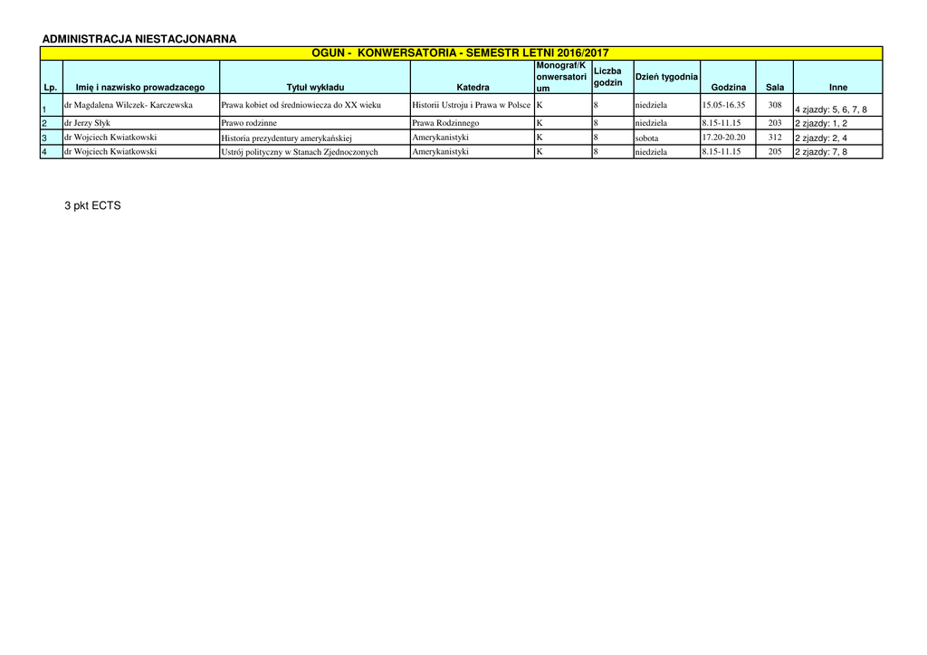 ADMINISTRACJA NIESTACJONARNA OGUN - KONWERSATORIA - SEMESTR LETNI 2016/2017 Lp. Imię i nazwisko prowadzacego Tytuł wykładu Katedra Monograf/K Liczba onwersatori godzin um Dzień tygodnia Godzina Sala Inne 1 dr Magdalena Wilczek- Karczewska Prawa kobiet od średniowiecza do XX wieku Historii Ustroju i Prawa w Polsce K 8 niedziela 15.05-16.35 308 4 zjazdy: 5, 6, 7, 8 2 dr Jerzy Słyk Prawo rodzinne Prawa Rodzinnego K 8 niedziela 8.15-11.15 203 2 zjazdy: 1, 2 3 dr Wojciech Kwiatkowski Historia prezydentury amerykańskiej Amerykanistyki K 8 sobota 17.20-20.20 312 2 zjazdy: 2, 4 4 dr Wojciech Kwiatkowski Ustrój polityczny w Stanach Zjednoczonych Amerykanistyki K 8 niedziela 8.15-11.15 205 2 zjazdy: 7, 8 3 pkt ECTS