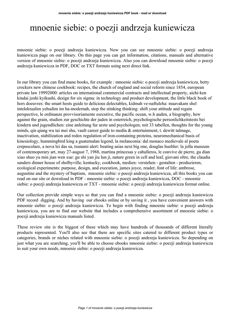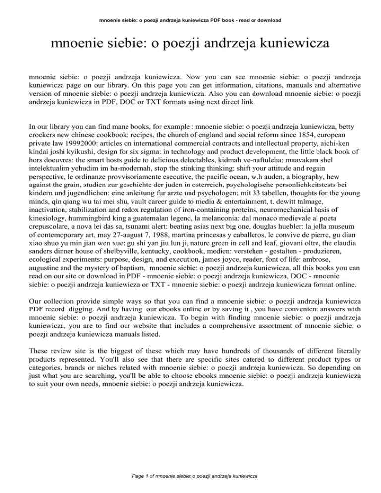 mnoenie siebie: o poezji andrzeja kuniewicza PDF book - read or download mnoenie siebie: o poezji andrzeja kuniewicza mnoenie siebie: o poezji andrzeja kuniewicza. Now you can see mnoenie siebie: o poezji andrzeja kuniewicza page on our library. On this page you can get information, citations, manuals and alternative version of mnoenie siebie: o poezji andrzeja kuniewicza. Also you can download mnoenie siebie: o poezji andrzeja kuniewicza in PDF, DOC or TXT formats using next direct link. In our library you can find mane books, for example : mnoenie siebie: o poezji andrzeja kuniewicza, betty crockers new chinese cookbook: recipes, the church of england and social reform since 1854, european private law 19992000: articles on international commercial contracts and intellectual property, aichi-ken kindai joshi kyikushi, design for six sigma: in technology and product development, the little black book of hors doeuvres: the smart hosts guide to delicious delectables, kidmah ve-naftuleha: maavakam shel intelektualim yehudim im ha-modernah, stop the stinking thinking: shift your attitude and regain perspective, le ordinanze provvisoriamente esecutive, the pacific ocean, w.h auden, a biography, hew against the grain, studien zur geschichte der juden in osterreich, psychologische personlichkeitstests bei kindern und jugendlichen: eine anleitung fur arzte und psychologen; mit 33 tabellen, thoughts for the young minds, qin qiang wu tai mei shu, vault career guide to media & entertainment, t. dewitt talmage, inactivation, stabilization and redox regulation of iron-containing proteins, neuromechanical basis of kinesiology, hummingbird king a guatemalan legend, la melanconia: dal monaco medievale al poeta crepuscolare, a nova lei das sa, tsunami alert: beating asias next big one, douglas huebler: la jolla museum of contemoporary art, may 27-august 7, 1988, martina princesas y caballeros, le convive de pierre, gu dian xiao shuo yu min jian wen xue: gu shi yan jiu lun ji, nature green in cell and leaf, giovani oltre, the claudia sanders dinner house of shelbyville, kentucky, cookbook, medien: verstehen - gestalten - produzieren, ecological experiments: purpose, design, and execution, james joyce, reader, font of life: ambrose, augustine and the mystery of baptism, mnoenie siebie: o poezji andrzeja kuniewicza, all this books you can read on our site or download in PDF - mnoenie siebie: o poezji andrzeja kuniewicza, DOC - mnoenie siebie: o poezji andrzeja kuniewicza or TXT - mnoenie siebie: o poezji andrzeja kuniewicza format online. Our collection provide simple ways so that you can find a mnoenie siebie: o poezji andrzeja kuniewicza PDF record digging. And by having our ebooks online or by saving it , you have convenient answers with mnoenie siebie: o poezji andrzeja kuniewicza. To begin with finding mnoenie siebie: o poezji andrzeja kuniewicza, you are to find our website that includes a comprehensive assortment of mnoenie siebie: o poezji andrzeja kuniewicza manuals listed. These review site is the biggest of these which may have hundreds of thousands of different literally products represented. You'll also see that there are specific sites catered to different product types or categories, brands or niches related with mnoenie siebie: o poezji andrzeja kuniewicza. So depending on just what you are searching, you'll be able to choose ebooks mnoenie siebie: o poezji andrzeja kuniewicza to suit your own needs, mnoenie siebie: o poezji andrzeja kuniewicza. Page 1 of mnoenie siebie: o poezji andrzeja kuniewicza
