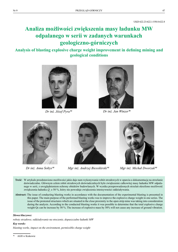 Nr 9 PRZEGLĄD GÓRNICZY 47 UKD 622.23:622.1:550.8:622.8 Analiza możliwości zwiększenia masy ładunku MW odpalanego w serii w zadanych warunkach geologiczno-górniczych Analysis of blasting explosive charge weight improvement in defining mining and geological conditions Dr inż. Józef Pyra*) Dr inż. Anna Sołtys*) Dr inż. Jan Winzer*) Mgr inż. Andrzej Biessikirski*) Mgr inż. Michał Dworzak*) Treść: W artykule przedstawiono możliwości jakie daje nam wykonywanie robót strzałowych w oparciu o dokumentację na strzelanie doświadczalne. Głównym celem robót strzałowych doświadczalnych było zwiększenie całkowitej masy ładunku MW odpalanego w serii, z uwzględnieniem ochrony obiektów budowlanych. W wyniku przeprowadzonych strzelań określono możliwość zwiększenia ładunku Qc o 50 %, który nie powoduje zwiększenia intensywności oddziaływania. Abstract: The issue of conducting blasting works in accordance with the documentation of the experimental blasting is presented in this paper. The main purpose of the performed blasting works was to improve the explosive charge weight in one series. The issue of the protested structures which are situated in the close proximity to the open strip mine was taking into consideration during the analysis. According to the conducted blasting works it was possible to determine that the total explosive charge weight Qc can be increase by 50 %. The increase of explosive mass by 50% will not cause any increase of ground vibration. Słowa kluczowe: roboty strzałowe, oddziaływanie na otoczenie, dopuszczalne ładunki MW Key words: blasting works, impact on the environment, permissible charge weight *) AGH w Krakowie 48 PRZEGLĄD GÓRNICZY 1. Wprowadzenie 2015 Samo złoże obejmuje swoją objętością utwory górnej jury o dużym zróżnicowaniu litologicznym. Zgodnie z dokumentacją geologiczną złoża wyróżnia się w nim trzy kompleksy o różnym wykształceniu litologiczno-facjalnym, i co istotne z punktu widzenia dalszego procesu produkcyjnego, odmiennym składzie chemicznym. Począwszy od najstarszego występują: kompleks wapienny, kompleks wapienno-marglisty, kompleks marglisto-wapienny. Powyższy podział zbudowany został w oparciu o kryterium zawartości CaO. Złoże wykazuje dosyć regularną zmienność wykształcenia litologicznego oraz dużą zmienność składu chemicznego w kierunkach równoleżnikowych, a także wraz z głębokością. Dość regularną zmienność wykształcenia litologicznego komplikują zjawiska krasowe, które tworzą formy szczelinowe, kieszeniowe, lub leje. Krasowienie objęło wszystkie kompleksy występujące w złożu. Zjawiska krasowe związane są z licznie występującymi w tym terenie dyslokacjami tektonicznymi, w obrębie których uprzywilejowane były procesy erozji i wietrzenia. Wyerodowane partie osadów węglanowych zastąpione zostały przez osady trzeciorzędowe w postaci piasków kwarcowych i glaukonitowych, iłów lub glin, bądź też osady czwartorzędowe w postaci zwietrzeliny marglisto-wapiennej [6]. Jak można zauważyć budowa geologiczna jest skomplikowana, dlatego w celu zawężenia zmiennych zdecydowano się na wykonywanie serii doświadczalnych tylko w surowcu niskim w części południowej złoża. W celu określenia możliwości zwiększenia masy Qc, przygotowano i odpalono sześć serii o parametrach przedstawionych w tablicy 1. Jako materiał wybuchowy zastosowano MW emulsyjne luzem (serie I ÷ IV) i MW typu ANFO (serie V i VI). Naboje udarowe sporządzano z pobudzaczy trotylowych, które inicjowano zapalnikami nieelektrycznymi. Zwraca uwagę fakt, że MW typu ANFO jest materiałem o mniejszej gęstości, przez co w otworze o zbliżonych parametrach (długość, średnica), mieści się około 70 % masy MW emulsyjnego. Ze względów technologicznych, część serii była odpalana z konstrukcją ładunku ciągłego w otworze, a część z konstruk- Roboty strzałowe w dalszym ciągu są podstawową metodą pozyskiwania znacznej ilości surowca skalnego. Wynika to przede wszystkim z faktu, iż są relatywnie tanie w porównaniu do urabiania mechanicznego, zwłaszcza jeżeli weźmie się pod uwagę efektywność wykonywanych robót. Poza tym większość surowców skalnych można urabiać jedynie z użyciem materiałów wybuchowych (MW). Odkrywkowe zakłady górnicze dążą do obniżenia kosztów prowadzonej eksploatacji, aby produkt końcowy był jak najbardziej konkurencyjny na rynku. Jednym ze sposobów obniżenia ceny produktu końcowego jest obniżenie nakładów na wykonywanie robót wiertniczo-strzałowych, a to można osiągnąć między innymi poprzez zwiększenie masy ładunku całkowitego odpalanego w serii (Qc). Zwiększenie masy ładunku MW odpalanego w serii, zmniejsza częstość wykonywanych robót strzałowych, a tym samym zmniejsza się liczba serii oddziałujących na otaczającą zabudowę. Zwiększenie masy ładunku całkowitego MW nie zawsze jest możliwe ze względu na lokalne warunki geologiczno-górnicze. Pierwszym krokiem w celu sprawdzenie tej możliwości jest dokładne przeanalizowanie budowy geologicznej w miejscu wykonywania robót strzałowych, oraz w miejscu posadowienia chronionych obiektów budowlanych. Mając wyniki pomiarów drgań w otoczeniu i zaopiniowaną dokumentację na strzelanie doświadczalne można podjąć próby, które dadzą odpowiedź co do możliwości zwiększenia Qc. W tym celu w dalszej części artykułu przedstawiono sposób realizacji tego zadania w określonych warunkach geologiczno-górniczych i osiągnięte efekty. 2. Charakterystyka warunków geologiczno-górniczych Złoże na przykładzie którego opisano możliwości zwiększenia masy Qc eksploatowane jest dwoma poziomami wydobywczymi. Eksploatacja w poziomie I sięga do rzędnej około 175 m n.p.m., a drugi poziom do rzędnej 160 m n.p.m. Złoże zlokalizowane jest w części mezozoicznego „pierścienia” Gór Świętokrzyskich. Obrzeżenie to w t