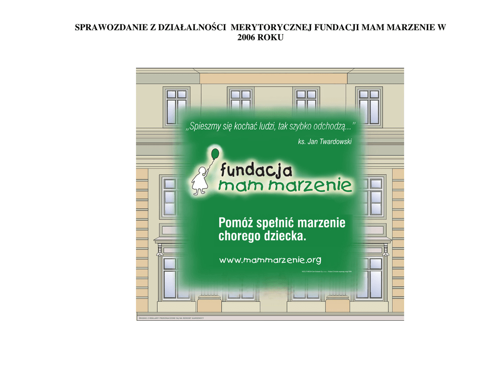 SPRAWOZDANIE Z DZIAŁALNOŚCI MERYTORYCZNEJ FUNDACJI MAM MARZENIE W 2006 ROKU SPRAWOZDANIE Z DZIAŁALNOŚCI MERYTORYCZNEJ FUNDACJI MAM MARZENIE W 2006 ROKU Wprowadzenie: W trzecim roku działalności statutowej roku fundacja Mam Marzenie przeżywała bezprecedensowy w swojej historii rozwój który objawiał się lawinowym wzrostem ilości spełnionych marzeń - o ponad 62% w stosunku do roku ubiegłego ( 297 spełnionych marzeń). Powstały nowe oddziały fundacji w Kielcach (kwiecień), Rzeszowie (wrzesień), Gorzowie Wielkopolskim (marzec) i Białymstoku ( czerwiec ),dzięki czemu prawie w całym kraju dzieci cierpiące na choroby zarażające ich życiu mogą przystąpić do programu naszej fundacji. W 2006 roku udał nam się utrzymać filozofię całkowitego oparcia działalności statutowej naszej organizacji na pracy wolontariuszy, co w praktyce oznaczało, że fundacja nie zatrudniała ani w formie pośredniej ani bezpośredniej żadnego etatowego pracownika. Pozwoliło to ograniczyć koszty administracyjne do minimun i przeznaczyć ponad 95% wszystkich wpływów na działalność statutową. Efektem ubocznym takiego rozumienia misji fundacji był konflikt koordynatora i wolontariuszy oddziału FMM w Trójmieście z pozostałymi koordynatorami i Zarządem FMM . Podważanie przez tą grupę zasady nierozbudowywania infrastruktury fundacji ( jedyne biuro,które pełni rolę centrum administracyjnego FMM znajduje się w Krakowie), a tym samym ograniczania kosztów administracyjnym spowodowało zawieszenie z dnim 1 września oddziału w Trójmieście ( potem byli wolontariusze z tego oddziału utworxyli swoją własną, lokalną organizację o takim samym profilu jak FMM). Utrzymanie zasady oparcia działań naszej fundacji o wolontariat i nierozbudowywania jej infrastruktury pozwoliło jednak na ugruntowanie pozycji FMM jako wiarygodnego i rzetelnego partnera dla naszych darczyńców i podopiecznych. I. Działalność pożytku publicznego: 1. Spełnianie marzeń chorych dzieci zakwalifikowanych do programu FMM: SPRAWOZDANIE Z DZIAŁALNOŚCI MERYTORYCZNEJ FUNDACJI MAM MARZENIE W 2006 ROKU Oto jak przedstawia się statystyka spełnionych marzeń z podziałem na kategorie: Kategorie spełnionych marzeń w 2006 roku 27 73 34 chciałbym mieć chciałbym być chciałbym zobaczyć chcialbym spotkać 347 Ogółem spełnione zostało 481 marzeń. Najwięcej z nich w katergorii „chciałbym mieć”, w której najbardziej popularnym prezentem był komputer ( ponad 50% spełnionych marzeń we wszystkich kategoriach). SPRAWOZDANIE Z DZIAŁALNOŚCI MERYTORYCZNEJ FUNDACJI MAM MARZENIE W 2006 ROKU W poszczególnych oddziałach ilość spełnionych marzeń w porówniu do roku ubiegłego wyglądała nastepująco: Trójmiasto 100 80 Katowice 60 Szczecin 40 2006 2005 Poznań Wrocław Warszawa Bydgoszcz Lublin Kielce 0 Białystok 20 Stanowi to przyrost w stosunku do roku ubiegłego ( 297 marzeń ) o 62% Największy przyrost ilości spełninych marzeń nastapił w Szczecinie a spadek w Trójmieście (zawieszenie oddziału we wrześniu). SPRAWOZDANIE Z DZIAŁALNOŚCI MERYTORYCZNEJ FUNDACJI MAM MARZENIE W 2006 ROKU 2. Wolontariat: Rok 2006 był kolejnym rokiem zwiększenia szeregów wolontariuszy zaangażownych a wypelnianie misji fundacji. W ciągu 12 miesięcy odbyło się 25 szkoleń, podczas których ok 300 kandydtów na wolontariuszy zapoznało się z obowiązującymi w fundacji procedurami spełniania marzeń. Spadek liczby szkoleń w stosunku do roku ubiegłego o ponad połowę wiązał się z przyjęciem przez Zarząd nowej strategii szkoleń, które mają być teraz jednym z etapów w uzyskaniu statusu wolontariusza dla tych , którzy aktywnie uczestniczą w pracy fundacji jako obserwatorzy. Poprzednio przejście szkolenia było warunkiem akcesu do naszej organzacji dla osób , którzy dopiero zgłosiły chęć zaangażowania w działalność fundacji. Teraz praktyczny udział w spotkaniach z chorymi dziećmi w charakterze obserwatorów pozwala kandydatom na wolontariurszy dokonać bardziej świadomego wyboru, czy chcą udzielać się charytatywnie w ramach FMM. Obecnie spośród ok 1200 przeszkolonych w ciągu 3 lat wolontariuszy działa czynnie we wszystkich oddziałach fundacji ok 200 osób. Pozostali albo zawiesili swój aktywny status z przyczyn osobistych albo zrezygnowali z działalności charytatrywnej na rzecz naszej organizacji. Czynni wolontariusze FMM uczestniczyli w procesie spełniania marzeń, organizowaniu akcji fundraisingowych w ramach zbiórek publicznych (pakowanie zakupów w supermarketach), pozyskiwaniu sponsorów w ramach akcji „adopcji marzeń” oraz wykonywali wszelkie prace administracyjne niezbędne do funkcjownowania biura w Krakowie i wspomagania koordynatorów w oddziałach. Dzięki ich zaangażowaniu fundacja kontunowała zasadę oparcia swojej działalności wyłącznie na wolontariacie, co pozwoliło przeznaczyć ponad 95% pozyskanych w 2006 roku funduszy na wypełnianie jej misji statutowej.. Ponadto zgodnie z zaleceniami Rady Programowej w każdym z oddziałów FMM nawiązano współpracę z lekarzem – konsultantem medycznym, który pro bono weryfikuje diagnozy kandydatów do programu spełniania marzeń pod kątem zagrożenia życia. Dwukrotnie – w styczniu i lipcu odbyły się spotkania koordynatorów z wszytkich oddziałów FMM, których efektem było powstanie „manuala koordynatora FMM” – zbioru zasad i obowiązków jakie niesie ze sobą ta funkcja oraz wymiana doświadczeń w zakresie pozyskiwania wolontariuszy od współpracy i uaktywnienia tych, którzy pozostając formalnie czynnymi wolontairuszami, nie angażują się zbytnio w pracę na rzecz chorych dzieci. SPRAWOZDANIE Z DZIAŁALNOŚCI MERYTORYCZNEJ FUNDACJI MAM MARZENIE W 2006 ROKU II. Działalność marketingowa i public relations: W roku 2006 aktywnie włączyła się w promocję fundacji honorowa Ambasador FMM Pani Katarzyna Figura. W Łodzi, Warszawie, Krakowie, Wrocławiu,Gorzowi