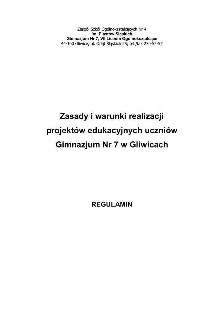 Zespół Szkół Ogólnokształcących Nr 4 im. Piastów Śląskich Gimnazjum Nr 7, VII Liceum Ogólnokształcące 44-100 Gliwice, ul. Orląt Śląskich 25; tel./fax 270-55-57 Zasady i warunki realizacji projektów edukacyjnych uczniów Gimnazjum Nr 7 w Gliwicach REGULAMIN 1. Uczniowie mają obowiązek realizowania projektów edukacyjnych na podstawie § 21a Rozporządzenia Ministra Edukacji Narodowej z dnia 30 kwietnia 2007 r. w sprawie warunków i sposobu oceniania, klasyfikowania i promowania uczniów i słuchaczy oraz przeprowadzania sprawdzianów i egzaminów w szkołach publicznych (Dz. U. Nr 83, poz.562 z późn. zm.), a udział ucznia w projekcie ma wpływ na ocenę zachowania zgodnie z zapisami statutu szkoły. 2. Gimnazjum Nr 7 w Gliwicach stwarza warunki do realizacji uczniowskich projektów edukacyjnych, które mogą mieć charakter; przedmiotowy, międzyprzedmiotowy, a czas ich powinien wynosić od 2 tygodni do 7 miesięcy w zależności od problematyki i złożoności projektu. 3. Każdy nauczyciel jest opiekunem projektu, w związku z realizowaniem nowej podstawy programowej gimnazjum. 4. Koordynatorem projektów edukacyjnych jest nauczyciel powołany przez dyrektora szkoły, którego zadaniem jest: a) zebranie od zespołów przedmiotowych bądź poszczególnych nauczycieli propozycji tematów projektu, sporządzenie ich listy zbiorczej oraz listy grup uczniów biorących udział w projekcie, przedstawienie dyrektorowi i radzie pedagogicznej ww. dokumentów oraz upowszechnienie ich w sposób przyjęty w szkole; b) monitorowanie stanu realizacji projektów; c) upowszechnienie informacji na temat realizowanych projektów; d) organizację publicznej prezentacji projektów; e) podsumowanie realizacji projektów i przedstawienie radzie pedagogicznej f) w postaci sprawozdania zbiorczego na koniec roku szkolnego. 5. Opiekun projektu w szczególności odpowiada za: a) wskazanie tematyki realizowanych projektów z uwzględnieniem zainteresowań uczniów i treści podstawy programowej; b) omówienie z uczniami zakresu tematycznego oraz celów projektu i koordynowanie c) podziału uczniów na poszczególne zespoły projektowe; d) opracowanie karty projektu i innych dokumentów (kontrakt dla uczniów, arkusz oceny projektu, narzędzia do ewaluacji, kryteria oceny projektu oraz instrukcja realizacji projektu); e) prowadzenie konsultacji dla uczniów realizujących projekt; f) monitorowanie jego realizacji; g) ocenę projektu we współpracy z nauczycielami, którzy wspomagali jego realizację. 6. Tematyka projektów wraz z określeniem celów, etapów realizacji, terminów planowanego zakończenia projektu oraz sposobu prezentacji efektów oraz ze wskazaniem opiekuna (opiekunów) projektu jest zgłaszana do koordynatora przez opiekuna projektu. 7. Nauczyciele – w zakresie swoich kompetencji – są zobowiązani do udzielenia wsparcia w realizacji projektów zespołowi projektowemu, który za pośrednictwem opiekuna projektu zwróci się o pomoc, a także, na prośbę opiekuna projektu, biorą udział w opracowaniu kryteriów oceny projektu i samej ocenie projektu. 8. Zadania wychowawcy klasy związane z realizacją projektu: a) poinformowanie uczniów i ich rodziców (prawnych opiekunów) o warunkach realizacji projektu edukacyjnego. Rodzicom przekazuje się informacje na pierwszym zebraniu w klasie I. b) prowadzenie działań organizacyjnych, związanych z realizacją projektu przez wszystkich uczniów klasy, dotyczących w szczególności: wyboru tematu i grupy projektowej przez każdego ucznia klasy, monitorowania udziału uczniów w pracach zespołu poprzez kontakt z opiekunem zespołu, przekazywania informacji o wynikach monitorowania rodzicom; c) komunikowanie się z opiekunami projektów w sprawie oceniania zachowania; d) dokonywanie zapisów dotyczących realizacji przez ucznia projektu edukacyjnego e) w dokumentacji szkolnej (dziennik lekcyjny, arkusze ocen, świadectwa, inne ustalone przez szkołę). 9.Uczniowie mogą realizować projekty w zespołach oddziałowych, międzyoddziałowych lub międzyklasowych liczących 3–9 osób. 10. System podziału na poszczególne zespoły projektowe odbywa się w sposób: a) losowy, b) poprzez dobór samodzielny uczniów, c) poprzez wybór nauczyciela, zgodnie z ustalonymi wcześniej kryteriami. 11. Zadania zespołu określa instrukcja realizacji danego projektu oraz kontrakt zawarty z opiekunem. 12. Przy wyborze tematyki projektu obowiązuje zasada dobrowolności, a jeden projekt może być realizowany niezależnie przez kilka zespołów uczniowskich. 13. W a) b) c) przypadku gdy uczeń: nie zdecyduje o wyborze tematu, nie określi zespołu, z którym będzie realizował projekt, nie złoży deklaracji z powodów niezależnych od siebie (np. z powodu choroby) wychowawca klasy włącza go do określonego zespołu, uwzględniając zainteresowania i zdolności ucznia. 14. Tematyka planowanych do realizacji projektów, zawierająca informacje, o której mowa w pkt. 3a, jest przedstawiana przez koordynatora dyrektorowi nie później niż do 15 października danego roku, za wyjątkiem roku szkolnego 2010/2011, w którym ww. tematykę przedstawia się dyrektorowi szkoły do 15 grudnia 2010r. 15. Dyrektor w porozumieniu z radą pedagogiczną dopuszcza złożone projekty do realizacji, biorąc pod uwagę możliwości organizacyjne i warunki, jakimi dysponuje gimnazjum. 16. Dopuszcza się, w wyjątkowych sytuacjach, modyfikację listy projektów realizowanych w trakcie danego roku szkolnego, a także zmianę tematyki, terminów zakończenia i sposobu prezentacji efektów, a także opiekuna (opiekunów) projektu, o ile wystąpiły przyczyny, które uniemożliwiły realizację podjętego zadania. Decyzję o zmianach w pracy nad projektami podejmuje koordynator projektów po konsultacji z opiekunem danego projektu lub dyrektorem szkoły. 17. Realizacja projektu może być dokonywana podczas zajęć lekcyjnych, o ile nie zaburza to zasad ustalonych