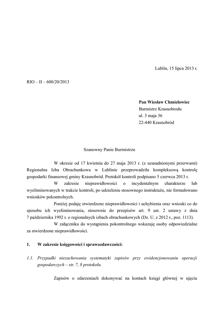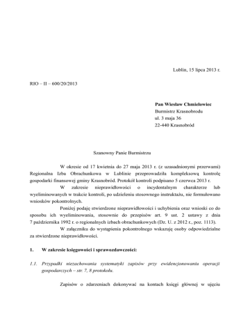 Lublin, 15 lipca 2013 r. RIO – II – 600/20/2013 Pan Wiesław Chmielowiec Burmistrz Krasnobrodu ul. 3 maja 36 22-440 Krasnobród Szanowny Panie Burmistrzu W okresie od 17 kwietnia do 27 maja 2013 r. (z uzasadnionymi przerwami) Regionalna Izba Obrachunkowa w Lublinie przeprowadziła kompleksową kontrolę gospodarki finansowej gminy Krasnobród. Protokół kontroli podpisano 5 czerwca 2013 r. W zakresie nieprawidłowości o incydentalnym charakterze lub wyeliminowanych w trakcie kontroli, po udzieleniu stosownego instruktażu, nie formułowano wniosków pokontrolnych. Poniżej podaję stwierdzone nieprawidłowości i uchybienia oraz wnioski co do sposobu ich wyeliminowania, stosownie do przepisów art. 9 ust. 2 ustawy z dnia 7 października 1992 r. o regionalnych izbach obrachunkowych (Dz. U. z 2012 r., poz. 1113). W załączniku do wystąpienia pokontrolnego wskazuję osoby odpowiedzialne za stwierdzone nieprawidłowości. 1. W zakresie księgowości i sprawozdawczości: 1.1. Przypadki niezachowania systematyki zapisów przy ewidencjonowaniu operacji gospodarczych – str. 7, 8 protokołu. Zapisów o zdarzeniach dokonywać na kontach księgi głównej w ujęciu 2 systematycznym, w związku z przepisami art. 15 ust. 1 ustawy z dnia 29 września 1994 r. o rachunkowości (Dz. U. z 2013 r. poz. 330), w szczególności: a) wpływ w grudniu części oświatowej subwencji ogólnej na styczeń następnego roku ujmować wyłącznie w ewidencji budżetu gminy zapisami: Wn 133 „Rachunek budżetu”, Ma 909 „Rozliczenia międzyokresowe”, a przeksięgowanie otrzymanej subwencji na dochody budżetu gminy w następnym roku budżetowym: - w księdze głównej budżetu gminy: Wn 909 „Rozliczenia międzyokresowe”, Ma 901 „Dochody budżetu”; - w księdze głównej Urzędu Miejskiego - zgodnie z ustaleniami prawidłowo opracowanego zakładowego planu kont: Wn 221 „Należności z tytułu dochodów budżetowych” (lub 222 „Rozliczenie dochodów budżetowych” lub inne konto ustalone w zakładowym planie kont), Ma 720 „Przychody z tytułu dochodów budżetowych” oraz równolegle Wn 800 „Fundusz jednostki”, Ma 221 (lub 222 „Rozliczenie dochodów budżetowych” lub inne konto ustalone w zakładowym planie kont), b) operacje związane z refundacją wynagrodzeń pracowników interwencyjnych z Powiatowego Urzędu Pracy (PUP) ujmować: - naliczenie wynagrodzeń i składek należnych od pracodawcy (tylko w księgach rachunkowych Urzędu Gminy): Wn 240 „Pozostałe rozrachunki”, Ma 231 „Rozrachunki z tytułu wynagrodzeń”, Ma 229 „Pozostałe rozrachunki publicznoprawne”, - naliczone zaliczki na podatek dochodowy i składki należne od pracownika (tylko w księgach rachunkowych Urzędu Gminy): Wn 231 „Rozrachunki z tytułu wynagrodzeń”, Ma 229 „Pozostałe rozrachunki publicznoprawne”, Ma 225 „Rozrachunki z budżetami”, - wypłata wynagrodzeń pracownikom interwencyjnym, odprowadzenie należnych podatków i składek: * w księgach rachunkowych Urzędu Gminy: 3 Wn 231 „Rozrachunki z tytułu wynagrodzeń”, Wn 225 „Rozrachunki z budżetami”, Wn 229 „Pozostałe rozrachunki publicznoprawne”, Ma 130 „Rachunek bieżący jednostki”, * w księgach rachunkowych budżetu gminy: Wn 902 „Wydatki budżetu”, Ma 133 „Rachunek budżetu”, - refundacja wydatków przez Powiatowy Urząd Pracy: * w księgach rachunkowych Urzędu Gminy: Wn 130 „Rachunek bieżący jednostki”, Ma 240 „Pozostałe rozrachunki”, - jeżeli refundacja dokonana jest w tym samym roku, w którym poniesiono wydatki, dodatkowo, na podstawie polecenia księgowania techniczny zapis ujemny po obu stronach konta 130 „Rachunek bieżący jednostki”, * w księgach rachunkowych budżetu gminy: Wn 133 „Rachunek budżetu”, Ma 902 „Wydatki budżetu”; - jeżeli refundacja dokonana jest w następnym roku, stanowi dochód budżetu gminy: * w księgach rachunkowych budżetu gminy Wn 133 „Rachunek budżetu”, Ma 901 „Dochody budżetu”; * w księgach rachunkowych Urzędu Gminy: Wn 130 „Rachunek bieżący jednostki”, Ma 720 „Przychody z tytułu dochodów budżetowych”, stosownie do zasad funkcjonowania kont, określonych w załącznikach nr 2 i nr 3 rozporządzenia Ministra Finansów z dnia 5 lipca 2010 r. w sprawie szczególnych zasad rachunkowości oraz planów kont dla budżetu państwa, budżetów jednostek samorządu terytorialnego, jednostek budżetowych, samorządowych zakładów budżetowych, państwowych funduszy celowych oraz państwowych jednostek budżetowych mających siedzibę poza granicami Rzeczypospolitej Polskiej (Dz. U. z 2013 r., poz. 289). 1.2. Nieterminowe regulowanie zobowiązań wobec kontrahentów – str. 10 protokołu. Wydatków publicznych dokonywać w terminach wynikających z zaciągniętych zobowiązań, stosownie do przepisów art. 44 ust. 3 pkt 3 ustawy z dnia 27 sierpnia 4 2009 r. o finansach publicznych (Dz. U. Nr 157, poz. 1240 z późn. zm.). 2. W zakresie budżetu jednostki samorządu terytorialnego: 2.1. W zakresie dochodów budżetowych: 2.1.1. Nieprawidłowe sporządzanie sprawozdania Rb-PDP za okres od początku roku do dnia 31 grudnia 2012 r., przez: - zawyżenie skutków obniżenia górnych stawek w podatku od środków transportowych oraz skutków udzielonych ulg i zwolnień w tym podatku, w wyniku błędnych wyliczeń (odpowiednio o: 400,60 zł i 1.450 zł), - wykazanie skutków udzielonego przez Radę Miejską zwolnienia z podatku od nieruchomości dla budynków mieszkalnych, wchodzących w skład gospodarstw rolnych, na podstawie szacunkowych danych. Niezłożenie w 2012 r. przez gminę deklaracji na podatek od nieruchomości, mimo posiadania nieruchomości podlegających zwolnieniu z tego podatku, na podstawie uchwały Rady Miejskiej, a w konsekwencji nieobliczenie i niewykazanie dla tych nieruchomości w sprawozdaniu Rb-PDP za 2012 r. skutków obniżenia górnych stawek i skutków udzielonych ulg i zwolnień w podatku od nie