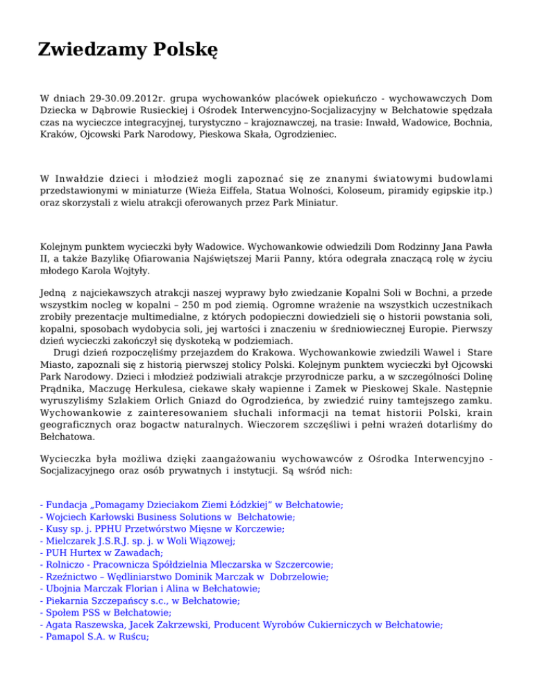 Zwiedzamy Polskę W dniach 29-30.09.2012r. grupa wychowanków placówek opiekuńczo - wychowawczych Dom Dziecka w Dąbrowie Rusieckiej i Ośrodek Interwencyjno-Socjalizacyjny w Bełchatowie spędzała czas na wycieczce integracyjnej, turystyczno – krajoznawczej, na trasie: Inwałd, Wadowice, Bochnia, Kraków, Ojcowski Park Narodowy, Pieskowa Skała, Ogrodzieniec. W Inwałdzie dzieci i młodzież mogli zapoznać się ze znanymi światowymi budowlami przedstawionymi w miniaturze (Wieża Eiffela, Statua Wolności, Koloseum, piramidy egipskie itp.) oraz skorzystali z wielu atrakcji oferowanych przez Park Miniatur. Kolejnym punktem wycieczki były Wadowice. Wychowankowie odwiedzili Dom Rodzinny Jana Pawła II, a także Bazylikę Ofiarowania Najświętszej Marii Panny, która odegrała znaczącą rolę w życiu młodego Karola Wojtyły. Jedną z najciekawszych atrakcji naszej wyprawy było zwiedzanie Kopalni Soli w Bochni, a przede wszystkim nocleg w kopalni – 250 m pod ziemią. Ogromne wrażenie na wszystkich uczestnikach zrobiły prezentacje multimedialne, z których podopieczni dowiedzieli się o historii powstania soli, kopalni, sposobach wydobycia soli, jej wartości i znaczeniu w średniowiecznej Europie. Pierwszy dzień wycieczki zakończył się dyskoteką w podziemiach. Drugi dzień rozpoczęliśmy przejazdem do Krakowa. Wychowankowie zwiedzili Wawel i Stare Miasto, zapoznali się z historią pierwszej stolicy Polski. Kolejnym punktem wycieczki był Ojcowski Park Narodowy. Dzieci i młodzież podziwiali atrakcje przyrodnicze parku, a w szczególności Dolinę Prądnika, Maczugę Herkulesa, ciekawe skały wapienne i Zamek w Pieskowej Skale. Następnie wyruszyliśmy Szlakiem Orlich Gniazd do Ogrodzieńca, by zwiedzić ruiny tamtejszego zamku. Wychowankowie z zainteresowaniem słuchali informacji na temat historii Polski, krain geograficznych oraz bogactw naturalnych. Wieczorem szczęśliwi i pełni wrażeń dotarliśmy do Bełchatowa. Wycieczka była możliwa dzięki zaangażowaniu wychowawców z Ośrodka Interwencyjno Socjalizacyjnego oraz osób prywatnych i instytucji. Są wśród nich: - Fundacja „Pomagamy Dzieciakom Ziemi Łódzkiej” w Bełchatowie; - Wojciech Karłowski Business Solutions w Bełchatowie; - Kusy sp. j. PPHU Przetwórstwo Mięsne w Korczewie; - Mielczarek J.S.R.J. sp. j. w Woli Wiązowej; - PUH Hurtex w Zawadach; - Rolniczo - Pracownicza Spółdzielnia Mleczarska w Szczercowie; - Rzeźnictwo – Wędliniarstwo Dominik Marczak w Dobrzelowie; - Ubojnia Marczak Florian i Alina w Bełchatowie; - Piekarnia Szczepańscy s.c., w Bełchatowie; - Społem PSS w Bełchatowie; - Agata Raszewska, Jacek Zakrzewski, Producent Wyrobów Cukierniczych w Bełchatowie; - Pamapol S.A. w Ruścu; - Nowakowskie Zakłady Przetwórstwa Mięsnego w Sławnie; - Okręgowa Spółdzielnia Mleczarska w Radomsku; - Muzeum Dom Rodzinny Ojca Świętego w Wadowicach; - „Zamek” Sp. z o. o. w Ogrodzieńcu; - Restauracja „Pod Smoczą Jamą” w Krakowie; - Dyrektor Finansowy Uzdrowiska Kopalnia Soli Bochnia Sp. z o. o. w Bochni; - Ewelina Sacharewicz-Sędziak – menager ds. gastronomii; - Park Miniatur „Świat Marzeń” Inwałd. Serdecznie dziękujemy. Lidia Szymańska - Dyrektor Centrum Administracyjnego ds. Obsługi Placówek Opiekuńczo Wychowawczych