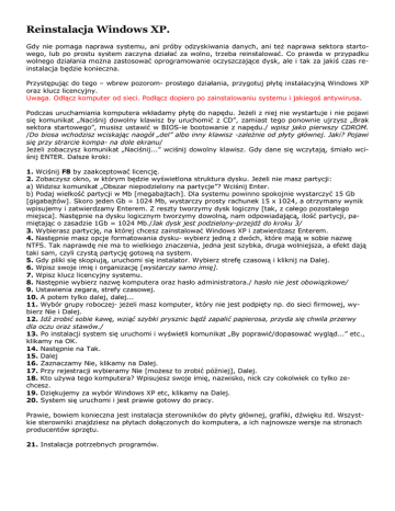 Reinstalacja Windows XP. Gdy nie pomaga naprawa systemu, ani próby odzyskiwania danych, ani też naprawa sektora startowego, lub po prostu system zaczyna działać za wolno, trzeba reinstalować. Co prawda w przypadku wolnego działania można zastosować oprogramowanie oczyszczające dysk, ale i tak za jakiś czas reinstalacja będzie konieczna. Przystępując do tego – wbrew pozorom- prostego działania, przygotuj płytę instalacyjną Windows XP oraz klucz licencyjny. Uwaga. Odłącz komputer od sieci. Podłącz dopiero po zainstalowaniu systemu i jakiegoś antywirusa. Podczas uruchamiania komputera wkładamy płytę do napędu. Jeżeli z niej nie wystartuje i nie pojawi się komunikat „Naciśnij dowolny klawisz by uruchomić z CD”, zamiast tego ponownie ujrzysz „Brak sektora startowego”, musisz ustawić w BIOS-ie bootowanie z napędu./ wpisz jako pierwszy CDROM. /Do biosa wchodzisz wciskając naogół „del” albo inny klawisz -zależnie od płyty głównej. Jaki? Pojawi się przy strarcie kompa- na dole ekranu/ Jeżeli zobaczysz komunikat „Naciśnij...” wciśnij dowolny klawisz. Gdy dane się wczytają, śmiało wciśnij ENTER. Dalsze kroki: 1. Wciśnij F8 by zaakceptować licencję. 2. Zobaczysz okno, w którym będzie wyświetlona struktura dysku. Jeżeli nie masz partycji: a) Widzisz komunikat „Obszar niepodzielony na partycje”? Wciśnij Enter. b) Podaj wielkość partycji w Mb [megabajtach]. Dla systemu powinno spokojnie wystarczyć 15 Gb [gigabajtów]. Skoro jeden Gb = 1024 Mb, wystarczy prosty rachunek 15 x 1024, a otrzymany wynik wpisujemy i zatwierdzamy Enterem. Z reszty tworzymy dysk logiczny [tak, z całego pozostałego miejsca]. Następnie na dysku logicznym tworzymy dowolną, nam odpowiadającą, ilość partycji, pamiętając o zasadzie 1Gb = 1024 Mb./Jak dysk jest podzielony-przejdź do kroku 3/ 3. Wybierasz partycję, na której chcesz zainstalować Windows XP i zatwierdzasz Enterem. 4. Następnie masz opcje formatowania dysku- wybierz jedną z dwóch, które mają w sobie nazwę NTFS. Tak naprawdę nie ma to wielkiego znaczenia, jedna jest szybka, druga wolniejsza, a efekt dają taki sam, czyli czystą partycję gotową na system. 5. Gdy pliki się skopiują, uruchomi się instalator. Wybierz strefę czasową i kliknij na Dalej. 6. Wpisz swoje imię i organizację [wystarczy samo imię]. 7. Wpisz klucz licencyjny systemu. 8. Następnie wybierz nazwę komputera oraz hasło administratora./ hasło nie jest obowiązkowe/ 9. Ustawienia zegara, strefy czasowej. 10. A potem tylko dalej, dalej... 11. Wybór grupy roboczej- jeżeli masz komputer, który nie jest podpięty np. do sieci firmowej, wybierz Nie i Dalej. 12. Idź zrobić sobie kawę, wziąć szybki prysznic bądź zapalić papierosa, przyda się chwila przerwy dla oczu oraz stawów./ 13. Po instalacji system się uruchomi i wyświetli komunikat „By poprawić/dopasować wygląd...” etc., klikamy na OK. 14. Następnie na Tak. 15. Dalej 16. Zaznaczamy Nie, klikamy na Dalej. 17. Przy rejestracji wybieramy Nie [możesz to zrobić później], Dalej. 18. Kto używa tego komputera? Wpisujesz swoje imię, nazwisko, nick czy cokolwiek co tylko zechcesz. 19. Dziękujemy za wybór Windows XP etc, klikamy na Dalej. 20. System się uruchomi i jest prawie gotowy do pracy. Prawie, bowiem konieczna jest instalacja sterowników do płyty głównej, grafiki, dźwięku itd. Wszystkie sterowniki znajdziesz na płytach dołączonych do komputera, a ich najnowsze wersje na stronach producentów sprzętu. 21. Instalacja potrzebnych programów.