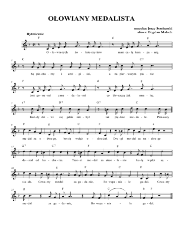 OŁOWIANY MEDALISTA muzyka: Jerzy Stachurski słowa: Bogdan Malach Rytmicznie F r r œr œj. œ œ &b c ‰ O - ło - wia-nych 3 C &b ‰ 5 F &b ‰ r r j j œ œ œ œ œ J a7 &b ‰ &b czoł - gi - ści, r r œr œj. œ œ j œ. r r j œ œ œ. œ œr œ R J z me j œ œJ D7 & b œJ œ . me - dal bo się Czwa - rty Œ G7 ‰ nœ J tak ˙ wciąż o Trze - ci na pier - wszym F za ga - da - nie, œ. j œ œ. g sma - lec. C œ œ R J pię - kne œ œ R J œ œ œ R R me - da - le. Pier-wszy œ œ Ó - dwa-żał. me - dal Dru - gi Œ me - dal za na - dwa - gę œ œ Œ œj j œ ˙ g za strze - la - nie ku - lą C za ga - da - nie, a œ œ œ œ œ œ Œ Jœ n Jœ F j j œ œj œ œ . œ J pla - nie bły - szczą jak œ œ . Œ œj œj œj œ . Œ œj œj ˙ J g me-dal C7 F F ku - cha - rza. & b œ œ Œ Jœ n œJ g co zdo - był j œ r r œr œj. œ œ œ œ Œ œ nœ œ œ œ œ J J 20 25 gdzie C7 & b œ œ œ nœ ‰ j œ œ J œ œr œ J R a C o - dwa-gę, G7 sia - da. się g œ œ œ œ do - stał od œ J mam ca - łą kom - pa - nię. ‰ d g ‰ F da - la - mi - œ Œ œj œj ˙ œ F me - dal za 15 j j j œ œ œ r r œr œj. œj œ . œ œ d łnie - rzy - ków i Każ - dy dzi - wi 9 - żo Są pie - chu - rzy jest ge - ne - rał 7 r r j œ œ œ. j œ. C ˙ Bo wspa - nia j œ œ. œ - ˙ w płot są - F Bo wspa - nia - le j j œ œ œ C le Œ œ nœ j J J œ œ. ga - dał. b Czwa - rty F œ œ Ó ga - dał. 2 OŁOWIANY MEDALISTA 1. Ołowianych żołnierzyków mam całą kompanię. Są piechurzy i czołgiści, a na pierwszym planie Jest generał z medalami co błyszczą jak smalec. Każdy dziwi się gdzie zdobył tak piękne medale. Pierwszy medal za odwagę Bo się wciąż odważał. Drugi medal za nadwagę Dostał od kucharza. Trzeci medal za strzelanie Kulą w płot sąsiada. Czwarty medal za gadanie Bo wspaniale gadał. 3. Ołowiane żołnierzyki śpią znów na komodzie. I do tego głośno chrapią bo to ponoć w modzie. Razem z nimi - pan generał - równie okazale, Tak, że słychać jak mu dzwonią na piersi medale. Pierwszy medal za odwagę Bo się wciąż odważał. Drugi medal za nadwagę Dostał od kucharza. Trzeci medal za strzelani Kulą w płot sąsiada. Czwarty medal za gadanie Bo wspaniale gadał. 2. Ołowiane żołnierzyki poszły na ćwiczenia. Są piechurzy i czołgiści, nie ma dowodzenia. Bo generał ćwiczeniami nie przejął się wcale Wyjął z szafy dużą szczotkę i czyści medale. Pierwszy medal za odwagę Bo się wciąż odważał. Drugi medal za nadwagę Dostał od kucharza. Trzeci medal za strzelanie Kulą w płot sąsiada. Czwarty medal za gadanie Bo wspaniale gadał. 4. Ołowiane żołnierzyki poszły na złomowiec, No bo ołów to jest cenny dla kraju surowiec. Poszedł także pan generał, chociaż z wielkim żalem, Bo zostawić musiał w domu wszystkie swe medale. Pierwszy medal za odwagę Bo się wciąż odważał. Drugi medal za nadwagę Dostał od kucharza. Trzeci medal za strzelanie Kulą w płot sąsiada. Czwarty medal za gadanie Bo wspaniale gadał.