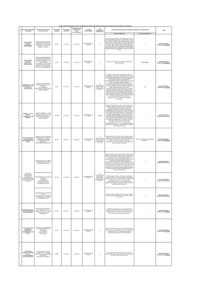 WYKAZ LABORATORIÓW BADANIA WODY ZATWIERDZONYCH PRZEZ PAŃSTWOWEGO POWIATOWEGO INSPEKTORA SANITARNEGO W KATOWICACH Lp Nazwa i adres organizacji macierzystej Nazwa i adres laboratorium /telefon/faks/e- mail Nr certyfikatu akredytacji Data ważności akredytacji Data zatwierdzenia laboratorium do badań monitoringowych Nr decyzji zatwierdzającej Ilość upoważnionych próbkobiorców Zakres zatwierdzonych badań z podziałem na akredytowane i nieakredytowane badania nieakredytowane - data obowiązywania zatwierdzenia: 07.10.2016r. radon (Rn-222) data obowiązywania zatwierdzenia: 20.01.2017r. ozon data obowiązywania zatwierdzenia: 18.11.2016r. 1 Główny Instytut Górnictwa Plac Gwarków 1, 40- 166 Katowice Zakład Monitoringu Środowiska Głównego Instytutu Górnictwa Plac Gwarków 1, 40- 166 Katowice tel. 32 258 16 31; 32 259 22 73; [email protected]; [email protected] AB 145 17.07.2017r. 07.10.2015r. NS/HKiŚ/4560/ZL/33192/2015 3 jon amonowy, barwa, chlorki, glin, mangan, mętność (NTU), ogólny węgiel organiczny (OWO), pH, przewodność, siarczany, sód, utlenialność z KMnO4 (indeks nadmanganianowy), żelazo, antymon, arsen, azotany, azotyny, bor, bromiany, ∑chloranów i chlorynów, chrom, cyjanki, fluorki, kadm, miedź, nikiel, ołów, rtęć, selen, magnez, srebro, twardość, benzen, bezo(a)piren, bromodichlorometan, tetrachlorometan (czterochlorek węgla), trichlorometan (chloroform), ∑trichloroetenu i tetrachloroetenu, ∑Wielopierścieniowych węglowodorów aromatycznych (WWA), ∑THM 2 Główny Instytut Górnictwa Plac Gwarków 1, 40- 166 Katowice Zespół Laboratoriów Badawczych i Wzorcujących Głównego Instytutu Górnictwa - Śląskie Centrum Radiometrii Środowiskowej im. Marii Goeppert Mayer Plac Gwarków 1, 40- 166 Katowice telefon/faks 32 259 22 95 strona internetowa: www.radiometria.gig.eu adres e-mail: [email protected] AB 005 30.12.2018r. 20.01.2016r. NS/HKiŚ/4560/ZL/15/2016 3 tryt (izotop H-3), izotop radu: Ra- 226; izotop radu: R-228; dawka orientacyjna; 3 Ośrodek Badań i Kontroli Środowiska Sp. z o.o. ul. Owocowa 8, 40- 158, Katowice Laboratorium Ośrodka Badań i Kontroli Środowiska Sp. z o.o. ul. Owocowa 8, 40- 158, Katowice telefon 32 259 70 36 faks 32 259 70 30 [email protected] AB 213 09.11.2017r. 18.11.2015r. Uwagi badania akredytowane NS/HKiŚ/4560/ZL/39228/2015 akryloamid, antymon, arsen, azotany, azotyny, benzen, benzo(a)piren, bor, bromiany, chlorek winylu, chrom, cyjanki, 1,2- dichloroetan, epichlorohydryna, fluorki, kadm, miedź, nikiel, ołów, pestycydy/∑pestycydów, rtęć, selen, ∑trichloroetenu i tetrachloroetenu, ∑WWA - benzo(b)fluoranten, benzo(k)fluoranten, benzo(g,h,i)perylen, indeno(1,2,3- cd)piren, ΣTHM - trichlorometan, dichlorobromometan, dibromochlorometan, tribromometan, jon amonowy, barwa, 4 chlorki, glin, mangan, mętność, ogólny węgiel organiczny Pobieranie próbek (OWO), pH, przewodność, siarczany, smak, sód, utlenialność wody do badań (indeks nadmanganianowy), zapach, żelazo, objęte jest zakresem bromodichlorometan, chlor wolny, chloraminy, ∑ chloranów i akredytacji. chlorynów, formaldehyd, ftalan dibutylu, magnez, srebro, tetrachlorometan (czterochlorek węgla), ∑trichlorobenzenów, 2,4,6- trichlorofenol, trichlorometan (chloroform), twardość, Escherichia coli, bakterie grupy coli, Enterokoki (Paciorkowce kałowe), Clostridium perfringens (łącznie ze sporami), ogólna o liczba mikroorganizmów w 36 C, ogólna liczba o mikroorganizmów w 22 C, Pseudomonas aeruginosa, Legionella sp. - data obowiązywania zatwierdzenia: 21.04.2017r. 4 JARS Sp. z o.o. Filia Południe ul. Fabryczna 7, 41- 404 Mysłowice Laboratorium JARS Sp. z o.o. Filia Południe ul. Fabryczna 7, 41- 404 Mysłowice, telefon 32 600 01 03, adres mailowy: [email protected]; [email protected] AB 1095 01.10.2017r. 21.04.2016r. NS/HKiŚ/4560/ZL/2710/2016 7 osób akryloamid, antymon, arsen, azotany, azotyny, benzen, bor, bromiany, chlorek winylu, chrom, cyjanki, 1,2- dichloroetan, epichlorohydryna, fluorki, kadm, miedź, nikiel, ołów, pestycydy/Σ pestycydów, rtęć, selen, Σtrichloroetenu i tetrachloroetenu, Σ THM - trichlorometan, dichlorobromometan, dibromochlorometan, tribromometan, amonowy jon, chlorki, glin, mangan, ogólny węgiel organiczny, pH, przewodność, sód, żelazo, bromodichlorometan, chloraminy, Σ chloranów i chlorynów, formaldehyd, ftalan dibutylu, magnez, srebro, tetrachlorometan (czterochlorek węgla), Σ trichlorbenzenów, 2,4,6- trichlorofenol, trichlorometan (chloroform), twardość, Escherichia coli, bakterie grupy coli, Enterokoki, Clostridium perfringens (łącznie ze sporami), ogólna liczba mikroorganizmów w 36 oC ± 2 oC, ogólna liczba mikroorganizmów w 22 oC ± 2 oC, Pseudomonas aeruginoas, Legionella sp., benzo(a)piren, barwa, utlenialność z KMnO4, ∑ WWA, mętność, siarczany 5 Katowickie Wodociągi S.A. ul. Obrońców Westerplatte 89, 40- 335 Katowice Laboratorium Centralne Katowickich Wodociągów S.A. ul. Obrońców Westerplatte 130, Katowice tel. 327882600 faks 7882503 adres mailowy: kancelaria@wodociągi.katowice.pl AB 1433 22.04.2017r. 04.09.2015r. NS/HKiŚ/4560/ZL/30172/2015 17 Pobieranie próbek wody do badań objęte jest zakresem akredytacji. mętność, barwa, pH, jon amonowy, azotyny, azotany, żelazo, chlorki, glin, przewodność, chlor wolny, mangan, twardość, bakterie grupy coli, Escherichia coli, Enterokoki (paciorkowce kałowe), Clostridium perfringens, ogólna liczba mikroorganizmów w 36oC, ogólna liczba mikroorganizmów w 22oC, Pseudomonas aeruginosa zapach, smak, siarczany, utlenialność, Legionella sp. data obowiązywania zatwierdzenia: 05.09.2016r. mętność, barwa, pH, smak, zapach, żelazo, mangan, glin, bor, cyjanki, sód, jon amonowy, magnez, twardość, przewodność, azotyny, azotany, fluorki, chlorki, siarczany, bromiany, miedź, nikiel, kadm, chrom, ołów, arsen, selen, chloroform, bromodichlorometan, dibromochlorometan, bromoform, ΣTHM, 1,2- di