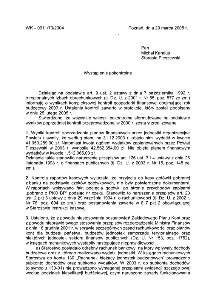 WK – 0911/70/2004 Poznań, dnia 29 marca 2005 r. . Pan Michał Karalus Starosta Pleszewski Wystąpienie pokontrolne Działając na podstawie art. 9 ust. 2 ustawy z dnia 7 października 1992 r. o regionalnych izbach obrachunkowych (tj. Dz. U. z 2001 r. Nr 55, poz. 577 ze zm.) informuję o wynikach kompleksowej kontroli gospodarki finansowej obejmuj ącej rok budżetowy 2003 r. Ustalenia kontroli zawarto w protokole, który zosta ł podpisany w dniu 25 lutego 2005 r. Stwierdzono, że wszystkie wnioski pokontrolne sformułowane na podstawie wyników poprzedniej kontroli przeprowadzonej w 2000 r. zosta ły zrealizowane. 1. Wyniki kontroli sporządzania planów finansowych przez jednostki organizacyjne Powiatu ujawniły, że według stanu na 31.12.2003 r. objęto nimi wydatki w kwocie 41.050.289,00 zł. Natomiast kwota ogółem wydatków zaplanowanych przez Powiat Pleszewski w 2003 r. wynosiła 42.562.354,00 zł. Nie objęto planem finansowym wydatków w kwocie 1.512.065,00 zł. Działanie takie stanowiło naruszenie przepisów art. 126 ust. 3 i 4 ustawy z dnia 26 listopada 1998 r. o finansach publicznych (tj. Dz. U. z 2003 r. Nr 15, poz. 148 ze zm.). 2. Kontrola raportów kasowych wykazała, że przyjęcia do kasy gotówki pobranej z banku na podstawie czeków gotówkowych, nie były potwierdzone dokumentami. W raportach wpisywano fakt podjęcia gotówki po stronie przychodów zapisami „pobrano z PKO BP” podając nr czeku. Stanowiło to naruszenie przepisów art. 20 ust. 2 pkt 3 ustawy z dnia 29 września 1994 r. o rachunkowości (tj. Dz. U. z 2002 r. Nr 76, poz. 694 ze zm.) oraz postanowienia zawarte w § 7 pkt 2 obowi ązującej w Starostwie Instrukcji kasowej. 3. Ustalono, że z powodu niestosowania postanowień Zakładowego Planu Kont oraz z powodu nieprawidłowego stosowania przepisów rozporządzenia Ministra Finansów z dnia 18 grudnia 2001 r. w sprawie szczególnych zasad rachunkowo ści oraz planów kont dla budżetu państwa, budżetów jednostek samorządu terytorialnego oraz niektórych jednostek sektora finansów publicznych (Dz. U. Nr 153, poz. 1752), w księgach rachunkowych wystąpiły następujące nieprawidłowości: a) Starostwo posiadało odrębny rachunek bankowy, na który wpływały dochody budżetowe oraz z którego realizowano wydatki jednostki. W ksi ęgach rachunkowych Starostwa do konta 130 „Rachunek bieżący jednostek budżetowych” prowadzono subkonto dochodów oraz subkonto wydatków. W 2003 r. do subkonta dochodów (o symbolu 130-01) nie prowadzono wymaganej przepisami ewidencji szczegó łowej według podziałek klasyfikacji budżetowej, czym naruszono zasady funkcjonowania konta 130 określone w Załączniku Nr 2 do rozporządzenia w sprawie szczególnych zasad rachunkowości oraz planów kont [...], a także w Zakładowym Planie Kont. Ewidencja analityczna według podziałek klasyfikacji budżetowej do subkonta dochodów budżetowych została zaprowadzona w księgach rachunkowych Starostwa od dnia 01.01.2004 r. b) rozrachunki z tytułu sprzedaży lokali mieszkalnych prowadzono w Starostwie na koncie 200 „Rozrachunki z odbiorcami i dostawcami” (zgodnym z ZPK) w podziale na poszczególnych nabywców. Na dzień 31.12.2003 r. konta analityczne tych rozrachunków wykazywały salda Wn na łączną kwotę 35.551,73 zł i dotyczyły należności, których termin zapłaty został rozłożony na raty i przypadał na lata następne. Księgowanie rozrachunków z tytułu dochodów budżetowych uzyskanych ze sprzedaży nieruchomości na koncie 200 „Rozrachunki z odbiorcami i dostawcami” zamiast na koncie 221 „Należności z tytułu dochodów budżetowych” oraz nieprzeksięgowanie należności płatnych w kolejnych latach na konto 226 „Długoterminowe należności budżetowe” było niezgodne z zasadami funkcjonowania wymienionych kont rozrachunkowych określonymi w Załączniku Nr 2 do rozporządzenia w sprawie szczególnych zasad rachunkowości oraz planów kont [...], a także w Zakładowym Planie Kont przewidującym funkcjonowanie konta 226. Skutkiem prowadzenia powyższego sposobu ewidencji rozrachunków było wykazanie w aktywach bilansu Starostwa należności w kwocie 35.551,73 zł w poz. B.II.1.1. ”Należności z tytułu dostaw i usług” zamiast w poz. A.III „Należności długoterminowe”. c) odsetki naliczone przez bank od środków na rachunku bankowym Powiatowego Funduszu Ochrony Środowiska i Gospodarki Wodnej księgowane były w 2003 r.: Wn 135 „Rachunki środków funduszy specjalnego przeznaczenia” (Rachunek PFOŚiGW), Ma 853 „Fundusze pozabudżetowe” (PFOŚiGW). W ciągu roku odsetki przekazywano na dochody budżetowe (łącznie przekazano kwotę 26,61 zł), co księgowano zapisami: Wn 222, Ma 135. W wyniku powyższych księgowań na dzień 31.12.2003 r. w księgach prowadzonych dla PFOŚiGW konto 853 wykazywało zawyżony stan funduszu o kwotę 26,61 zł. Księgowanie odsetek stanowiących dochody budżetu Powiatu na stronie Ma konta 853, naruszyło zasady funkcjonowania tego konta, określone w Załączniku Nr 2 do rozporządzenia w sprawie szczególnych zasad rachunkowości oraz planów kont [...]. d) w dniu 03.02.2003 r. z rachunku bankowego Starostwa zap łacono odsetki w kwocie 22,64 zł z tytułu nieterminowej zapłaty zobowiązania wobec Telekomunikacji Polskiej S.A. w Kaliszu. Zapłaty dokonano na podstawie wystawionej przez kontrahenta w dniu 17.01.2003 r. Noty odsetkowej nr DKL90072116/001/03. Dokument zaksięgowano w koszty proste na koncie zespołu 4 – konto analityczne 402 (strona Wn) zamiast na koncie 750 „Przychody i koszty finansowe”, co było niezgodne z zasadami funkcjonowania tych kont okre ślonymi w Załączniku Nr 2 do rozporządzenia w sprawie szczególnych zasad rachunkowości oraz planów kont [...]. e) według ewidencji księgowej Starostwa konto 011 „Środki trwałe” w 2003 r. wykazywało: - stan na dzień 01.01.2003 r. (B.O.) - kwota 4.855.991,68 zł, - obroty Wn w ciągu roku -