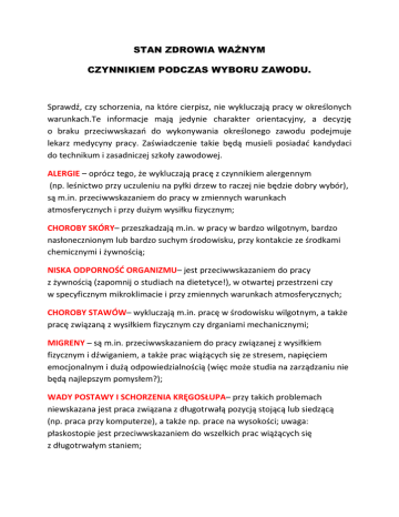 STAN ZDROWIA WAŻNYM CZYNNIKIEM PODCZAS WYBORU ZAWODU. Sprawdź, czy schorzenia, na które cierpisz, nie wykluczają pracy w określonych warunkach.Te informacje mają jedynie charakter orientacyjny, a decyzję o braku przeciwwskazań do wykonywania określonego zawodu podejmuje lekarz medycyny pracy. Zaświadczenie takie będą musieli posiadać kandydaci do technikum i zasadniczej szkoły zawodowej. ALERGIE – oprócz tego, że wykluczają pracę z czynnikiem alergennym (np. leśnictwo przy uczuleniu na pyłki drzew to raczej nie będzie dobry wybór), są m.in. przeciwwskazaniem do pracy w zmiennych warunkach atmosferycznych i przy dużym wysiłku fizycznym; CHOROBY SKÓRY– przeszkadzają m.in. w pracy w bardzo wilgotnym, bardzo nasłonecznionym lub bardzo suchym środowisku, przy kontakcie ze środkami chemicznymi i żywnością; NISKA ODPORNOŚĆ ORGANIZMU– jest przeciwwskazaniem do pracy z żywnością (zapomnij o studiach na dietetyce!), w otwartej przestrzeni czy w specyficznym mikroklimacie i przy zmiennych warunkach atmosferycznych; CHOROBY STAWÓW– wykluczają m.in. pracę w środowisku wilgotnym, a także pracę związaną z wysiłkiem fizycznym czy drganiami mechanicznymi; MIGRENY – są m.in. przeciwwskazaniem do pracy związanej z wysiłkiem fizycznym i dźwiganiem, a także prac wiążących się ze stresem, napięciem emocjonalnym i dużą odpowiedzialnością (więc może studia na zarządzaniu nie będą najlepszym pomysłem?); WADY POSTAWY I SCHORZENIA KRĘGOSŁUPA– przy takich problemach niewskazana jest praca związana z długotrwałą pozycją stojącą lub siedzącą (np. praca przy komputerze), a także np. prace na wysokości; uwaga: płaskostopie jest przeciwwskazaniem do wszelkich prac wiążących się z długotrwałym staniem; CHOROBY UKŁADU KRĄŻENIA– przeszkadzają m.in. przy pracy związanej z wysiłkiem fizycznym czy dźwiganiem, wiążącej się z dużym napięciem i stresem, a także w pracy w specyficznych warunkach (np. w gorących pomieszczeniach, pod wodą, pod ziemią, praca związana z działaniem pola elektromagnetycznego); WADY SŁUCHU– wykluczają m.in. pracę z ludźmi (z klientami, pacjentami, interesariuszami), prace polegające na konieczności zdiagnozowania stanu urządzeń czy organizmów żywych; WADY WZROKU– są m.in. przeciwwskazaniem do pracy wymagającej dużej precyzji i dokładności, do prowadzenia diagnostyki.