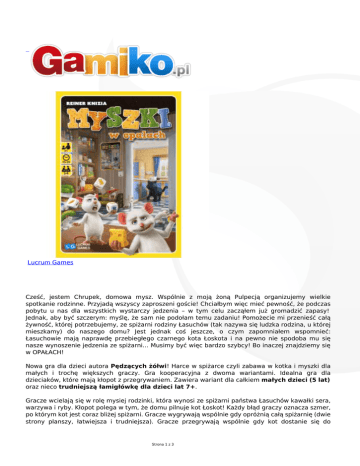 Lucrum Games Cześć, jestem Chrupek, domowa mysz. Wspólnie z moją żoną Pulpecją organizujemy wielkie spotkanie rodzinne. Przyjadą wszyscy zaproszeni goście! Chciałbym więc mieć pewność, że podczas pobytu u nas dla wszystkich wystarczy jedzenia – w tym celu zacząłem już gromadzić zapasy! Jednak, aby być szczerym: myślę, że sam nie podołam temu zadaniu! Pomożecie mi przenieść całą żywność, której potrzebujemy, ze spiżarni rodziny Łasuchów (tak nazywa się ludzka rodzina, u której mieszkamy) do naszego domu? Jest jednak coś jeszcze, o czym zapomniałem wspomnieć: Łasuchowie mają naprawdę przebiegłego czarnego kota Łoskota i na pewno nie spodoba mu się nasze wynoszenie jedzenia ze spiżarni… Musimy być więc bardzo szybcy! Bo inaczej znajdziemy się w OPAŁACH! Nowa gra dla dzieci autora Pędzących żółwi! Harce w spiżarce czyli zabawa w kotka i myszki dla małych i trochę większych graczy. Gra kooperacyjna z dwoma wariantami. Idealna gra dla dzieciaków, które mają kłopot z przegrywaniem. Zawiera wariant dla całkiem małych dzieci (5 lat) oraz nieco trudniejszą łamigłówkę dla dzieci lat 7+. Gracze wcielają się w rolę mysiej rodzinki, która wynosi ze spiżarni państwa Łasuchów kawałki sera, warzywa i ryby. Kłopot polega w tym, że domu pilnuje kot Łoskot! Każdy błąd graczy oznacza szmer, po którym kot jest coraz bliżej spiżarni. Gracze wygrywają wspólnie gdy opróżnią całą spiżarnię (dwie strony planszy, łatwiejsza i trudniejsza). Gracze przegrywają wspólnie gdy kot dostanie się do Strona 1 z 3 spiżarni zanim zostanie ona opróżniona. Jednak autor pokazuje jak gracze byli blisko sukcesu i zachęca do zagrania ponownie. Zawartość pudełka: dwustronna plansza do gry 56 mysich żetonów figurka kota 3 drewniane kostki instrukcja Wiek 7+ Liczba graczy 2-4 Czas gry ok. 20 minut Instrukcja polska Wydanie polskie Producent Lucrum Games Strona 2 z 3 Projektant Reiner Knizia Strona 3 z 3