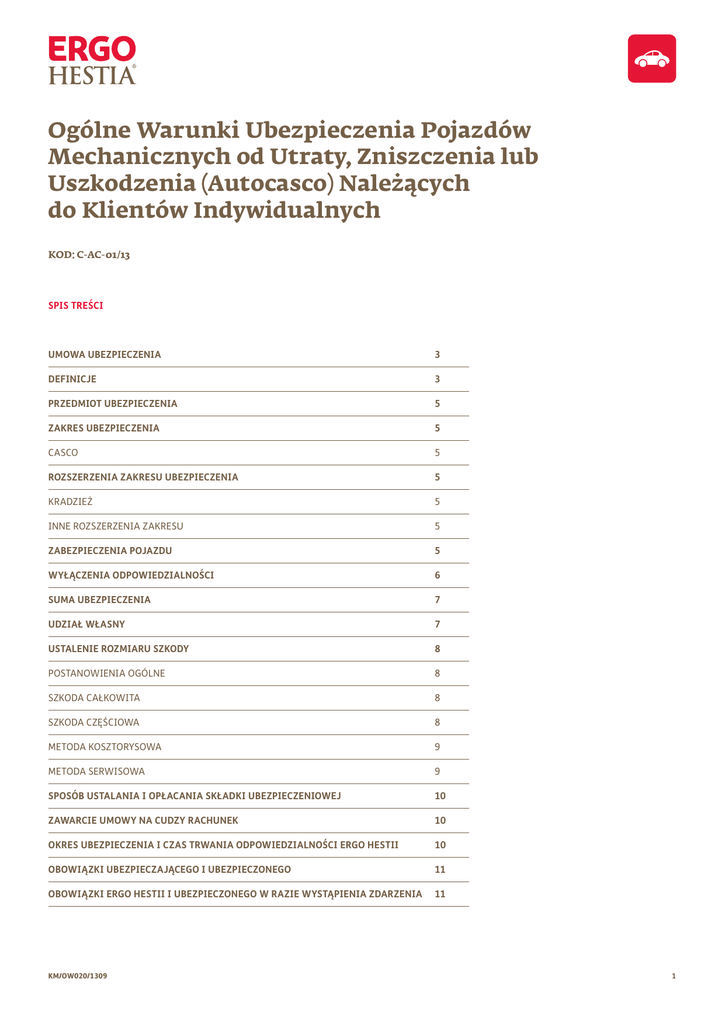 Ogólne Warunki Ubezpieczenia Pojazdów Mechanicznych od Utraty, Zniszczenia lub Uszkodzenia (Autocasco) Należących do Klientów Indywidualnych KOD: C-AC-01/13 SPIS TREŚCI UMOWA UBEZPIECZENIA 3 DEFINICJE 3 PRZEDMIOT UBEZPIECZENIA 5 ZAKRES UBEZPIECZENIA 5 CASCO 5 ROZSZERZENIA ZAKRESU UBEZPIECZENIA 5 KRADZIEŻ 5 INNE ROZSZERZENIA ZAKRESU 5 ZABEZPIECZENIA POJAZDU 5 WYŁĄCZENIA ODPOWIEDZIALNOŚCI 6 SUMA UBEZPIECZENIA 7 UDZIAŁ WŁASNY 7 USTALENIE ROZMIARU SZKODY 8 POSTANOWIENIA OGÓLNE 8 SZKODA CAŁKOWITA 8 SZKODA CZĘŚCIOWA 8 METODA KOSZTORYSOWA 9 METODA SERWISOWA 9 SPOSÓB USTALANIA I OPŁACANIA SKŁADKI UBEZPIECZENIOWEJ 10 ZAWARCIE UMOWY NA CUDZY RACHUNEK 10 OKRES UBEZPIECZENIA I CZAS TRWANIA ODPOWIEDZIALNOŚCI ERGO HESTII 10 OBOWIĄZKI UBEZPIECZAJĄCEGO I UBEZPIECZONEGO 11 OBOWIĄZKI ERGO HESTII I UBEZPIECZONEGO W RAZIE WYSTĄPIENIA ZDARZENIA 11 KM/OW020/1309 1 WYPŁATA ODSZKODOWANIA 12 REGRES UBEZPIECZENIOWY 12 ROZWIĄZANIE UMOWY UBEZPIECZENIA 13 POSTANOWIENIA KOŃCOWE 13 KLAUZULE 14 01 BAGAŻ 14 02 STAŁA SUMA UBEZPIECZENIA 14 03 OCHRONA UTRATY ZNIŻKI AC 14 2 KM/OW020/1309 Infolinia 801 107 107*, 58 555 5 555 *opłata za połączenie zgodnie z cennikiem operatora www.ergohestia.pl UMOWA UBEZPIECZENIA §1 1. Na podstawie niniejszych Ogólnych Warunków Ubezpieczenia Sopockie Towarzystwo Ubezpieczeń Ergo Hestia SA, zwane dalej Ergo Hestią, w zakresie działania swego przedsiębiorstwa, zawiera umowy ubezpieczenia pojazdów mechanicznych od utraty, zniszczenia lub uszkodzenia (Autocasco) z osobami fizycznymi nieprowadzącymi działalności gospodarczej oraz przedsiębiorcami, zwanymi dalej Ubezpieczającymi. 2. Informujemy, że w związku z zawartą umową ubezpieczenia, na podstawie art. 24 ust. 1 Ustawy z dnia 29.08.1997 r. o ochronie danych osobowych (tekst jednolity: Dz. U. z 2002 r., Nr 101, poz. 926 z późn. zmianami): 1) Sopockie Towarzystwo Ubezpieczeń Ergo Hestia SA z siedzibą w Sopocie przy ul. Hestii 1, zwane dalej Ergo Hestią, jest administratorem Pani / Pana danych osobowych, które będą przez nią przetwarzane w celu wywiązania się z umowy ubezpieczenia oraz dla wypełnienia prawnie usprawiedliwionych celów, którymi są w szczególności: marketing bezpośredni własnych produktów i usług oraz dochodzenie roszczeń z tytułu zawartej umowy ubezpieczenia. Dane pobierane są na podstawie: art. 23 ust. 1 pkt 3 i pkt 5 ww. ustawy o ochronie danych osobowych i art. 815 kodeksu cywilnego, 2) służy Pani / Panu prawo wglądu do swoich danych osobowych oraz ich poprawiania, a przetwarzanie tych danych w celach innych niż wymienione powyżej prawnie usprawiedliwione cele Ergo Hestii albo osób trzecich, którym przekazywane są te dane, wymaga uzyskania Pani / Pana uprzedniej zgody. 3. Ergo Hestia nie ponosi odpowiedzialności za skutki niepodania do jej wiadomości okoliczności, o które pytała we wniosku o zawarcie umowy ubezpieczenia lub podanie tych okoliczności niezgodnie z prawdą. 4. Ubezpieczający przed zawarciem umowy ubezpieczenia powinien szczegółowo zapoznać się z treścią Ogólnych Warunków Ubezpieczenia. 5. Zwracamy uwagę, że definicje używanych pojęć mogą odbiegać od typowego, powszechnego ich znaczenia, jak też od definicji zawartych w ogólnie obowiązujących przepisach prawa. DEFINICJE §2 Pojęcia użyte w niniejszych Ogólnych Warunkach Ubezpieczenia przyjmują znaczenie określone w definicjach zamieszczonych poniżej w § 3. §3 1. ASO - autoryzowany serwis obsługi pojazdów danej marki. 2. Audatex - stosowany przez warsztaty samochodowe i firmy ubezpieczeniowe system komputerowy przeznaczony do tworzenia kalkulacji naprawy pojazdu powypadkowego. 3. Części alternatywne - części, których producent zaświadcza, że są one tej samej jakości, co oryginalne komponenty dla danego typu pojazdów. 4. Dokumenty pojazdu - dowód rejestracyjny, karta pojazdu KM/OW020/1309 (o ile została wydana), świadectwo dopuszczenia pojazdu do ruchu (w przypadku pojazdów niepodlegających rejestracji), pozwolenie czasowe wydane przez właściwy organ dokonujący rejestracji. 5. eKonto - udostępniony Ubezpieczającemu serwis internetowy, który prezentuje posiadanie przez Ubezpieczającego polisy oraz likwidowane szkody i umożliwia kontakt z Ergo Hestią w zakresie wybranych usług. 6. Eurotax - system komputerowy przeznaczony do wyceny wartości rynkowej pojazdów. 7. Kradzież - działanie wyczerpujące znamiona czynu określonego w art. 278 kk. (zabór cudzej rzeczy ruchomej w celu przywłaszczenia), 279 kk. (zabór cudzej rzeczy ruchomej z włamaniem) i 280 kk. (zabór cudzej rzeczy przy użyciu przemocy lub groźby jej użycia albo doprowadzeniu człowieka do stanu nieprzytomności lub bezbronności w celu kradzieży mienia), za kradzież nie uważa się przywłaszczenia, o którym mowa w art. 284 kk. (przywłaszczenie cudzej rzeczy ruchomej). 8. Lokaut - zamknięcie zakładu pracy przez właściciela, połączone ze zwalnianiem pracowników, przeprowadzane dla zmuszenia ich do przyjęcia gorszych warunków pracy lub ze względu na strajk. 9. Okres eksploatacji pojazdu - okres liczony od daty pierwszej rejestracji pojazdu dokonanej w roku jego produkcji do pierwszego dnia okresu ubezpieczenia; jeżeli data pierwszej rejestracji nie jest znana lub pierwsza rejestracja nastąpiła po roku produkcji, wówczas okres eksploatacji liczony jest od dnia 31 grudnia roku produkcji pojazdu; tak ustalony okres eksploatacji obowiązuje przez cały dwunastomiesięczny okres ubezpieczenia. Dla celów ustalenia odszkodowania okres eksploatacji pojazdu jest liczony od daty pierwszej rejestracji pojazdu dokonanej w roku jego produkcji do dnia zajścia wypadku; jeżeli data pierwszej rejestracji nie jest znana lub pierwsza rejestracja nastąpiła po roku produkcji, wówczas okres eksploatacji liczony jest od dnia 31 grudnia roku produkcji pojazdu do dnia zajścia wypadku. 10. Osoby trzecie - wszystkie osoby pozostające poza stosunkiem ubezpieczeni