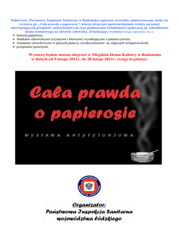 Państwowy Powiatowy Inspektor Sanitarny w Radomsku zaprasza wszystkie zainteresowane osoby na wystawę pt. „Cała prawda o papierosie”, której celem jest upowszechnianie wiedzy na temat obowiązujących przepisów antytytoniowych oraz podnoszenie świadomości społecznej nt. szkodliwości dymu tytoniowego na zdrowie człowieka. Zwiedzający wystawę mogą zapoznać się z: historią papierosa, skutkami zdrowotnymi (czynnymi i biernymi) wynikającymi z palenia tytoniu, zmianami chorobowymi w płucach palaczy uwidocznionymi na zdjęciach rentgenowskich, przepisami prawnymi. Wystawę będzie moŜna obejrzeć w Miejskim Domu Kultury w Radomsku w dniach od 9 lutego 2011r. do 28 lutego 2011r. (wstęp bezpłatny). Wystawa Cała prawda o papierosie została zorganizowana w ramach projektu „OdświeŜamy nasze miasta. TOB3CIT (Tobacco Free Cities)”. Łódź, obok Szczecina i Rzeszowa, rozpoczęła realizację projektu w kwietniu 2009 roku, którego głównym załoŜeniem jest tworzenie stref bezdymnych w miejscach publicznych. Pomysłodawcą przedsięwzięcia jest Główny Inspektorat Sanitarny, który pozyskał środki finansowe ze Światowej Fundacji ds. Walki z Chorobami Płuc (Word Lung Fundation) i Bloomberg Philanthropies. Partnerami Głównego Inspektoratu Sanitarnego są Wojewódzka Stacja Sanitarno-Epidemiologiczna w Łodzi oraz Urząd Miasta Łodzi. Misją projektu jest ochrona zdrowia ludności poprzez: • Upowszechnienie wiedzy o istniejącym prawie ustawa z dnia 9 listopada 1995 r. o ochronie zdrowia przed następstwami uŜywania tytoniu i wyrobów tytoniowych, • Podniesienie świadomości na temat wpływu dymu tytoniowego na zdrowie człowieka, a takŜe uzyskanie poparcia społecznego w zakresie tworzenia stref bezdymnych, • Tworzenie stref wolnych od dymu tytoniowego w budynkach uŜyteczności publicznej oraz na terenach otwartych najczęściej odwiedzanych przez mieszkańców. Strefy te powstaną na mocy uchwał wprowadzanych przez Rady Miast, • Wzmacnianie egzekwowania prawa w miejscach uŜyteczności publicznej objętych zakazem palenia tytoniu. Podziękowania za pomoc w organizacji wystawy dla: − Uniwersyteckiego Szpitala Klinicznego Nr 1 im. Norberta Barlickiego Uniwersytetu Medycznego w Łodzi − Wojewódzkiego Zespołu Zakładów Opieki Zdrowotnej Centrum Leczenia Chorób Płuc i Rehabilitacji w Łodzi − Katedry Medycyny Społecznej i Zapobiegawczej Uniwersytetu Medycznego w Łodzi − Instytutu Kardiologii w Warszawie − Ogrodu Botanicznego w Łodzi − Osób prywatnych, które udostępniły eksponaty wzbogacając wystawę Bibliografia 1. Tomasz Kręcicki, Maria Zalesska-Kręcicka, Robert Niewęgłowski – Atlas endoskopii krtanii, Warszawa 2003 2. Stephen A. Maisto, Mark Galizio, Gerard J. Connors – UzaleŜnienia ZaŜywanie i NaduŜywanie, Warszawa 2000 3. Centrum Onkologii - Instytut w Warszawie – materiały edukacyjne 4. Markiewicz K. Papieros a zdrowie PZWL, Warszawa 1980 5. Rzetecki W., Łukiański M. Zdrowie człowieka a papieros, Warszawa 1973 6. Światowa Organizacja Zdrowia Raport 2009. Stan zagroŜenia epidemią palenia tytoniu w Polsce 7. Turos B. Palenie a zdrowie człowieka SKZPT, Warszawa 1975 8. pod. red. Zatoński W. Rozwiać dymną zasłonę. 10 argumentów za Europą wolną od dymu tytoniowego Medycyna Praktyczna, Warszawa 2007 9. Internet: - www.portalwiedzy.onet.pl - www.kiosk.onet.pl - www.uzywki-tyton.za.pl - www.oceansbridge.com - www.gazetaprawna.pl - www.dooktor.pl - www.cash.hotmoney.pl - www.ideopolis.pl - www.zjadamyreklamy.blox.pl - www.dziennik.pl - www.retrofilia.pl - www.poradnikzdrowie.pl - www.ladiva.pl - www.static.playmobile.pl - www.vide.pl - www.beznalogu.blogspot.com