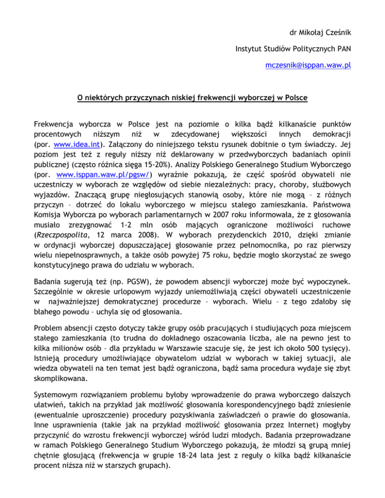 dr Mikołaj Cześnik Instytut Studiów Politycznych PAN [email protected] O niektórych przyczynach niskiej frekwencji wyborczej w Polsce Frekwencja wyborcza w Polsce jest na poziomie o kilka bądź kilkanaście punktów procentowych niższym niż w zdecydowanej większości innych demokracji (por. www.idea.int). Załączony do niniejszego tekstu rysunek dobitnie o tym świadczy. Jej poziom jest też z reguły niższy niż deklarowany w przedwyborczych badaniach opinii publicznej (często różnica sięga 15-20%). Analizy Polskiego Generalnego Studium Wyborczego (por. www.isppan.waw.pl/pgsw/) wyraźnie pokazują, że część spośród obywateli nie uczestniczy w wyborach ze względów od siebie niezależnych: pracy, choroby, służbowych wyjazdów. Znaczącą grupę niegłosujących stanowią osoby, które nie mogą – z różnych przyczyn – dotrzeć do lokalu wyborczego w miejscu stałego zamieszkania. Państwowa Komisja Wyborcza po wyborach parlamentarnych w 2007 roku informowała, że z głosowania musiało zrezygnować 1-2 mln osób mających ograniczone możliwości ruchowe (Rzeczpospolita, 12 marca 2008). W wyborach prezydenckich 2010, dzięki zmianie w ordynacji wyborczej dopuszczającej głosowanie przez pełnomocnika, po raz pierwszy wielu niepełnosprawnych, a także osób powyżej 75 roku, będzie mogło skorzystać ze swego konstytucyjnego prawa do udziału w wyborach. Badania sugerują też (np. PGSW), że powodem absencji wyborczej może być wypoczynek. Szczególnie w okresie urlopowym wyjazdy uniemożliwiają części obywateli uczestniczenie w najważniejszej demokratycznej procedurze – wyborach. Wielu – z tego zdałoby się błahego powodu – uchyla się od głosowania. Problem absencji często dotyczy także grupy osób pracujących i studiujących poza miejscem stałego zamieszkania (to trudna do dokładnego oszacowania liczba, ale na pewno jest to kilka milionów osób – dla przykładu w Warszawie szacuje się, że jest ich około 500 tysięcy). Istnieją procedury umożliwiające obywatelom udział w wyborach w takiej sytuacji, ale wiedza obywateli na ten temat jest bądź ograniczona, bądź sama procedura wydaje się zbyt skomplikowana. Systemowym rozwiązaniem problemu byłoby wprowadzenie do prawa wyborczego dalszych ułatwień, takich na przykład jak możliwość głosowania korespondencyjnego bądź zniesienie (ewentualnie uproszczenie) procedury pozyskiwania zaświadczeń o prawie do głosowania. Inne usprawnienia (takie jak na przykład możliwość głosowania przez Internet) mogłyby przyczynić do wzrostu frekwencji wyborczej wśród ludzi młodych. Badania przeprowadzane w ramach Polskiego Generalnego Studium Wyborczego pokazują, że młodzi są grupą mniej chętnie głosującą (frekwencja w grupie 18-24 lata jest z reguły o kilka bądź kilkanaście procent niższa niż w starszych grupach). Źródło: www.idea.int