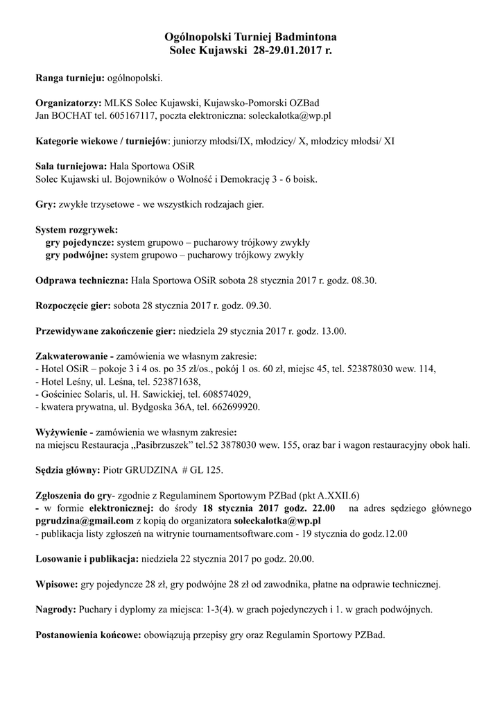 Ogólnopolski Turniej Badmintona Solec Kujawski 28-29.01.2017 r. Ranga turnieju: ogólnopolski. Organizatorzy: MLKS Solec Kujawski, Kujawsko-Pomorski OZBad Jan BOCHAT tel. 605167117, poczta elektroniczna: [email protected] Kategorie wiekowe / turniejów: juniorzy młodsi/IX, młodzicy/ X, młodzicy młodsi/ XI Sala turniejowa: Hala Sportowa OSiR Solec Kujawski ul. Bojowników o Wolność i Demokrację 3 - 6 boisk. Gry: zwykłe trzysetowe - we wszystkich rodzajach gier. System rozgrywek: gry pojedyncze: system grupowo – pucharowy trójkowy zwykły gry podwójne: system grupowo – pucharowy trójkowy zwykły Odprawa techniczna: Hala Sportowa OSiR sobota 28 stycznia 2017 r. godz. 08.30. Rozpoczęcie gier: sobota 28 stycznia 2017 r. godz. 09.30. Przewidywane zakończenie gier: niedziela 29 stycznia 2017 r. godz. 13.00. Zakwaterowanie - zamówienia we własnym zakresie: - Hotel OSiR – pokoje 3 i 4 os. po 35 zł/os., pokój 1 os. 60 zł, miejsc 45, tel. 523878030 wew. 114, - Hotel Leśny, ul. Leśna, tel. 523871638, - Gościniec Solaris, ul. H. Sawickiej, tel. 608574029, - kwatera prywatna, ul. Bydgoska 36A, tel. 662699920. Wyżywienie - zamówienia we własnym zakresie: na miejscu Restauracja „Pasibrzuszek” tel.52 3878030 wew. 155, oraz bar i wagon restauracyjny obok hali. Sędzia główny: Piotr GRUDZINA # GL 125. Zgłoszenia do gry- zgodnie z Regulaminem Sportowym PZBad (pkt A.XXII.6) - w formie elektronicznej: do środy 18 stycznia 2017 godz. 22.00 na adres sędziego głównego [email protected] z kopią do organizatora [email protected] - publikacja listy zgłoszeń na witrynie tournamentsoftware.com - 19 stycznia do godz.12.00 Losowanie i publikacja: niedziela 22 stycznia 2017 po godz. 20.00. Wpisowe: gry pojedyncze 28 zł, gry podwójne 28 zł od zawodnika, płatne na odprawie technicznej. Nagrody: Puchary i dyplomy za miejsca: 1-3(4). w grach pojedynczych i 1. w grach podwójnych. Postanowienia końcowe: obowiązują przepisy gry oraz Regulamin Sportowy PZBad.