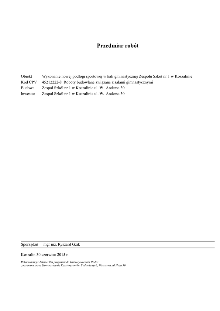Przedmiar robót Obiekt Kod CPV Budowa Inwestor Sporządził Wykonanie nowej podłogi sportowej w hali gminastycznej Zespołu Szkół nr 1 w Koszalinie 45212222-8 Roboty budowlane związane z salami gimnastycznymi Zespół Szkół nr 1 w Koszalinie ul. W. Andersa 30 Zespół Szkół nr 1 w Koszalinie ul. W. Andersa 30 mgr inż. Ryszard Gzik Koszalin 30 czerwiec 2015 r. " ekomendacja Jakości"dla programu do kosztorysowania Rodos R przyznana przez Stowarzyszenie Kosztorysantów Budowlanych, Warszawa, ul.Hoża 50 Rodos 7.0.6.6 [8415] Strona 2/3 Tabela przedmiaru robót Wykonanie nowej podłogi sportowej w hali gminastycznej Zespołu Szkół nr 1 w Koszalinie Nr Podstawa Nr ST Opis robót 1 Podłoga sportowa w hali ( pom.1.04 ) 1 KNR 2-02 Izolacja przeciwwilgociowa i przeciwwodna z folii polietylenowej szerokiej zgrzewanej 0607/02 2 Kalkulacja indywidualna 3 KNR 2-02 1110/04 Ułozenie legarów 4 KNR 0-21 4007/03 Ślepa podłoga z płyt OSB- 3 gr. 12 mm 5 KNR 2-02u2 1135/01 Posadzki z deszczułek posadzkowych układane na klej 6 KNR 2-02u2 1135/04 Lakierowanie posadzek 7 Kalkulacja indywidualna Malowanie linii sportowych 8 KNR 2-02 0607/02 Jm Ilość m2 970,780 kpl 1,000 m2 970,780 m2 970,780 m2 970,780 m2 970,780 kpl 1,000 m2 m2 73,150 73,150 m2 73,150 m2 73,150 m2 73,150 m2 73,150 m m 36,770 36,770 Ułożenie punktowo podlegarów na połączeniach legarów 2 Posadzka z gresów w pom. magazynowych ( pom. 1.05 , 1.27 i 1.30 ) Izolacja przeciwwilgociowa i przeciwwodna z folii polietylenowej szerokiej zgrzewanej 10,46+10,29+52,4 9 KNR 2-02 0609/03 razem Izolacje poziome na wierzchu konstrukcji jednowarstwowe z płyt styropianowych gr. 14 cm na sucho 10 KNR 2-02 1102/02 Warstwy wyrównawcze z zaprawy cementowej grubości 20mm pod posadzki zatarte na gładko razem gr. 8 cm 11 KNR 2-02 1102/03 Warstwy wyrównawcze pod posadzki - dodatek lub potrącenie za zmianę grubości o 10mm 12 KNR 2-02u2 2806/05.1 Posadzki jednobarwne z płytek kamionkowych GRES 30x30cm w pomieszczeniach o powierzchni ponad 10m2 na zaprawach klejowych ATLAS o grubości warstwy 5mm 13 KNR 2-02u2 2809/03.1 Cokoliki na zaprawach klejowych ATLAS z płytek kamionkowych GRES 15x15cm w pomieszczeniach o powierzchni ponad 10m2 11,85+4,25+0,13*2+0,26+4,51+5,75*2+(1,3+0,25+0,26+0,13*2)*2 razem Rodos 7.0.6.6 [8415] Spis działów przedmiaru robót Wykonanie nowej podłogi sportowej w hali gminastycznej Zespołu Szkół nr 1 w Koszalinie Nr Opis robót 1 Podłoga sportowa w hali ( pom.1.04 ) 2 Posadzka z gresów w pom. magazynowych ( pom. 1.05 , 1.27 i 1.30 ) Strona 3/3