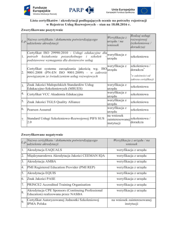 Lista certyfikatów / akredytacji podlegających ocenie na potrzeby rejestracji w Rejestrze Usług Rozwojowych – stan na 18.08.2016 r. Zweryfikowane pozytywnie L.p. Nazwa certyfikatu / dokumentu potwierdzającego udzielenie akredytacji Weryfikacja z urzędu / na wniosek Certyfikat ISO 29990:2010 - Usługi edukacyjne dla weryfikacja z 1. potrzeb kształcenia pozaszkolnego i szkoleń – urzędu podstawowe wymagania dla dostawców usług weryfikacja z Certyfikat systemu zarządzania jakością wg. ISO urzędu 2. 9001:2008 (PN-EN ISO 9001:2009) – w zakresie powiązanym ze świadczeniem usług rozwojowych Rodzaj usługi rozwojowej (szkoleniowa / doradcza) szkoleniowa szkoleniowa / doradcza* w zależności od zakresu certyfikacji * 3. Znak Jakości Małopolskich Standardów Usług Edukacyjno-Szkoleniowych (MSUES) 4. 5. 6. 7. weryfikacja z szkoleniowa urzędu weryfikacja z Certyfikat VCC Akademia Edukacyjna szkoleniowa urzędu weryfikacja z Znak Jakości TGLS Quality Alliance szkoleniowa urzędu weryfikacja z Pearson Assured szkoleniowa urzędu na wniosek Standard Usługi Szkoleniowo-Rozwojowej PIFS SUS zainteresowanej szkoleniowa / 2.0 doradcza instytucji Zweryfikowane negatywnie L.p. Nazwa certyfikatu / dokumentu potwierdzającego udzielenie akredytacji Weryfikacja z urzędu / na wniosek 1. Akredytacja EAQUALS weryfikacja z urzędu 2. Międzynarodowa Akredytacja Jakości CEEMAN IQA weryfikacja z urzędu 3. Akredytacja AMBA weryfikacja z urzędu 4. PMI Registered Education Provider (PMI REP) weryfikacja z urzędu 5. Akredytacja EQUIS weryfikacja z urzędu 6. Znak Jakości PASE weryfikacja z urzędu 7. PRINCE2 Accredited Training Organisation weryfikacja z urzędu 8. Akredytacja CPE Sponsors (Continuing Professional Education) realizowana przez NASBA 9. Certyfikat Autoryzowanej Jednostki Szkoleniowej IPMA Polska weryfikacja z urzędu na wniosek zainteresowanej instytucji 10. Certyfikat Systemu Zarządzania Bezpieczeństwem i Higieną Pracy – PN-N 18001/OHSAS 18001 Nowe! na wniosek zainteresowanej instytucji 11. Certyfikatu Systemu Zarządzania Środowiskowego – ISO 14001 (PN-EN ISO 14001) Nowe! na wniosek zainteresowanej instytucji