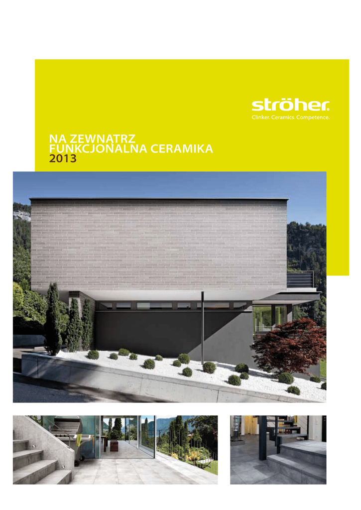 Na zewnątrz Funkcjonalna ceramika 2013 Spaltplat te – nasze dziedzict wo i tradycja Odkrywamy je na nowo, bez przerwy od 129 lat. Stawiamy na inżynierię Z kazdym rokiem rozwijamy 2 1884 1885 1886 1887 1888 1889 1890 1891 1892 1893 1894 · 129 lat tradycji ceramicznej · Specjalizacja w klinkierze ciągnionym i ceramicznych rozwiązaniach systemowych ·Różnorodność dodatków i kształtek · 25 lat gwarancji na mrozoodporność 1895 1896 1897 1898 1899 ceramiczną nowe obszary produktowe 1900 1901 3 Winner Pearl of ceramic 2012 2009 4 2010 2011 Oryginalne elementy – LOFTSTUFE® i LOFTSCHENKEL® TerioTec® X legendarny wymiar 40 x 80 cm Zeitlos – patynowane płytki klinkierowe. Elewacja klasy hightech. Ceramika budowlana w nowoczesnym, minimalistycznym stylu LOFT. Jedna z licznych typowych dla STRÖHER innowacji, które w swej prostocie i nowoczesnej ekspresji zrewolucjonizowały tradycyjny rynek stopni i wykończeń ceramicznych typu florentyńskiego. Dzięki nowatorskim rozwiązaniom technicznym uzyskano możliwość kompletnego dekorowania kantów elementów narożnych, co wcześniej nie było możliwe. Elementy ceramiczne w tym wymiarze stanowią prawdziwą innowację w swoim obszarze zastosowań. Dotychczas tak duży format znany był jako produkt betonowy lub z kamienia naturalnego. Ceramiczna nowość. Rustykalna ekspresja, techniczna doskonałość. Kamień milowy w energooszczędnych rozwiązaniach elewacyjnych. Rozwiązanie możliwe dotychczas przy zastosowaniu ciętych lic z cegieł typu handform. U nas w doskonałej jakości klinkieru ekstrudowanego. Dzięki nowatorskiej technologii ekspresja cegieł handform została przetransponowana na ceramiczne płytki elewacyjne z serii ZEITLOS. Banalnie prosty montaż stanowi dodatkowy atut tej serii produktów. Winner product of the year 2012 FLIESEN & PLATTEN readers‘ choice category tile 2012 2013 2013 TerioTec® X PROFILE Pełna ekspresja Glanzstücke – Retrolook w długim formacie LF 440 mm Płyty tarasowe 20 – pełnoceramiczny element o trapezowych wykończeniach krawędzi. Nad takim rozwiązaniem przemysł ceramiczny pracuje od dawna. Ceramika, która nie tylko optycznie i formatowo odpowiada pięknu kamienia naturalnego. Dzięki nowej metodzie glazurowania „ExtruTec Print“ powyższy efekt został w stopniu doskonałym osiągnięty. Dzięki nowatorskiej metodzie glazurowania, jaką jest „ExtruTec Print“ STRÖHER położył kolejny kamień milowy w dziedzinie ceramicznej innowacyjności. Super wąskie płytki elewacyjne w długim formacie. Oczywisty, modny Vintage – Look z efektem błysku, gry światła. Pomimo rustykalnego lica płytka pozostaje gładka co umożliwia fugowanie bez użycia kielni (szlamowanie). Dzięki długiemu formatowi oraz niepowtarzalnym refleksom świetlnym fasada odziaływuje jedyną w swoim rodzaju ekspresją. Keep it simpe – dzięki prostemu i trwałemu montażowi. Reinkarnacja produktu Keraplatte jako zewnętrznego elementu wielkoformatowego. Teraz jako produkt pełnomasowy, bez perforacji. Innowacyjna, trapezowa forma krawędzi czyni ten produkt dzięki technologii Extrutec® V-Edge Technology wyjątkowo odpornym na uszkodzenia krawędziowe i wyjątkowo łatwym w układaniu. Technologia Extrutec® Body umożliwia, pomimo grubości 20 mm uzyskanie optymalnych cech wytrzymałościowych. 5 zeitlos Glanzstücke keravette® keraprotect® Kerabig® Zalety płytek elewacyjnych STRÖHER: ·Różnorodność kolorów i formatów umożliwia indywidualne rozwiązania ścian i fasady. · Optymalna ochrona ściany przed warunkami atmosferycznymi jak również dożywotnia ochrona budynku poprzez minimalną absorbcję wody. · W powiązaniu z systemem ocieplającym - obniżka kosztów eksploatacji. · Łatwa i szybka obróbka i równomierna fuga dzięki nowoczesności wykonania. ·Markowa jakość jednego z przedujących producentów w Niemczech. 6 7 Klinkierowe, pat ynowane pły tki elewacyjne klasy hightech. Ceramika klasy premium zeitlos Archaiczna ekspresja w połączeniu z łatwością montażu. Wygląd muru z cegły licowej. kcyjny wia atra Umożli rmatów : mix fo rokiego z o, sze łu d gieg ryglowym – m te a form i wąskim długim Wypalanie w piecu tunelowym 8 Mrozoodporność 25 lat gwarancji* Nadają się na izolacje termiczne Odporne na warunki atmosferyczne Ekonomiczne Zgodność z normami Barwy odporne na działanie światła Łatwe w utrzymaniu i higieniczne Nieszkodliwe dla środowiska Odporne na chemikalia Żaroi ognioodporne Antystatyczne ZEITLOS nieszkliwiona 351 kalkbrand NF 354 bronzebruch Długi format Format ryglowy 359 kohleglanz NF NF 352 kupferschmelz Długi format Format ryglowy NF 357 backstein NF Długi format 353 eisenrost Format ryglowy 355 sandschmelz NF Długi format NF Długi format Format ryglowy 356 erdfeuer Format ryglowy NF 237 austerrauch NF Długi format Format ryglowy ługiego Obok d x 71 mm 0 0 4 formatu pny też dostę y ryglow format mm. 5 400 x 3 Archaiczne. Technicznie doskonałe. Korzystne energetycznie. autentyczne kolory natury: efekt redukcji/utlenienia załamane krawędzie Ekspresja cegły elewacyjnej. Optyka cegieł typu handform przeżywa swój renesans. Efekt można uatrakcyjnić kombinacją różnych formatów na tej samej elewacji. Dwa długie formaty (w tym ryglowy): 400 x 71 mm i 400 x 35 mm w połączeniu z formatem NF 240 x 71 mm dają nieograniczoną możliwość wariantów ich jednoczesnego mieszania na elewacji. Atrakcyjny efekt można jeszcze uwydatnić stosująć różną kolorystykę płytek oraz różną szerokość fug. Modny efekt wizualny elewacji typu handform to oczywiście nie wszystko, dochodzą tu także takie atuty jak łatwość układania, trwałość i łatwość pielęgnacji oraz element mający obecnie szczególnie duże znaczenie – energooszczędność. strukturyzowana i patynowana powierzchnia Full-Body: przebarwiony czerep 9 Retro – pły tka elewacyjna z efek tem połysku. Wyjątkowo wąska w długim fo