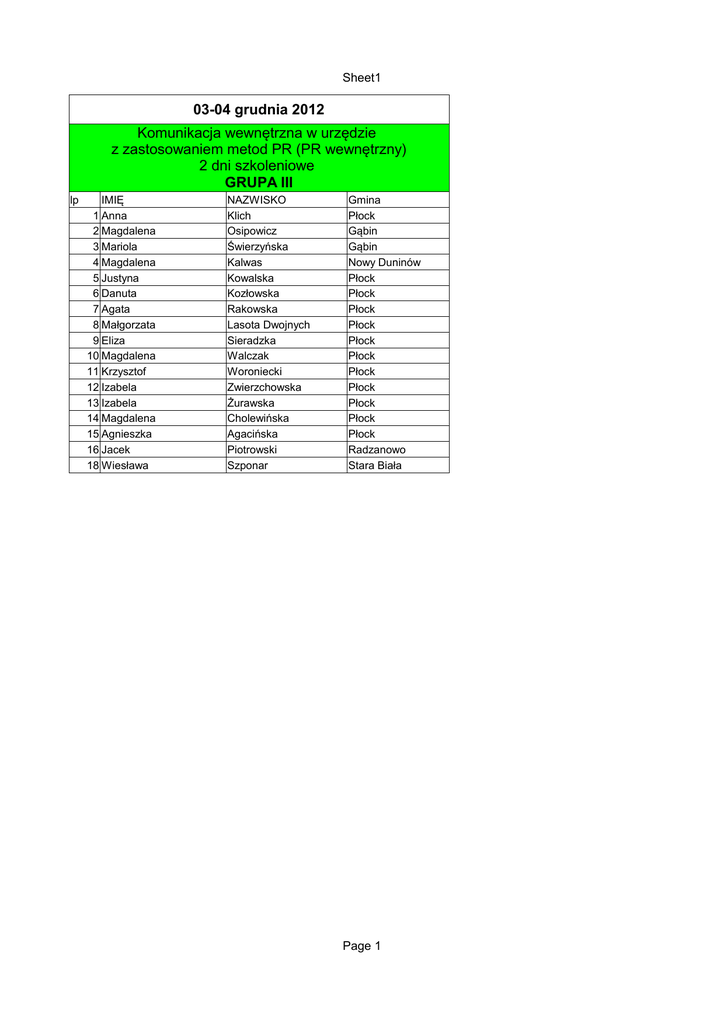 Sheet1 03-04 grudnia 2012 Komunikacja wewnętrzna w urzędzie z zastosowaniem metod PR (PR wewnętrzny) 2 dni szkoleniowe GRUPA III lp IMIĘ 1 Anna 2 Magdalena 3 Mariola 4 Magdalena 5 Justyna 6 Danuta 7 Agata 8 Małgorzata 9 Eliza 10 Magdalena 11 Krzysztof 12 Izabela 13 Izabela 14 Magdalena 15 Agnieszka 16 Jacek 18 Wiesława NAZWISKO Klich Osipowicz Świerzyńska Kalwas Kowalska Kozłowska Rakowska Lasota Dwojnych Sieradzka Walczak Woroniecki Zwierzchowska Żurawska Cholewińska Agacińska Piotrowski Szponar Gmina Płock Gąbin Gąbin Nowy Duninów Płock Płock Płock Płock Płock Płock Płock Płock Płock Płock Płock Radzanowo Stara Biała Page 1