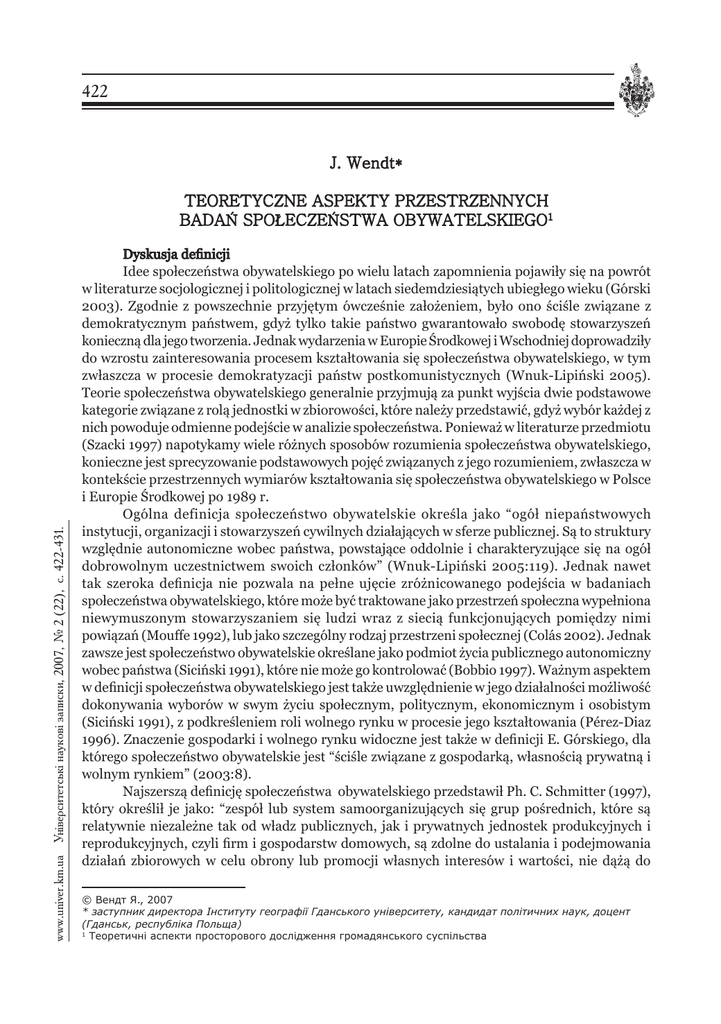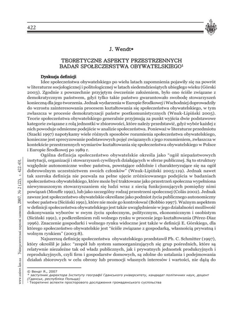 422 J. Wendt* www.univer.km.ua Óí³âåðñèòåòñüê³ íàóêîâ³ çàïèñêè, 2007, ¹ 2 (22), ñ. 422-431. TEORETYCZNE ASPEKTY PRZESTRZENNYCH BADAŃ SPOŁECZEŃSTWA OBYWATELSKIEGO1 Dyskusja definicji Idee społeczeństwa obywatelskiego po wielu latach zapomnienia pojawiły się na powrót w literaturze socjologicznej i politologicznej w latach siedemdziesiątych ubiegłego wieku (Górski 2003). Zgodnie z powszechnie przyjętym ówcześnie założeniem, było ono ściśle związane z demokratycznym państwem, gdyż tylko takie państwo gwarantowało swobodę stowarzyszeń konieczną dla jego tworzenia. Jednak wydarzenia w Europie Środkowej i Wschodniej doprowadziły do wzrostu zainteresowania procesem kształtowania się społeczeństwa obywatelskiego, w tym zwłaszcza w procesie demokratyzacji państw postkomunistycznych (Wnuk-Lipiński 2005). Teorie społeczeństwa obywatelskiego generalnie przyjmują za punkt wyjścia dwie podstawowe kategorie związane z rolą jednostki w zbiorowości, które należy przedstawić, gdyż wybór każdej z nich powoduje odmienne podejście w analizie społeczeństwa. Ponieważ w literaturze przedmiotu (Szacki 1997) napotykamy wiele różnych sposobów rozumienia społeczeństwa obywatelskiego, konieczne jest sprecyzowanie podstawowych pojęć związanych z jego rozumieniem, zwłaszcza w kontekście przestrzennych wymiarów kształtowania się społeczeństwa obywatelskiego w Polsce i Europie Środkowej po 1989 r. Ogólna definicja społeczeństwo obywatelskie określa jako “ogół niepaństwowych instytucji, organizacji i stowarzyszeń cywilnych działających w sferze publicznej. Są to struktury względnie autonomiczne wobec państwa, powstające oddolnie i charakteryzujące się na ogół dobrowolnym uczestnictwem swoich członków” (Wnuk-Lipiński 2005:119). Jednak nawet tak szeroka definicja nie pozwala na pełne ujęcie zróżnicowanego podejścia w badaniach społeczeństwa obywatelskiego, które może być traktowane jako przestrzeń społeczna wypełniona niewymuszonym stowarzyszaniem się ludzi wraz z siecią funkcjonujących pomiędzy nimi powiązań (Mouffe 1992), lub jako szczególny rodzaj przestrzeni społecznej (Colás 2002). Jednak zawsze jest społeczeństwo obywatelskie określane jako podmiot życia publicznego autonomiczny wobec państwa (Siciński 1991), które nie może go kontrolować (Bobbio 1997). Ważnym aspektem w definicji społeczeństwa obywatelskiego jest także uwzględnienie w jego działalności możliwość dokonywania wyborów w swym życiu społecznym, politycznym, ekonomicznym i osobistym (Siciński 1991), z podkreśleniem roli wolnego rynku w procesie jego kształtowania (Pérez-Diaz 1996). Znaczenie gospodarki i wolnego rynku widoczne jest także w definicji E. Górskiego, dla którego społeczeństwo obywatelskie jest “ściśle związane z gospodarką, własnością prywatną i wolnym rynkiem” (2003:8). Najszerszą definicję społeczeństwa obywatelskiego przedstawił Ph. C. Schmitter (1997), który określił je jako: “zespół lub system samoorganizujących się grup pośrednich, które są relatywnie niezależne tak od władz publicznych, jak i prywatnych jednostek produkcyjnych i reprodukcyjnych, czyli firm i gospodarstw domowych, są zdolne do ustalania i podejmowania działań zbiorowych w celu obrony lub promocji własnych interesów i wartości, nie dążą do © Вендт Я., 2007 * заступник директора Інституту географії Гданського університету, кандидат політичних наук, доцент (Гданськ, республіка Польща) 1 Теоретичні аспекти просторового дослідження громадянського суспільства 423 Óí³âåðñèòåòñüê³ íàóêîâ³ çàïèñêè, 2007, ¹ 2 (22), ñ. 422-431 www.univer.km.ua zastąpienia instytucji państwowych i prywatnych producentów ani też nie starają się przejąć odpowiedzialności za rządzenie całą sferą publiczną oraz zgadzają się działać w ramach uprzednio ustalonych, “cywilnych” reguł, nakazujących wzajemny szacunek” (cyt. za Wnuk-Lipiński 2005:120). Społeczeństwo obywatelskie na potrzeby badań najczęściej utożsamiane jest z tak zwanym trzecim sektorem, który w odróżnieniu od pierwszego obejmującego rynek, czyli podmioty i cele prywatne, drugiego obejmującego rząd, gdzie podmioty i cele są publiczne, obejmuje podmioty prywatne, gdy cele pozostają publiczne (Szacki 1997:57). Podział ten wymaga dodatkowego objaśnienia i doprecyzowania ze względu na złożony charakter współczesnych społeczeństw cechujących tak wysokim stopniem różnorodności, iż nie znajdziemy wśród nich w społeczeństwa pełni odpowiadającego podanym przez J. Szackiego warunkom (Wnuk-Lipiński 2005:120) Biorąc pod uwagę powyższe definicje społeczeństwa obywatelskiego, a jednocześnie dla uniknięcia niejasności terminologicznych, pod pojęciem społeczeństwa obywatelskiego będą rozumiane “samoorganizujące się grupy społeczne i instytucje powstające niezależnie od państwa i mające na celu odbudowanie autonomicznej przestrzeni społecznej w komunistycznym państwie” (Szlachta 2004:1286). Zarys rozwoju koncepcji społeczeństwa obywatelskiego Z konieczności przedstawiona jedynie w zarysie idea społeczeństwa obywatelskiego wywodzi się z klasycznej tradycji republikańskiej i następnie przejęta została przez rozwijający się liberalizm. W tradycji republikańskiej jej początki sięgają starożytnej Grecji, gdzie możemy odnaleźć ją w pracach Arystotelesa jako wspólnotę polityczną “koinonia politike” (Arystoteles 2001:194), której odpowiada w filozofii starożytnego Rzymu pojęcie “societas civilis”, opisujące u Cycerona ład społeczny republiki (Szlachta 2004). Idea społeczeństwa obywatelskiego przejęta została przez my